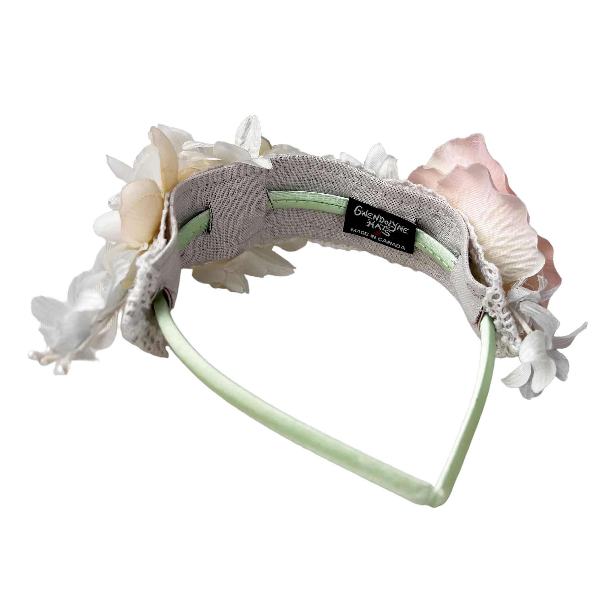 The rose flowers I make are both unique and magical as I sew petal by petal around an antique button to make them. The base of the hairband is a white linen band which slides over the band 12.5" covered base.