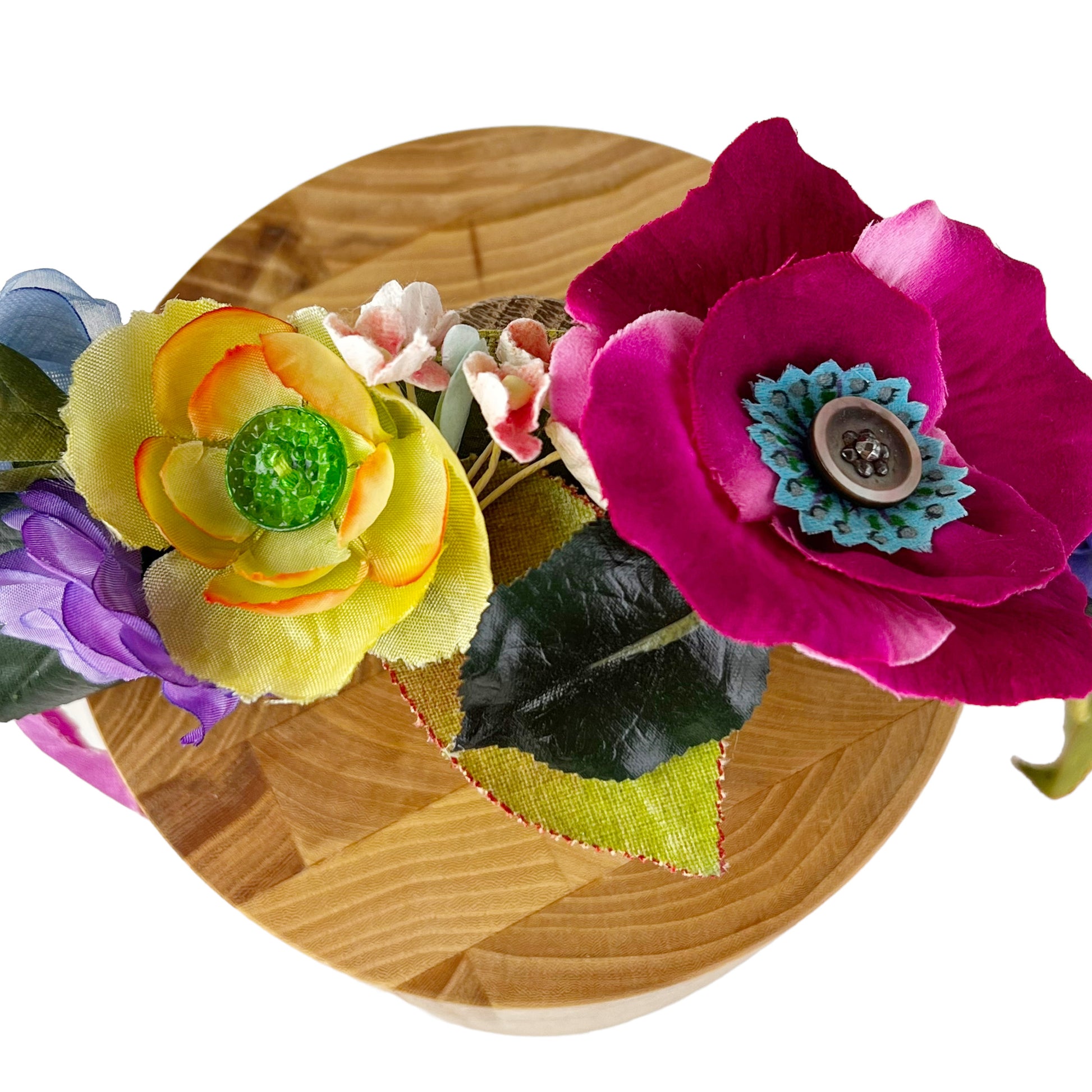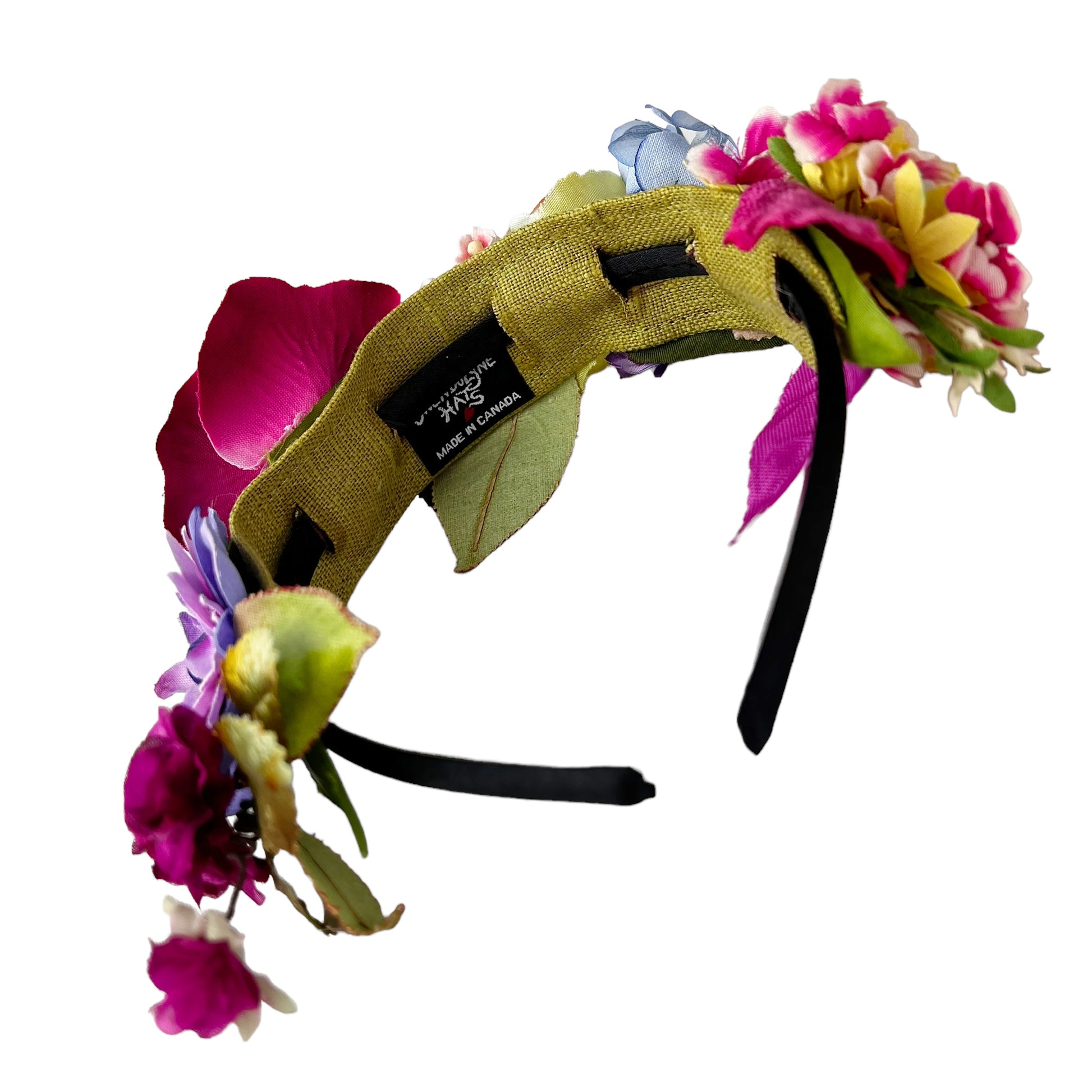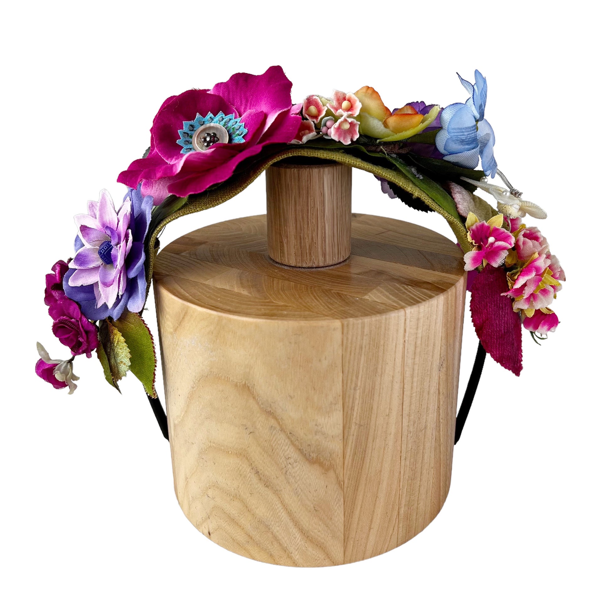 This one of a kind vibrant pink rose flower wreath tiaras hair headband has an array of hand sewn flowers and leaves. I have added vintage silk and paper flowers. The rose flowers I make are both unique and magical. Each one I hand sew petal by petal around an antique button from the 1890 era.