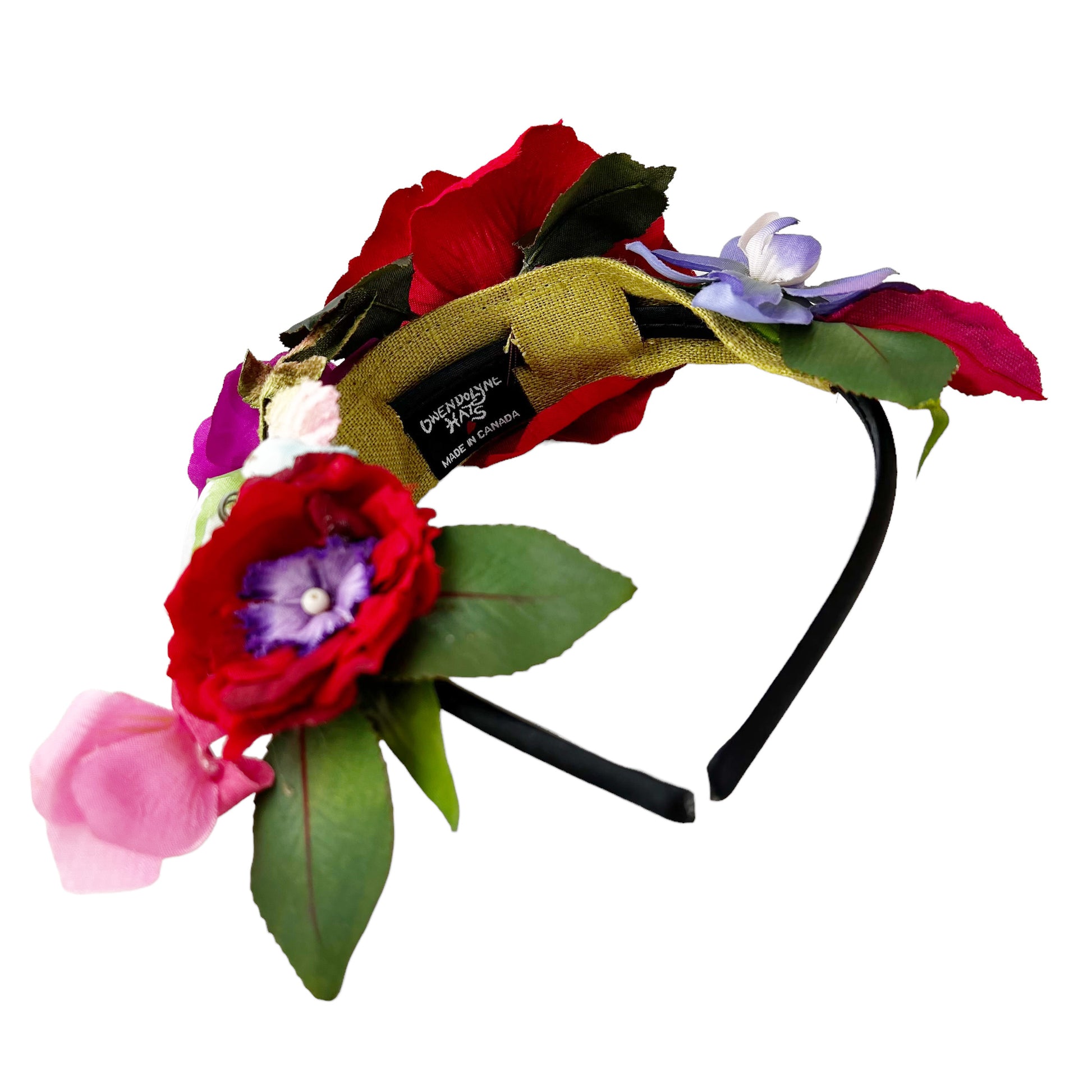 This one of a kind vibrant red rose flower wreath tiaras hair headband has an array of hand sewn flowers and leaves. I have added vintage silk and paper flowers. The rose flowers I make are both unique and magical. Each one I hand sew petal by petal around an antique button from the 1890 era.
