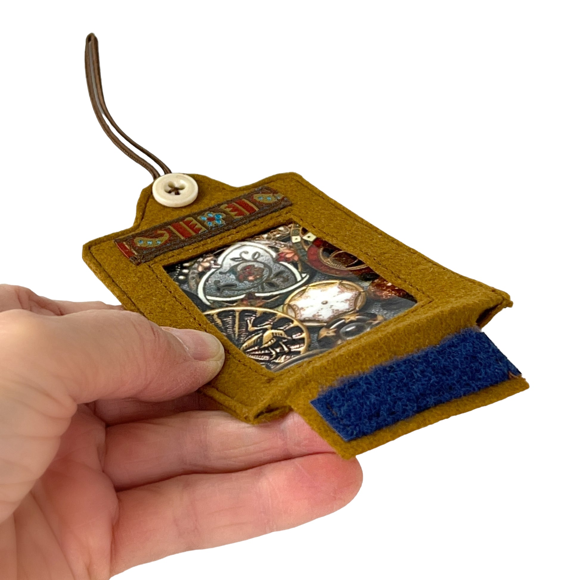This felt frame is made from a sturdy 100% merino wool felt that is sewn and decorated with ribbon and a antique Mother of Pearl button. The laminated card of the antique button is the template (2  7/16" wide by 3  10/16") for you to use for trimming the photo is so wish to insert inside. The bottom openings have a velcro closure to open and close.