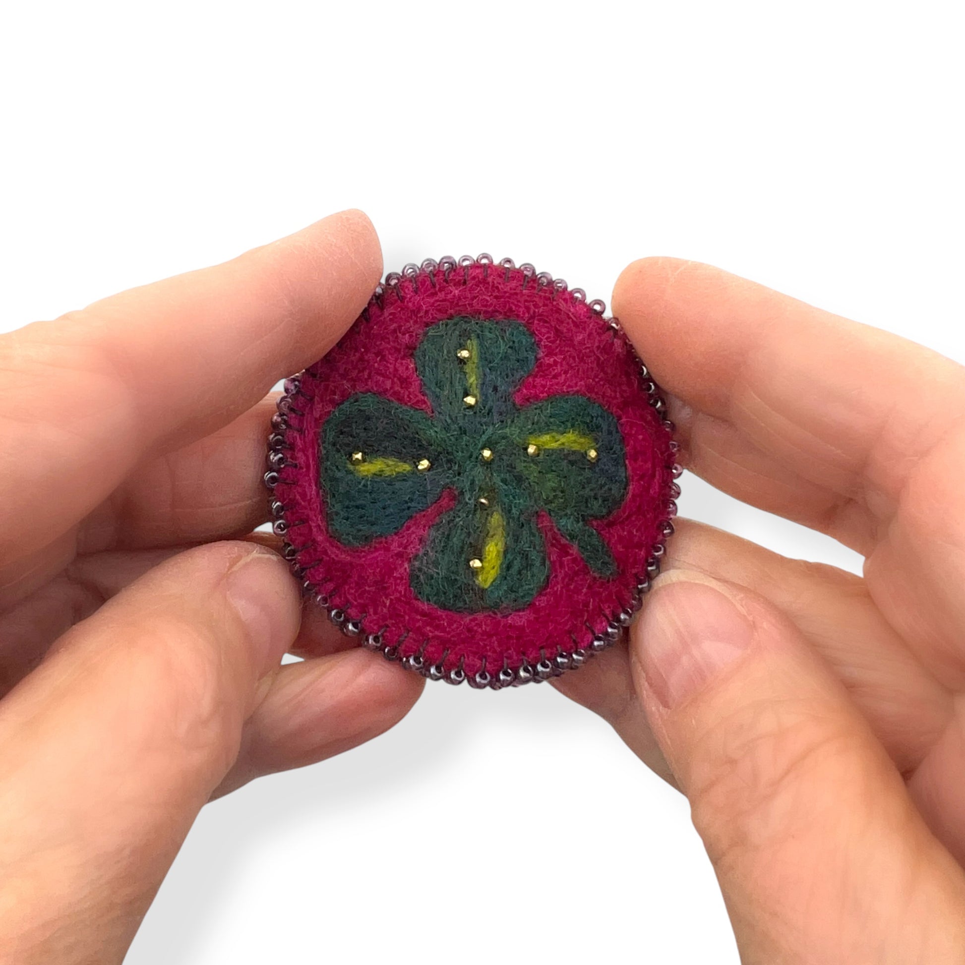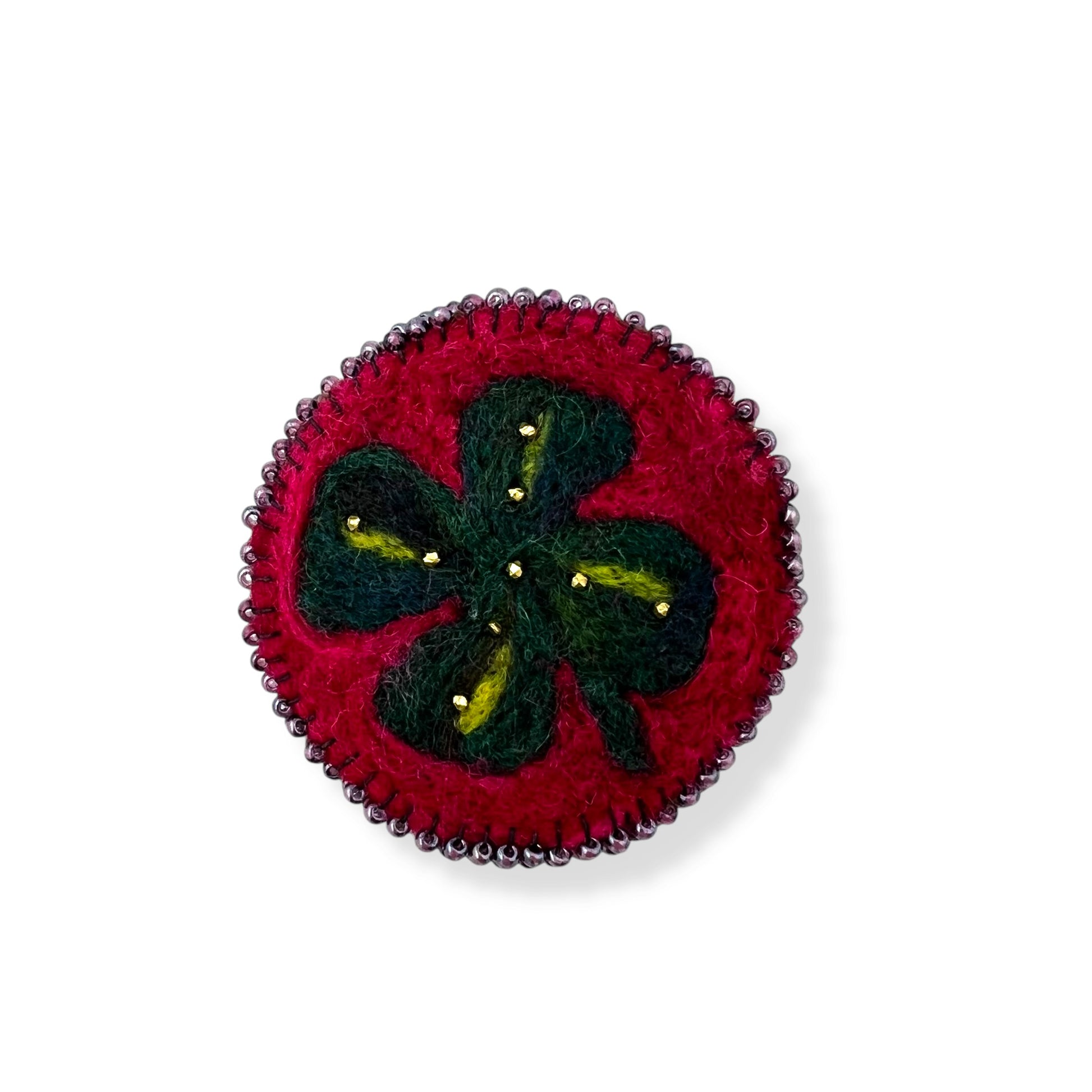 This green and red Shamrock Leaf Brooch was needle felted with an assortment of wool fleece colours. Embellished with 9 brass beads ion the leaf. A great pin for some good luck and a fabulous pin for Saint Patricks Day.