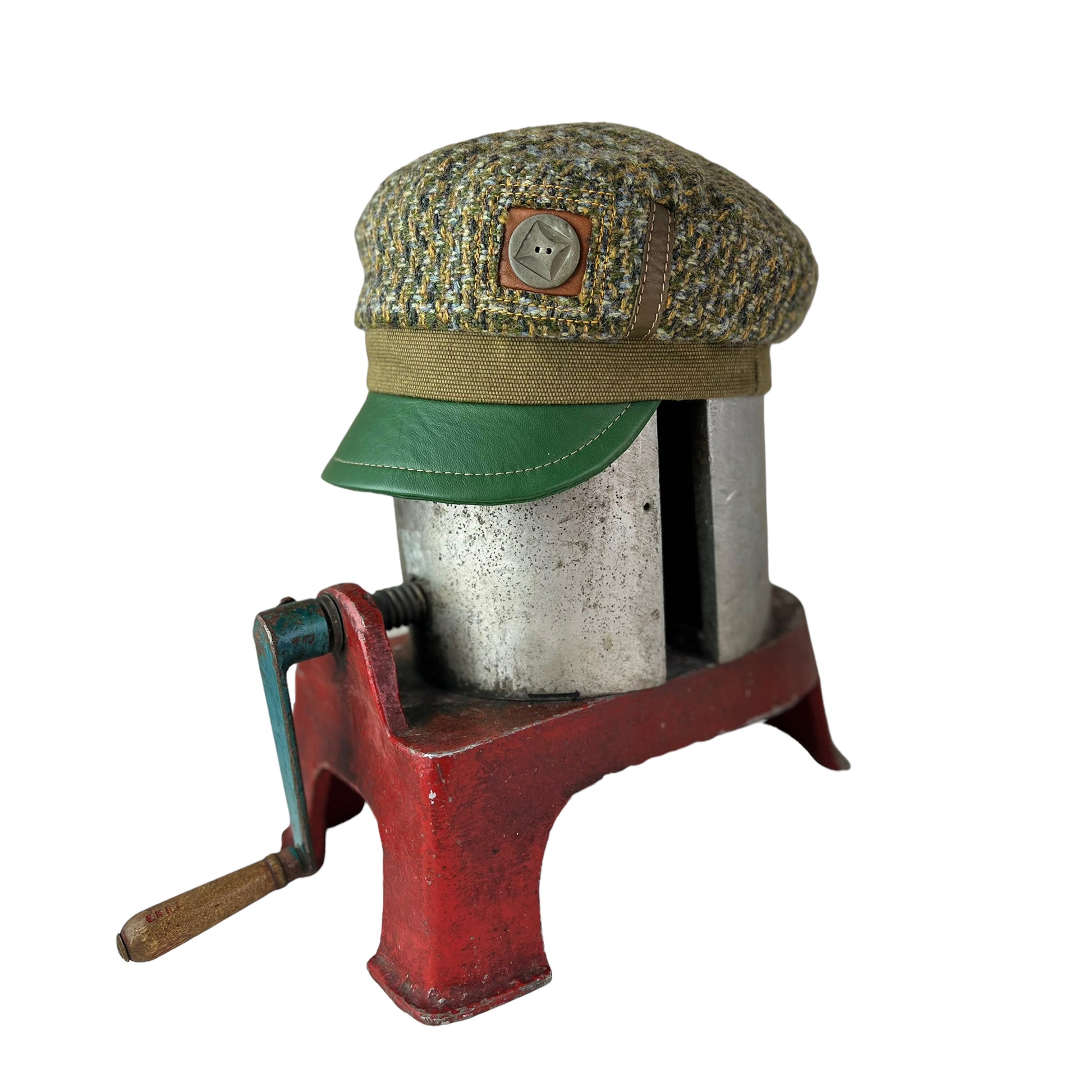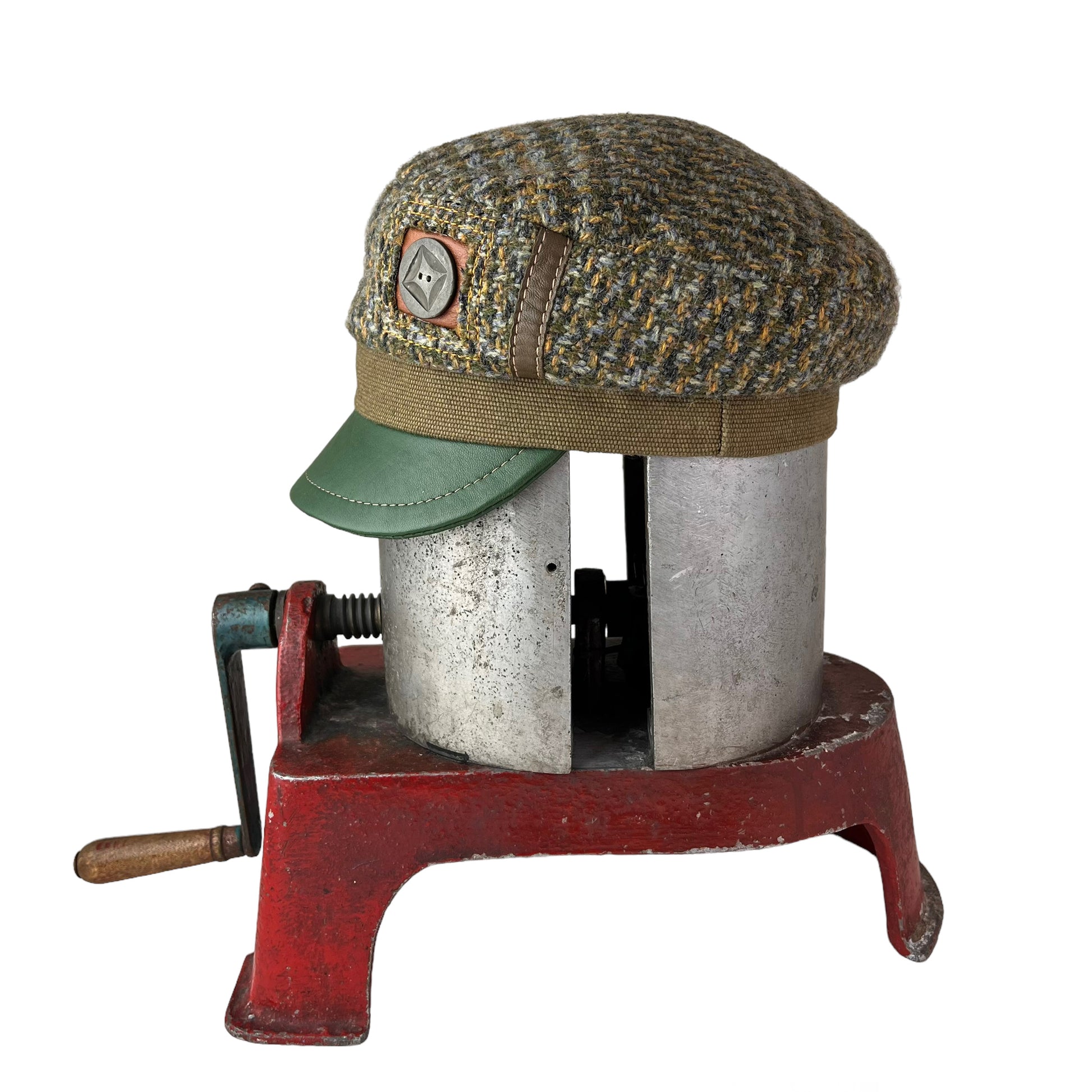 The outside of this hat has been hand cut from a wool green gold herringbone wool weave. The band is made from a strong basket weave cotton. I hand cut my peak from green lamb leather and reinforce it with a leather board inside, then finish it off by top stitching on my leather machine. This antique celluloid button was chosen for this cap is from the 1920s