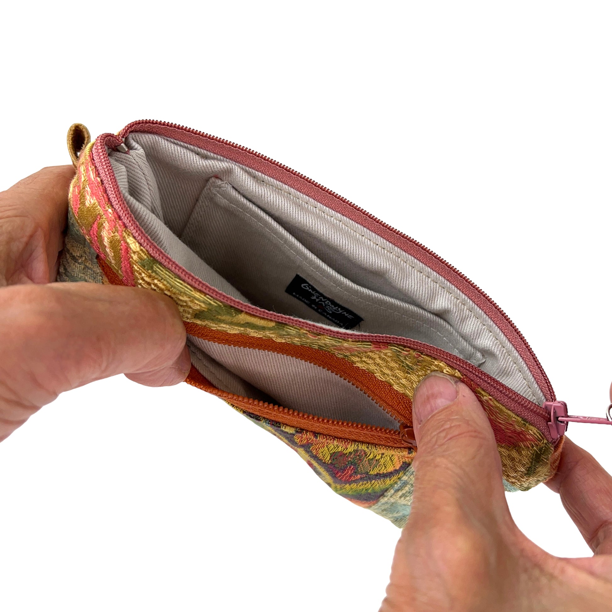 This one of a kind small magical yellow green orange zipper wallet purse has been cut from a selection of exquisite tapestries creating its one of a kind patchwork wallet purse.