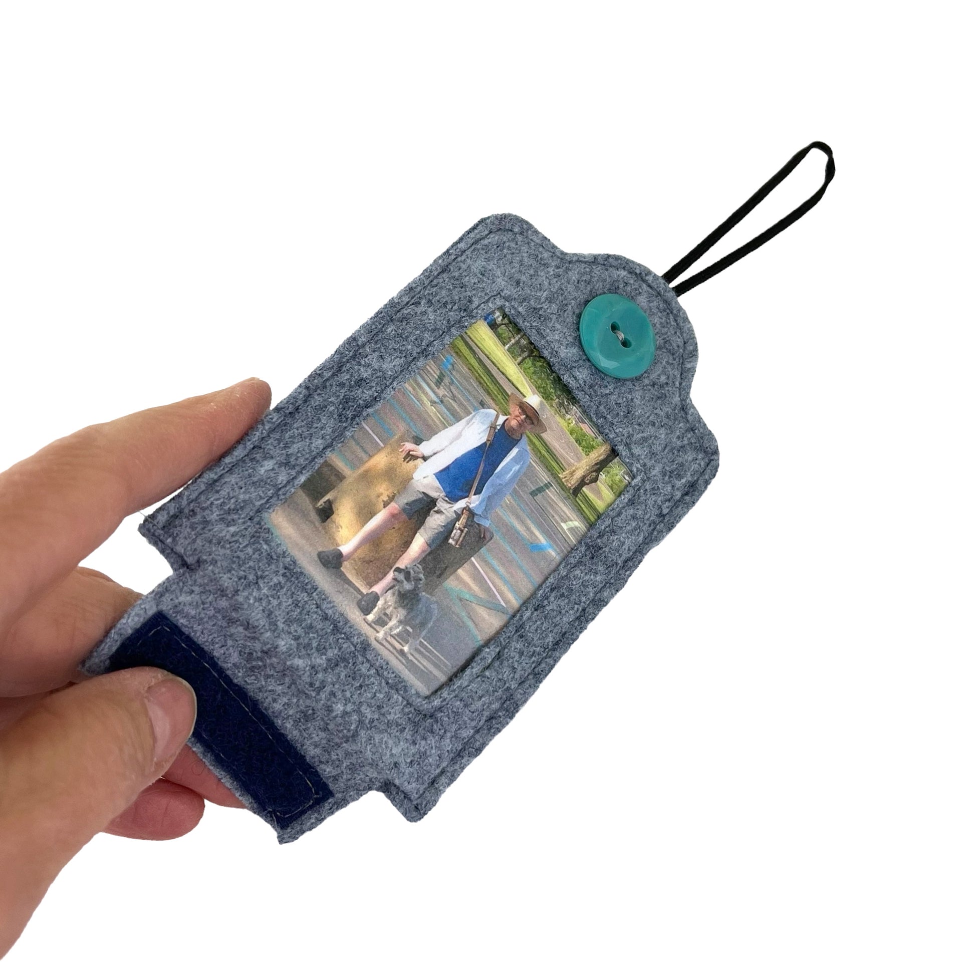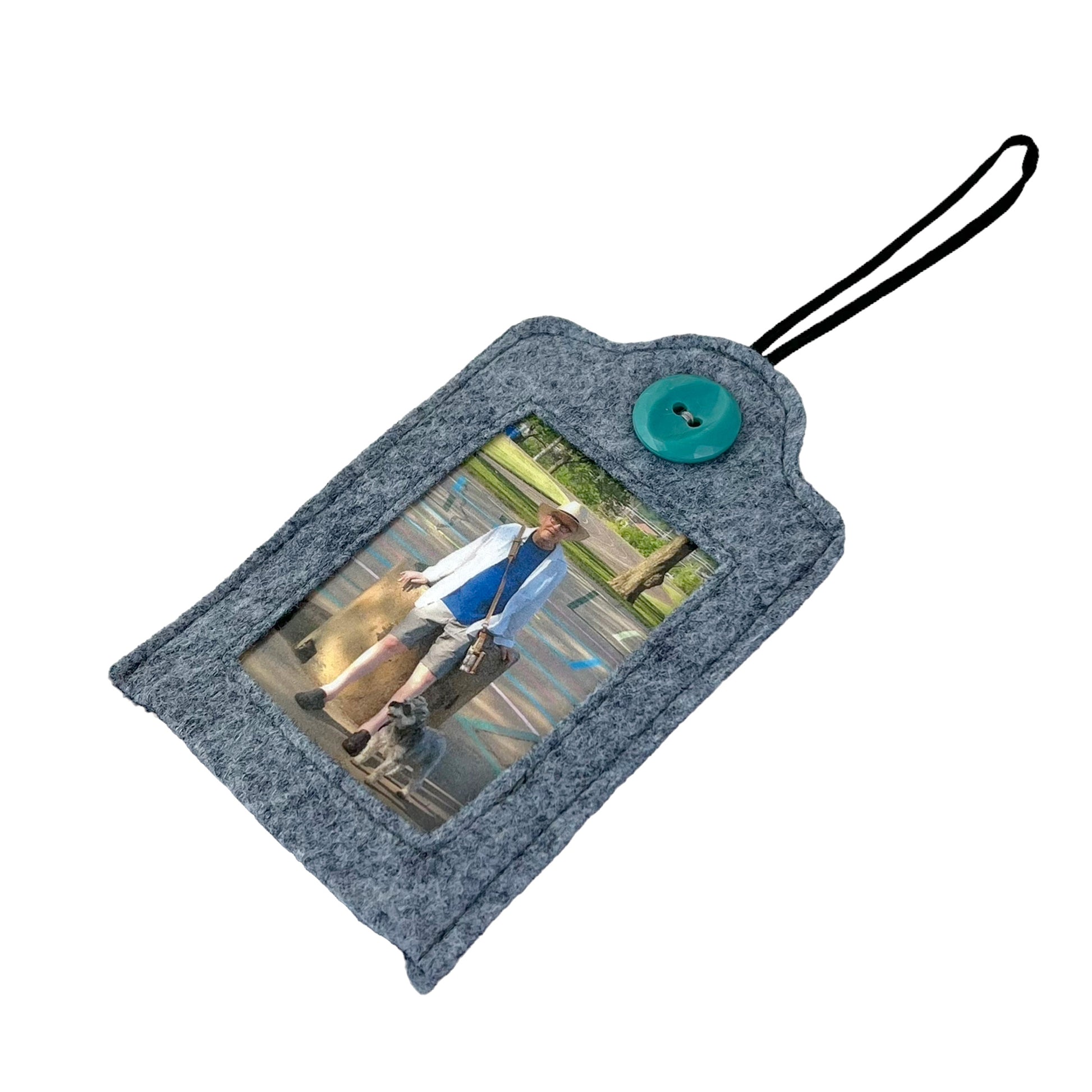 This grey frame is made from a sturdy 100% wool felt that is sewn and decorated with a vintage turquoise plastic button from the early 1950s. The laminated card  is the template (2  7/16" wide by 3  10/16") for you to use for trimming the photo is so wish to insert inside. The bottom openings have a Velcro closure to open and close.