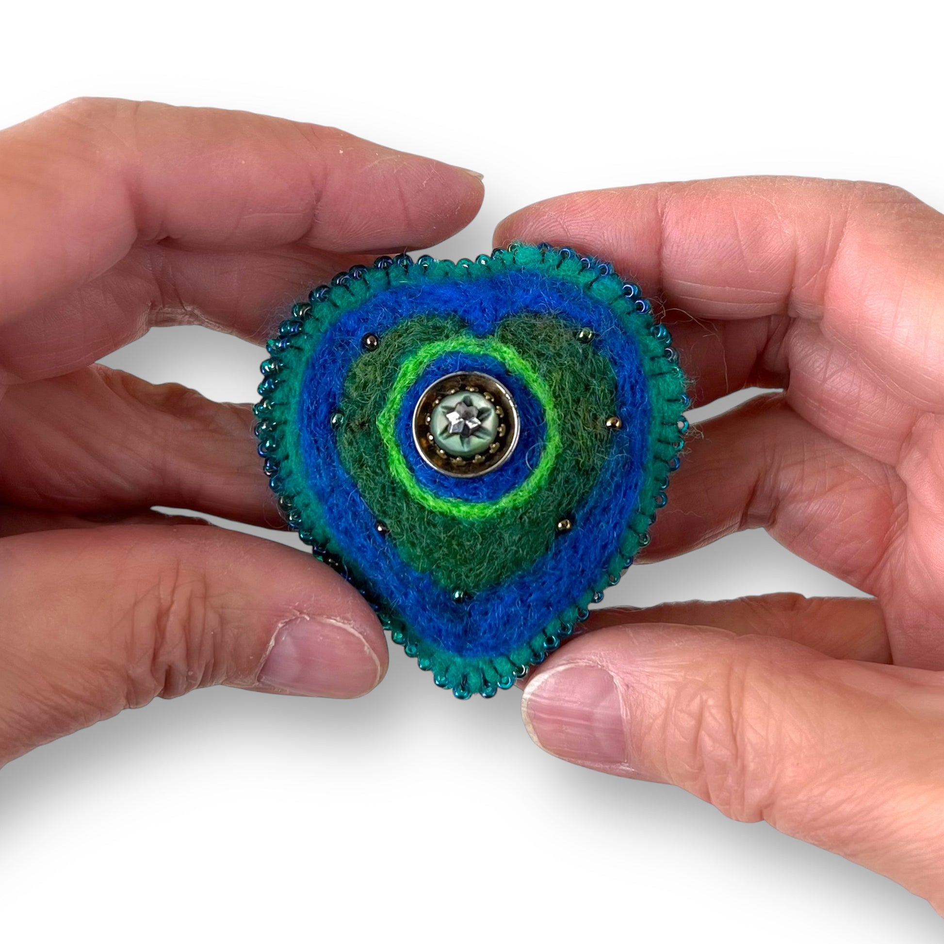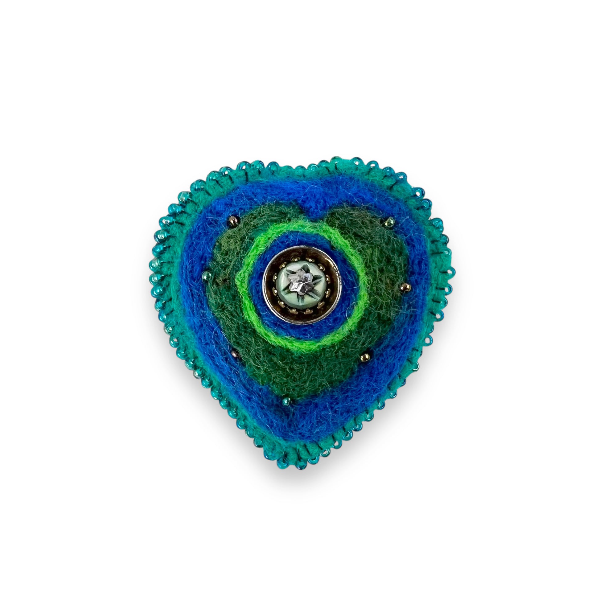This blue green heart felted brooch pin is the twenty fourth brooch I created, edition #24.