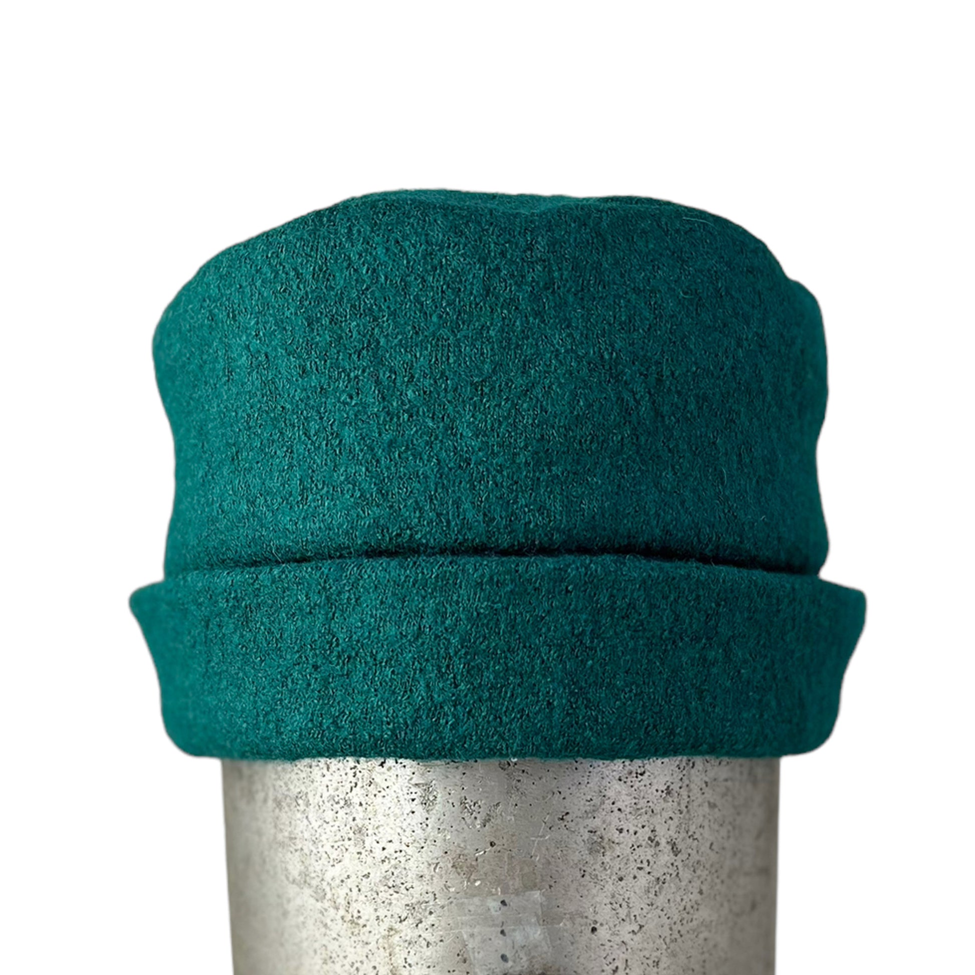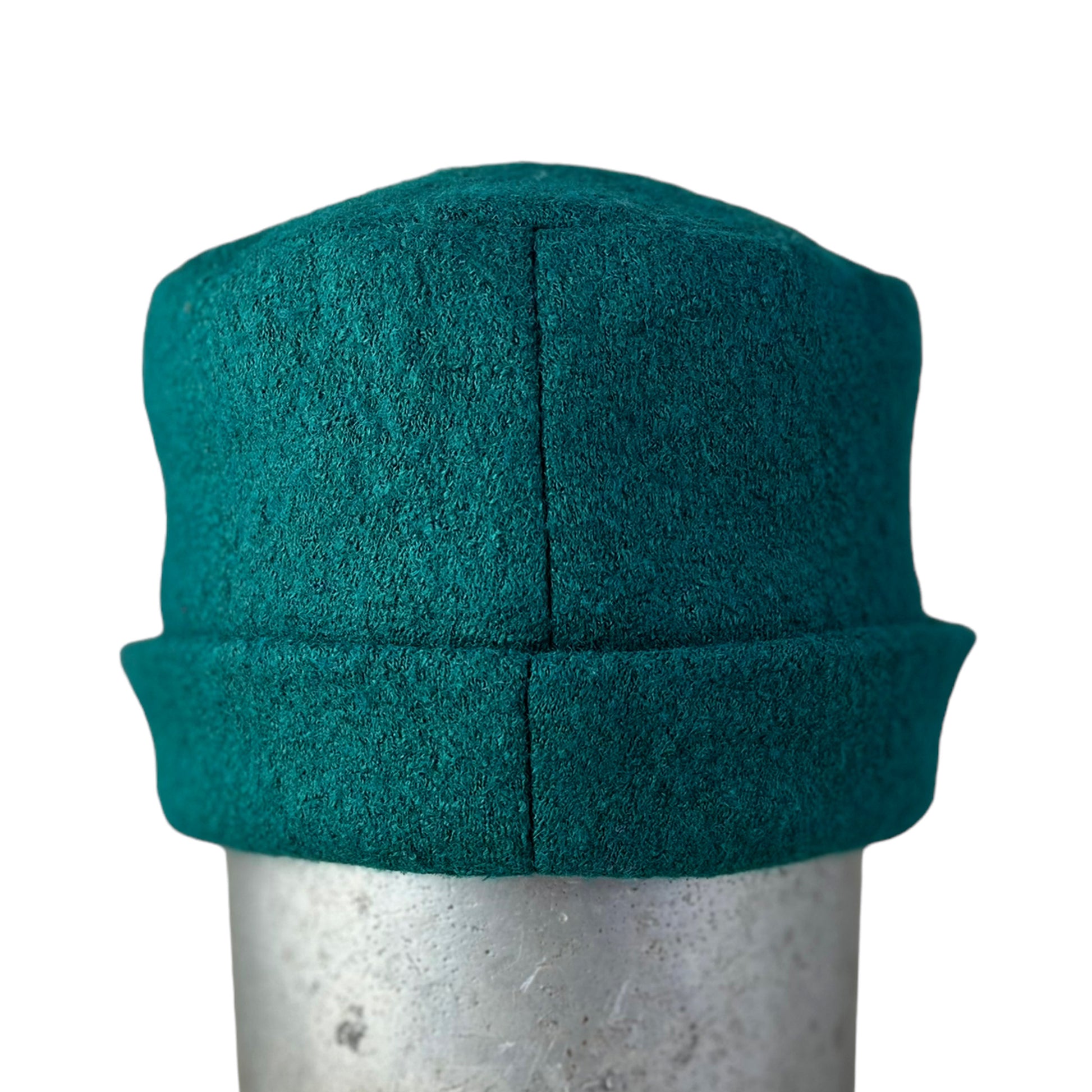This large emerald green stylish winter sewn pill box style hat is hand cut and sewn from boiled a wool knit.
