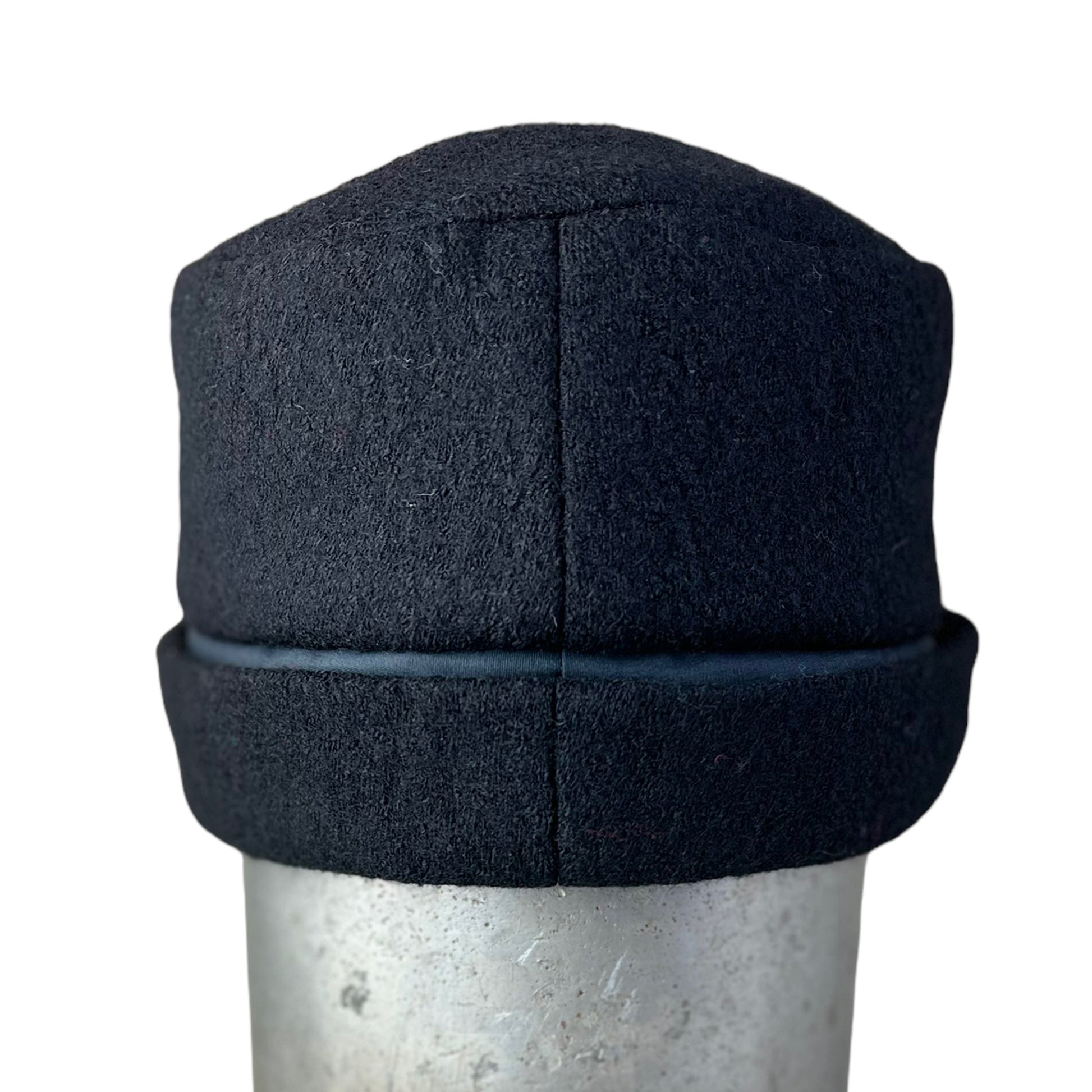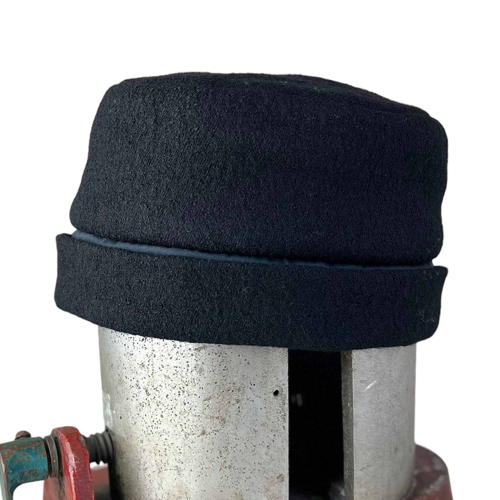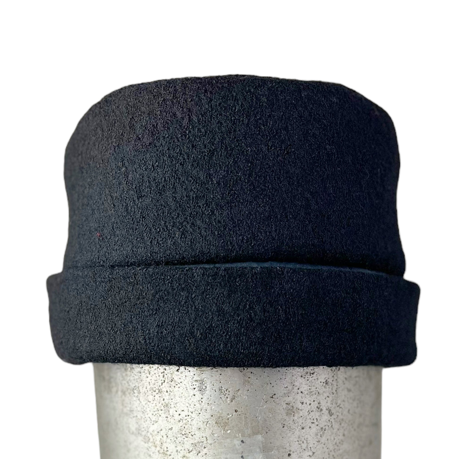 This large black stylish winter sewn pill box style hat is hand cut and sewn from boiled a wool knit.