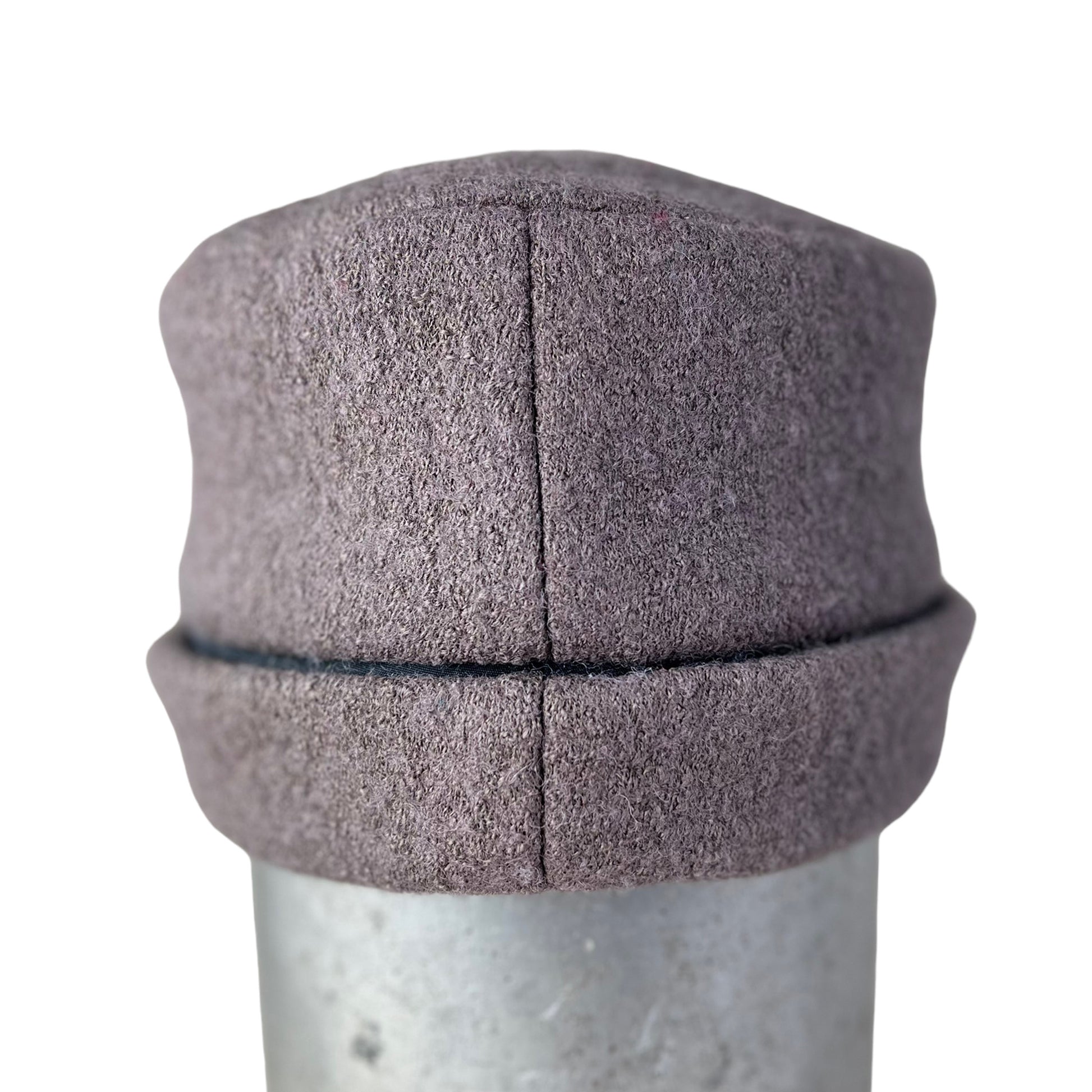 This large taupe stylish winter sewn pill box style hat is hand cut and sewn from boiled a wool knit.