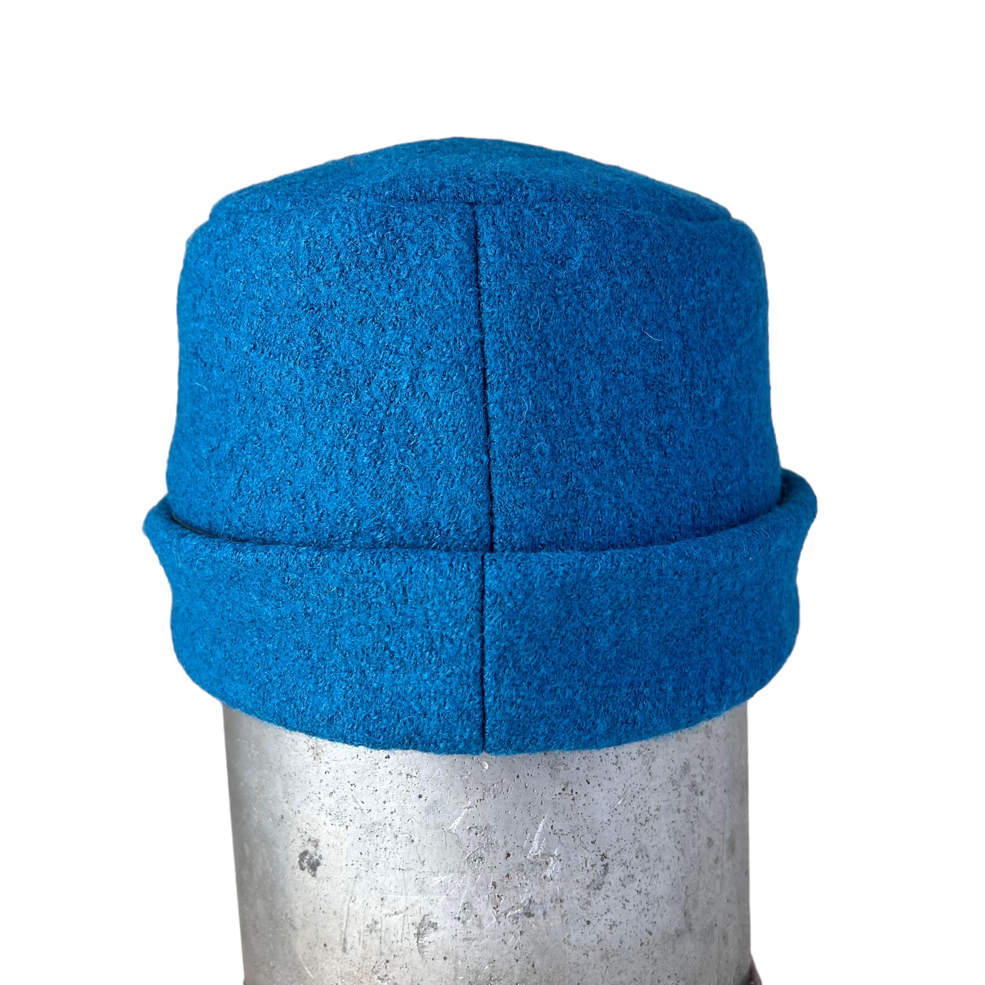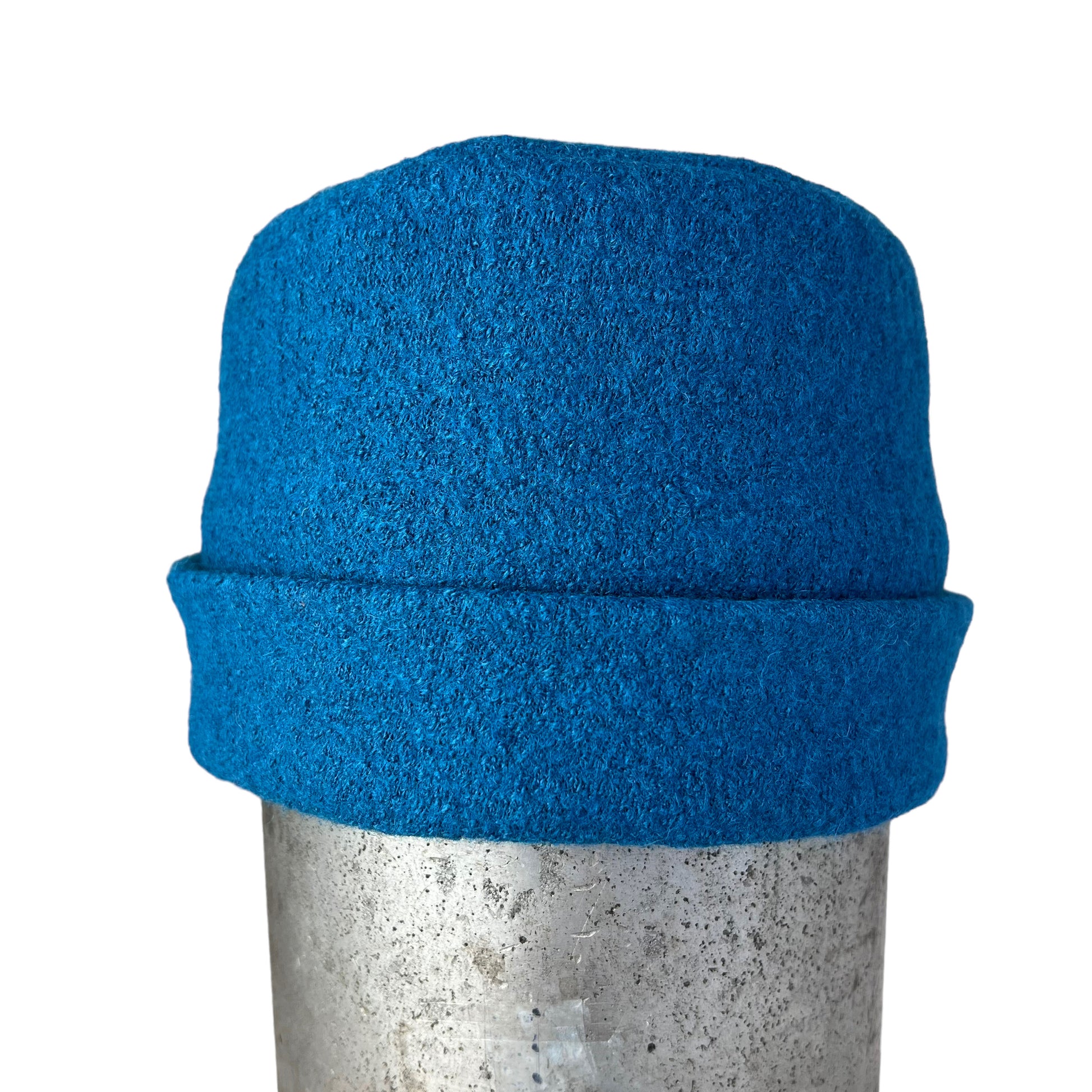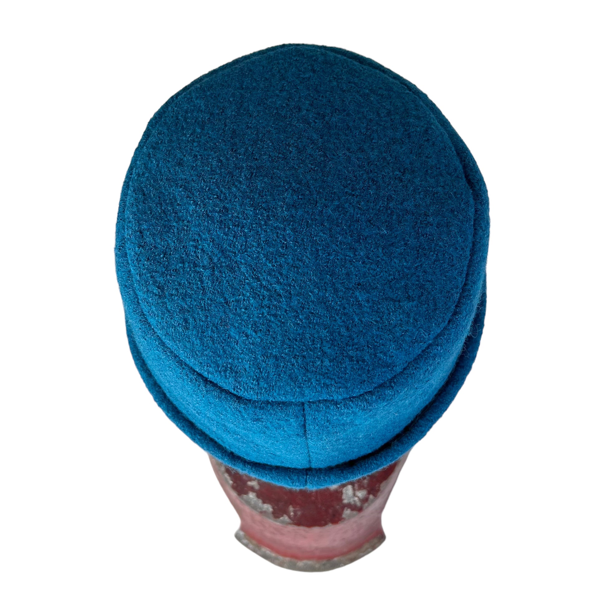 This plain turquoise blue stylish winter sewn pill box style hat is hand cut and sewn from boiled a wool knit.