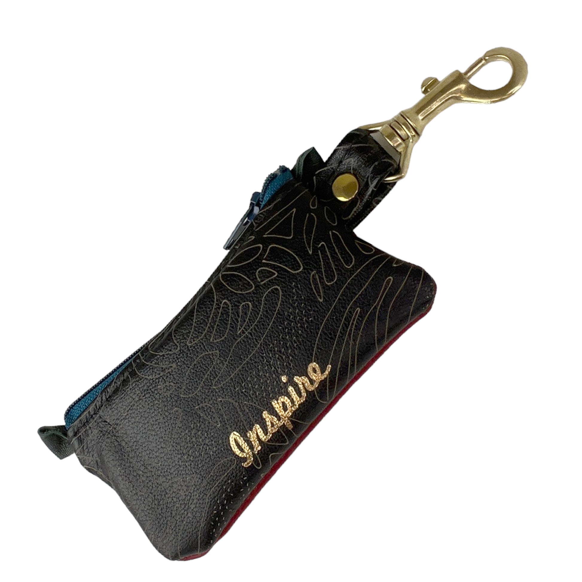 This "Inspire" attachable zipper Positive change and card purse is made from hand cut lamb leather that has been embossed with gold leaf. Each one is unique with it's own color combination. Made to attach to ones key ring.