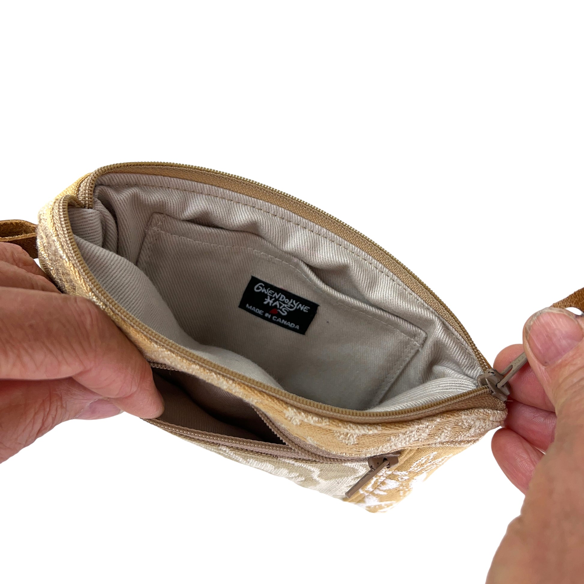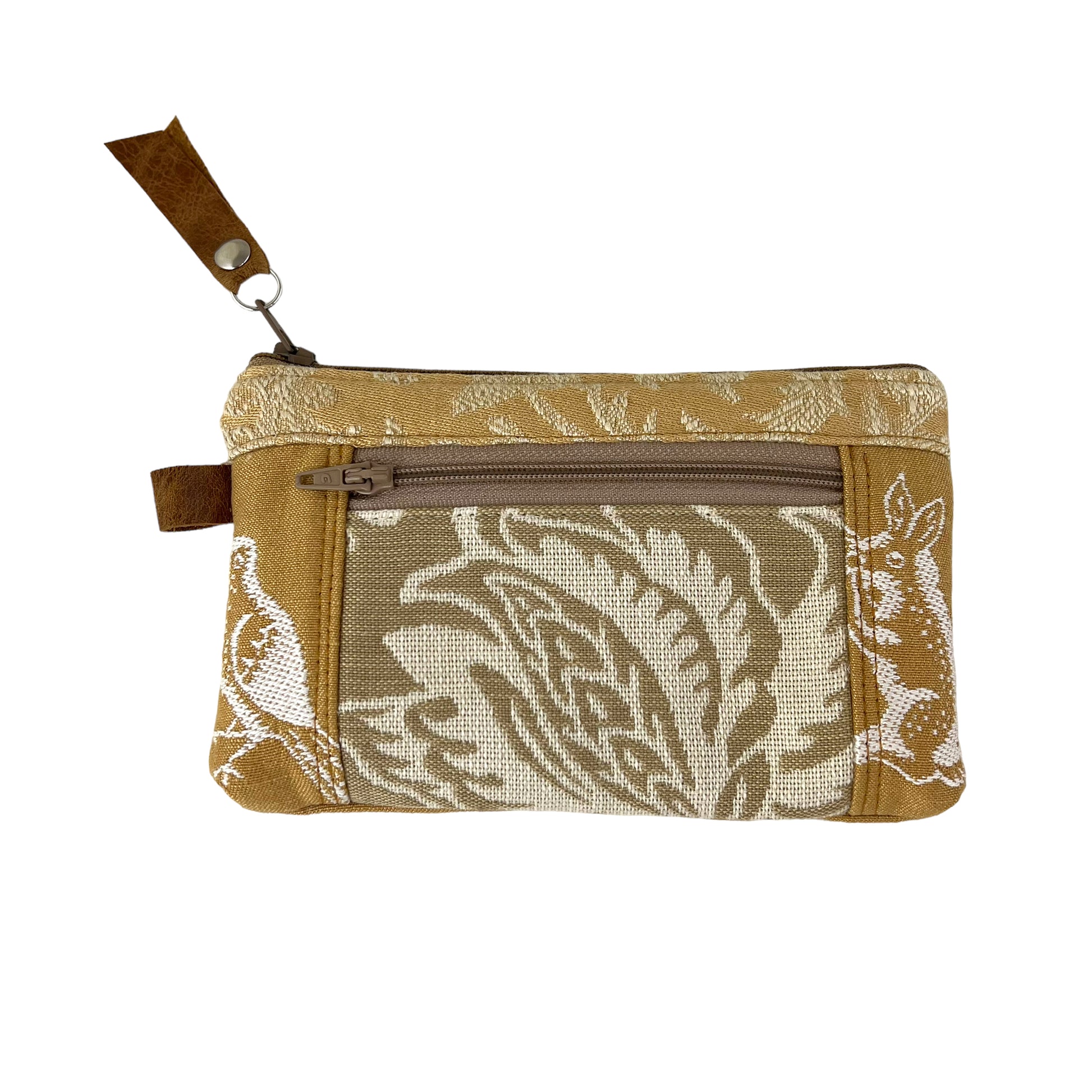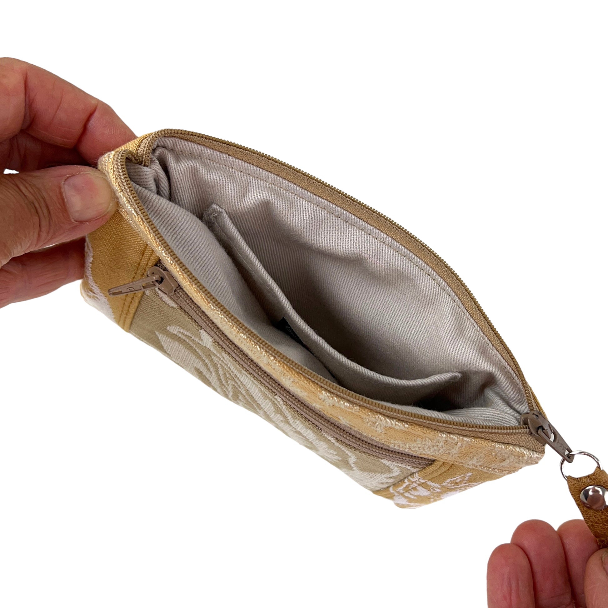 This one of a kind small ivory beige and gold zipper wallet purse has been cut from a selection of exquisite tapestries creating its one of a kind patchwork wallet purse.