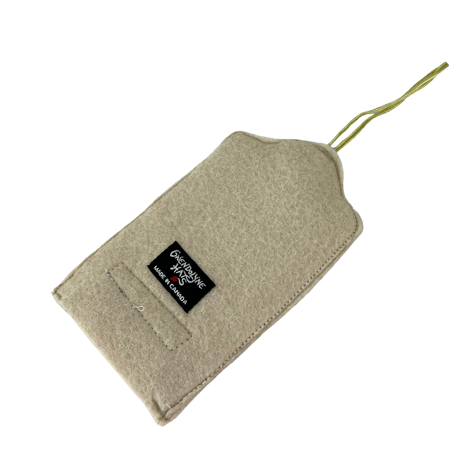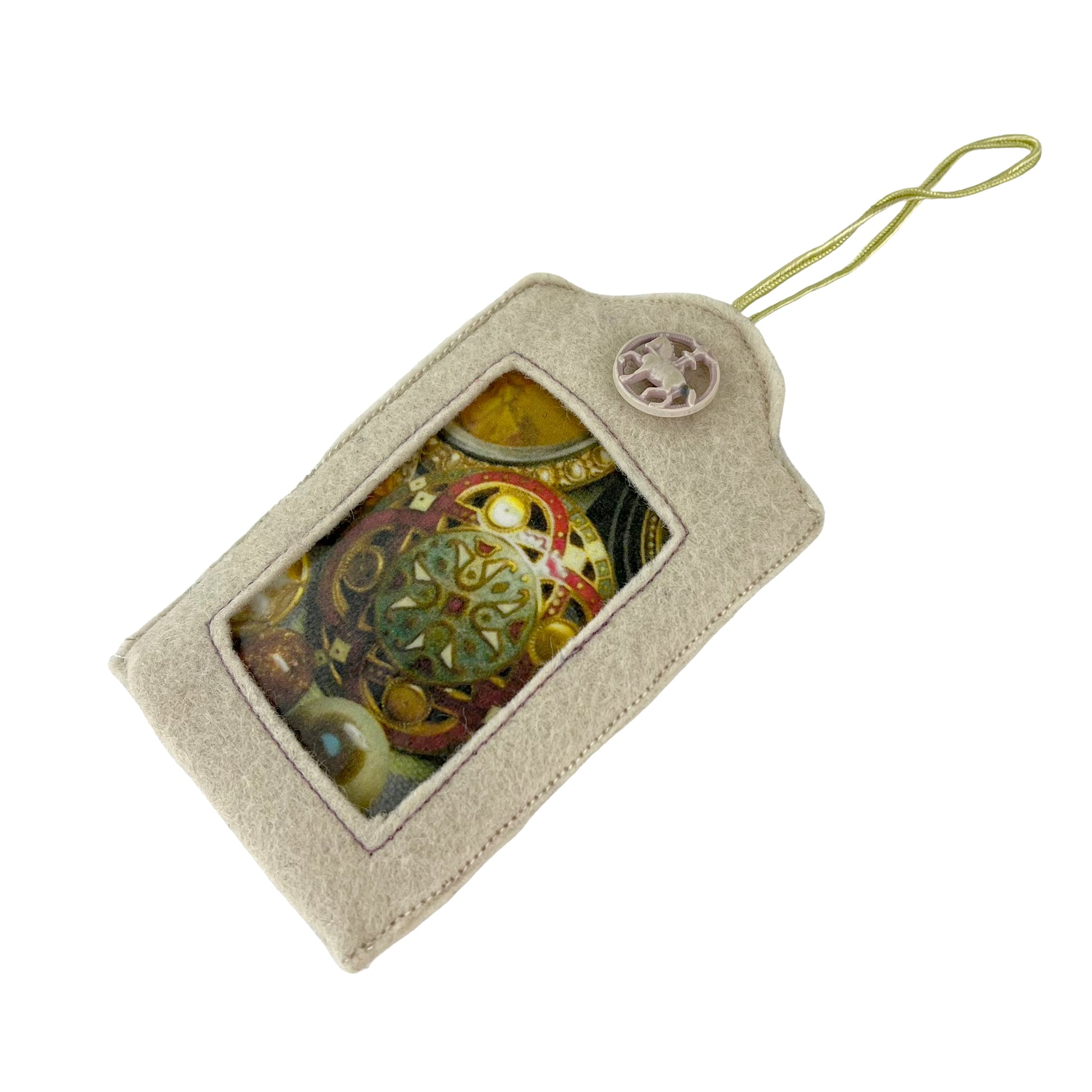 This ivory frame is made from a sturdy 100% wool felt that is sewn and decorated with a vintage white circus ballerina horse realist button from the 1950s. The laminated card  is the template (2  7/16" wide by 3  10/16") for you to use for trimming the photo is so wish to insert inside. The bottom openings have a Velcro closure to open and close.