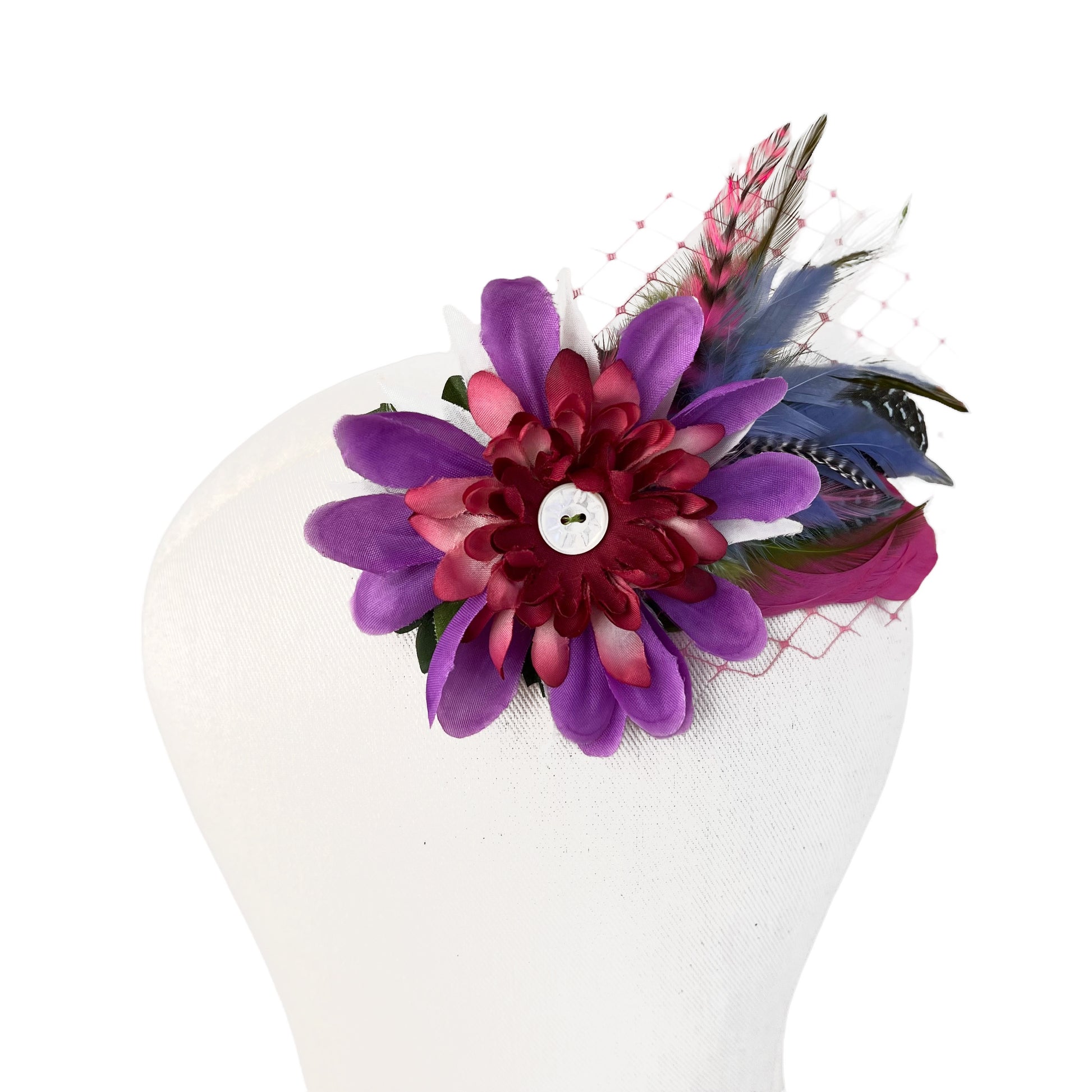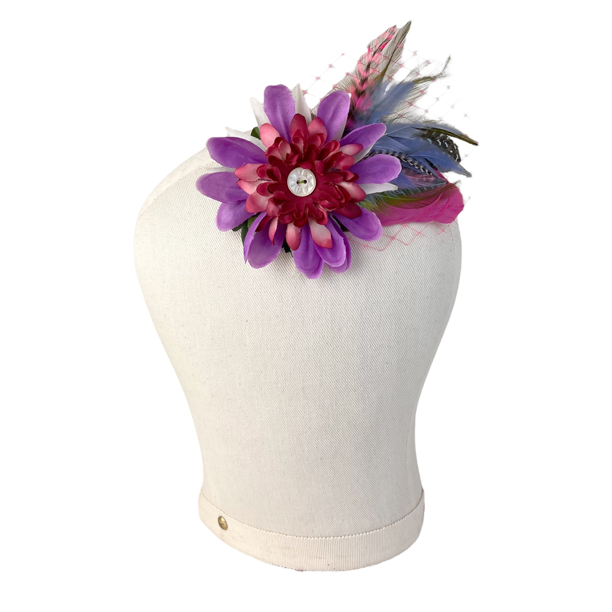 This hand made large pastel purple and red hair clip is one of a kind. It was designed to compliment an persons outfit color as an hair accent. Birds cage tulle and antique mother of pearl button accent this creation.