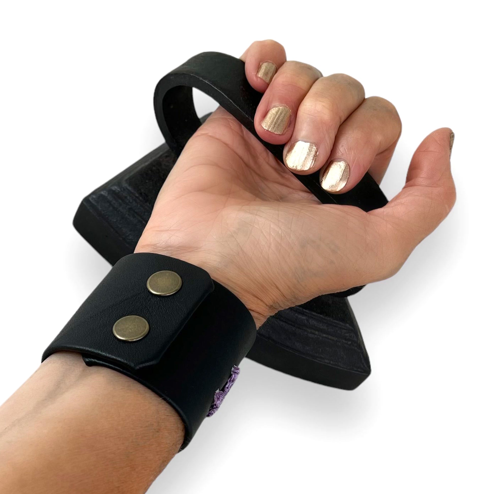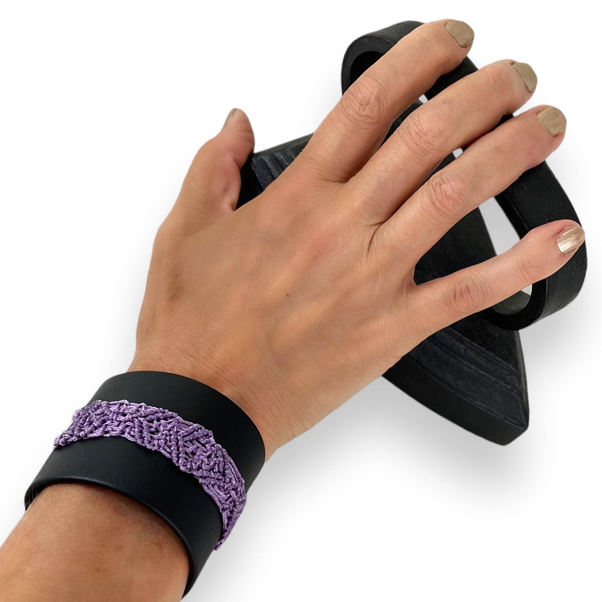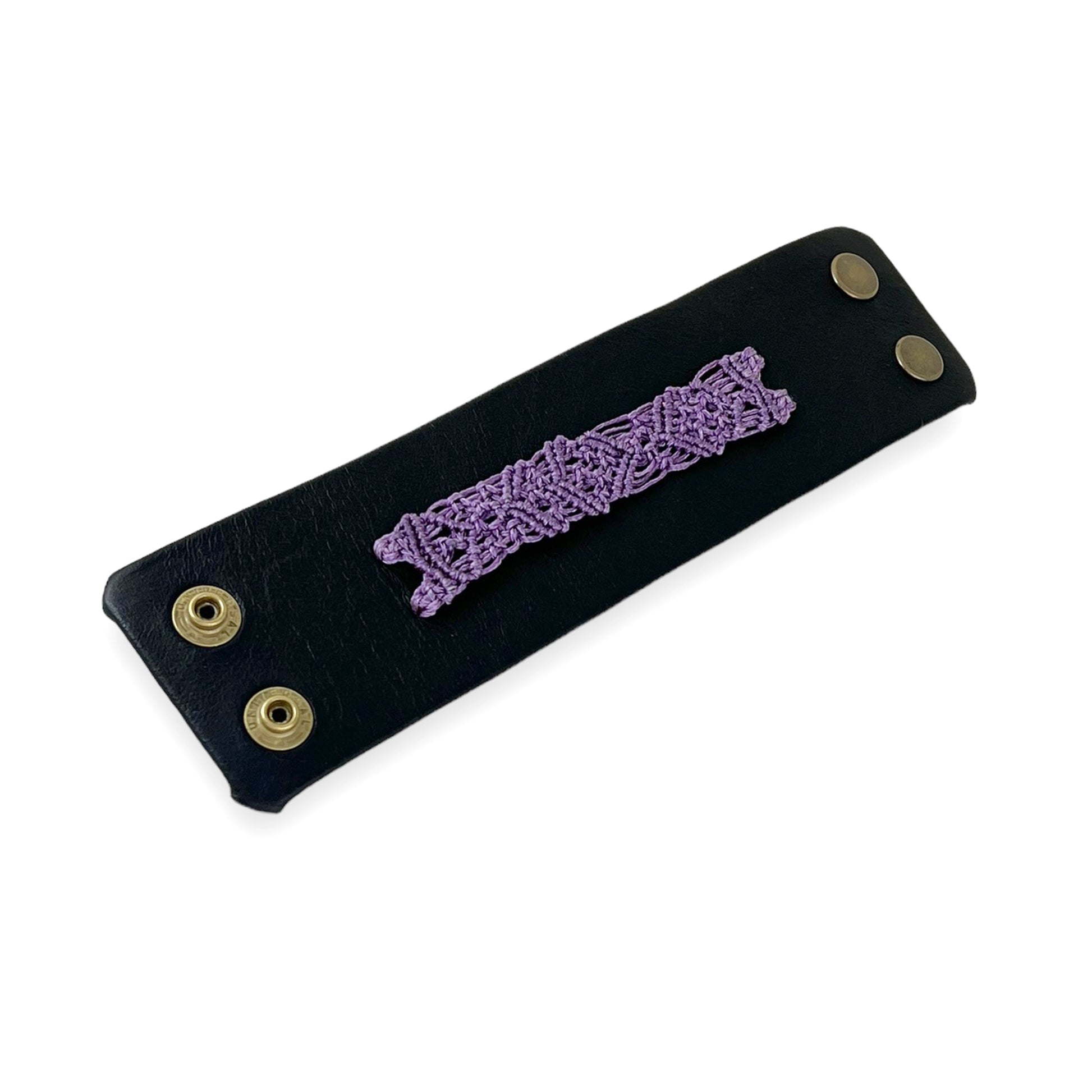Lilac Macrame Black Leather Wrist Cuff Bracelet Size 1
