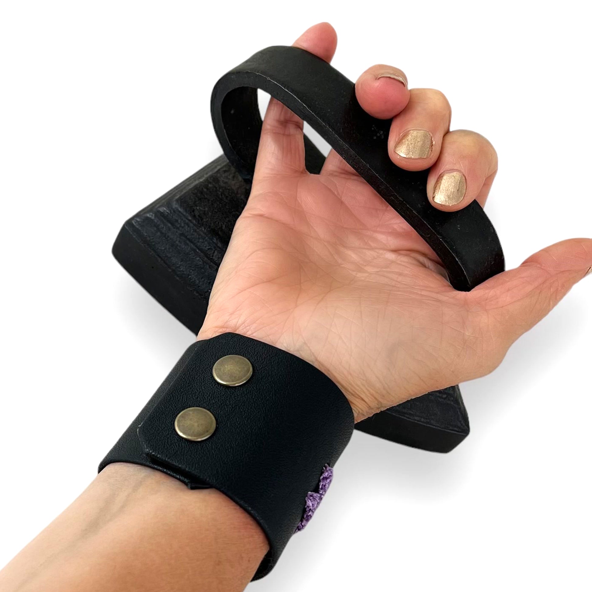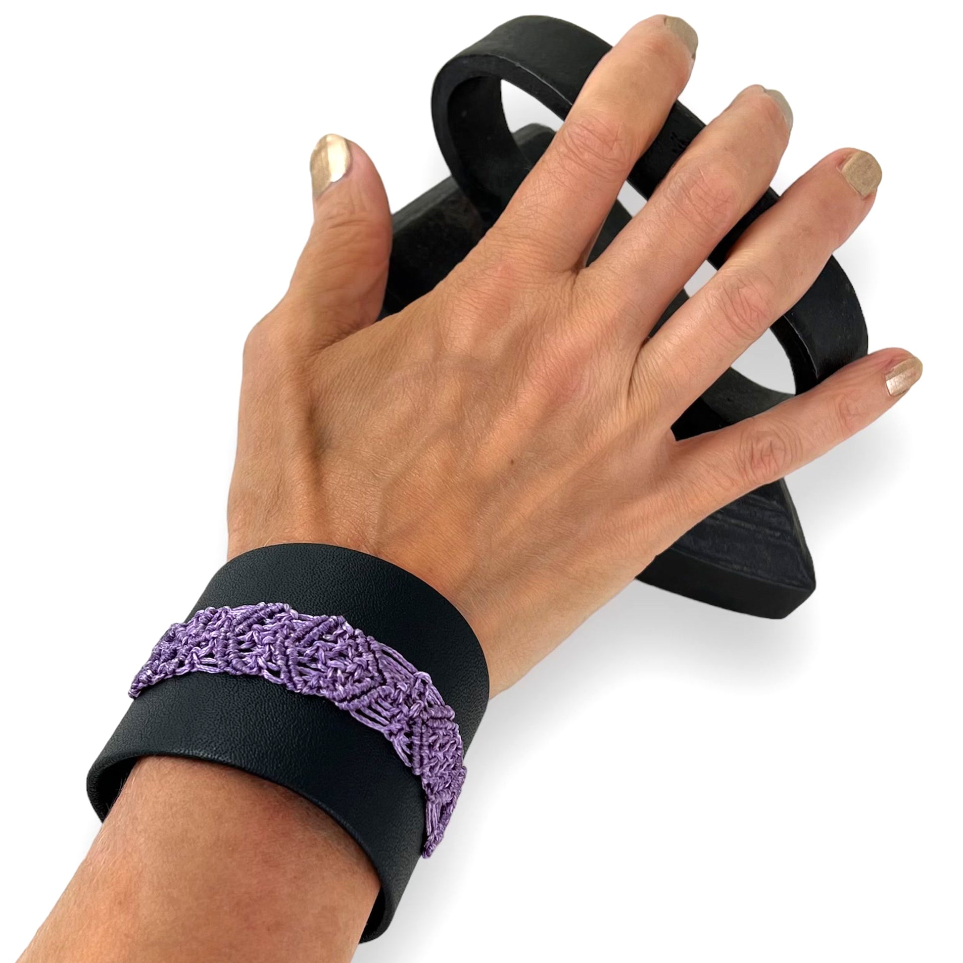 Lilac Macrame Black Leather Wrist Snap Cuff Size 4