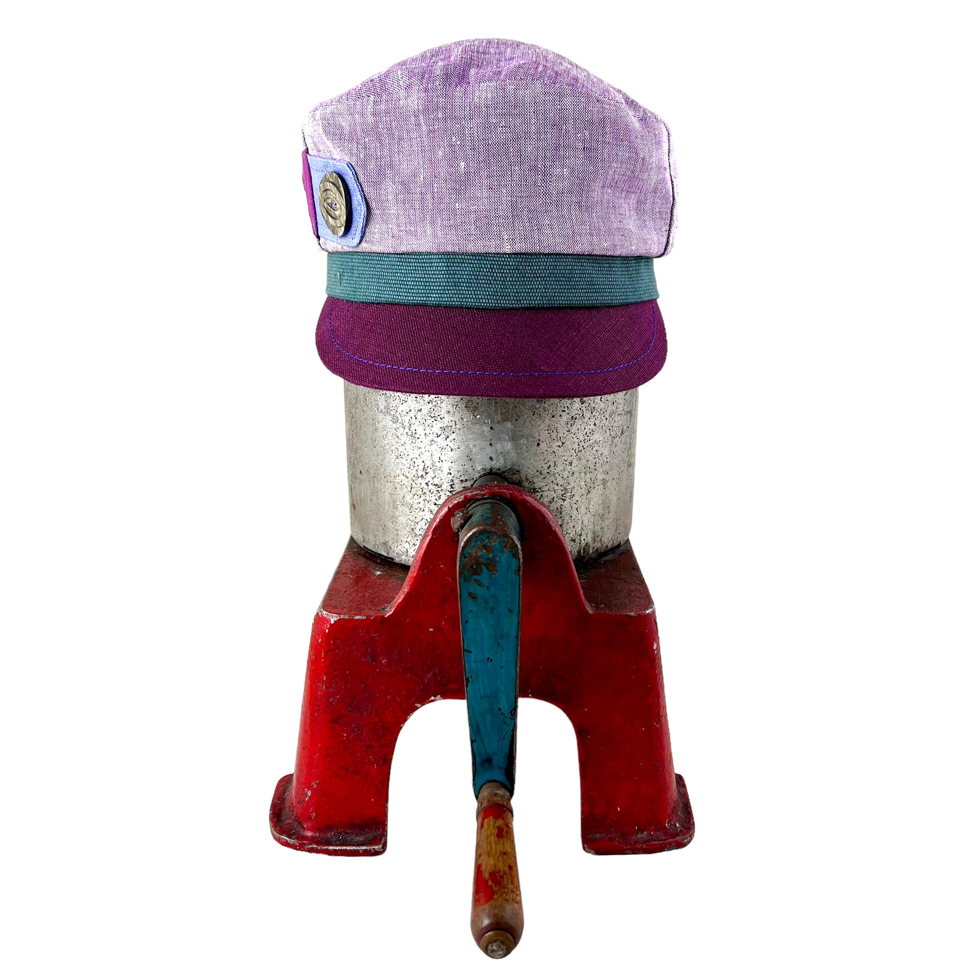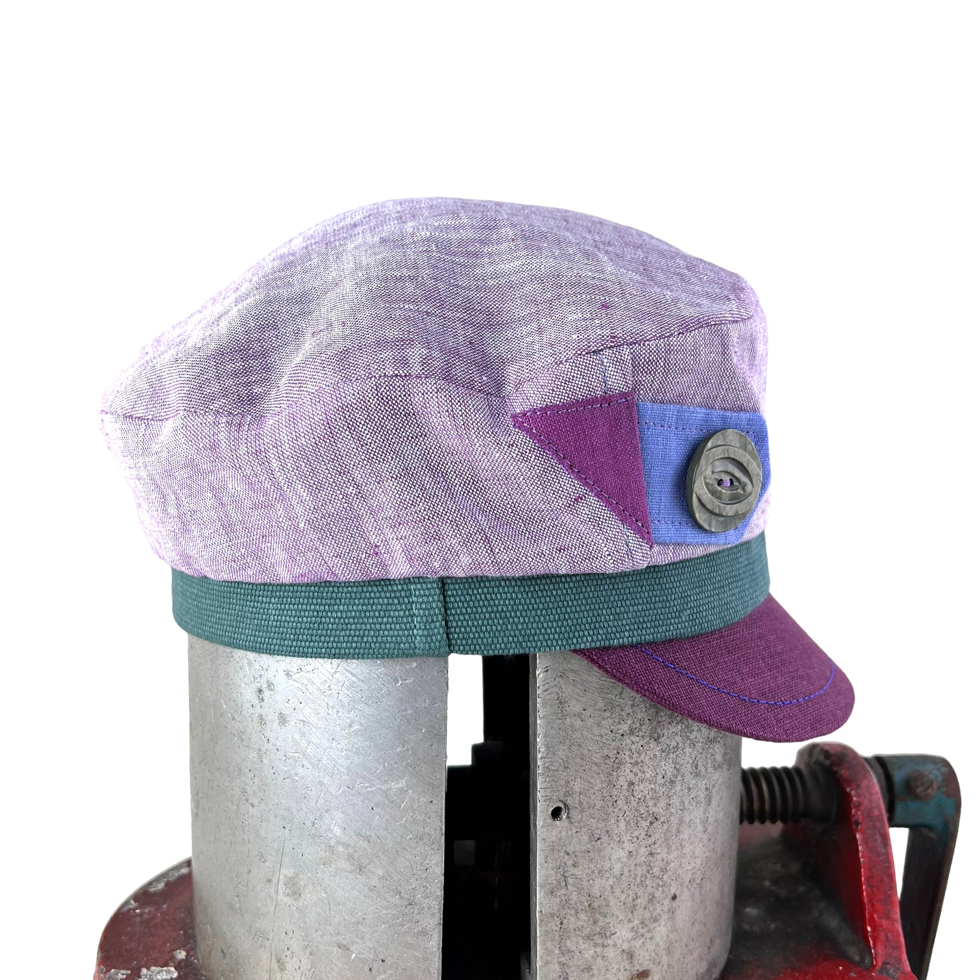 The outside of this cap has been hand cut from a shot lilac white linen weave. The sage green band is made from a strong basket weave cotton. The burgundy red linen peak is made from a sturdy flexible leather board which I top stitch on my leather machine. The cap is embellished with a 1920s celluloid button strap detail.