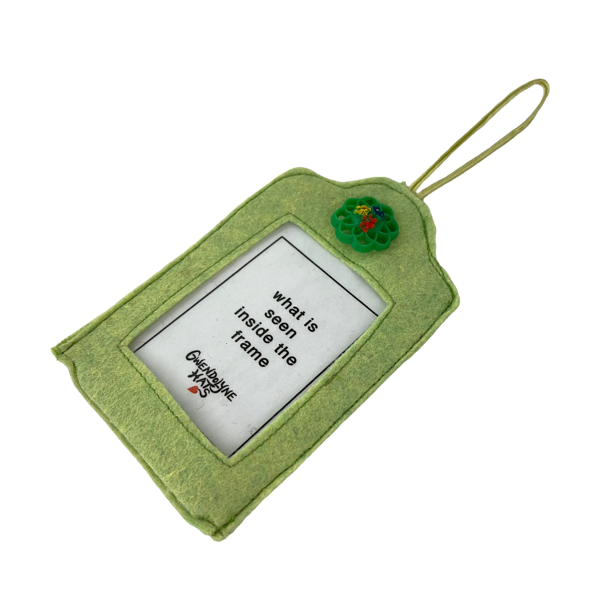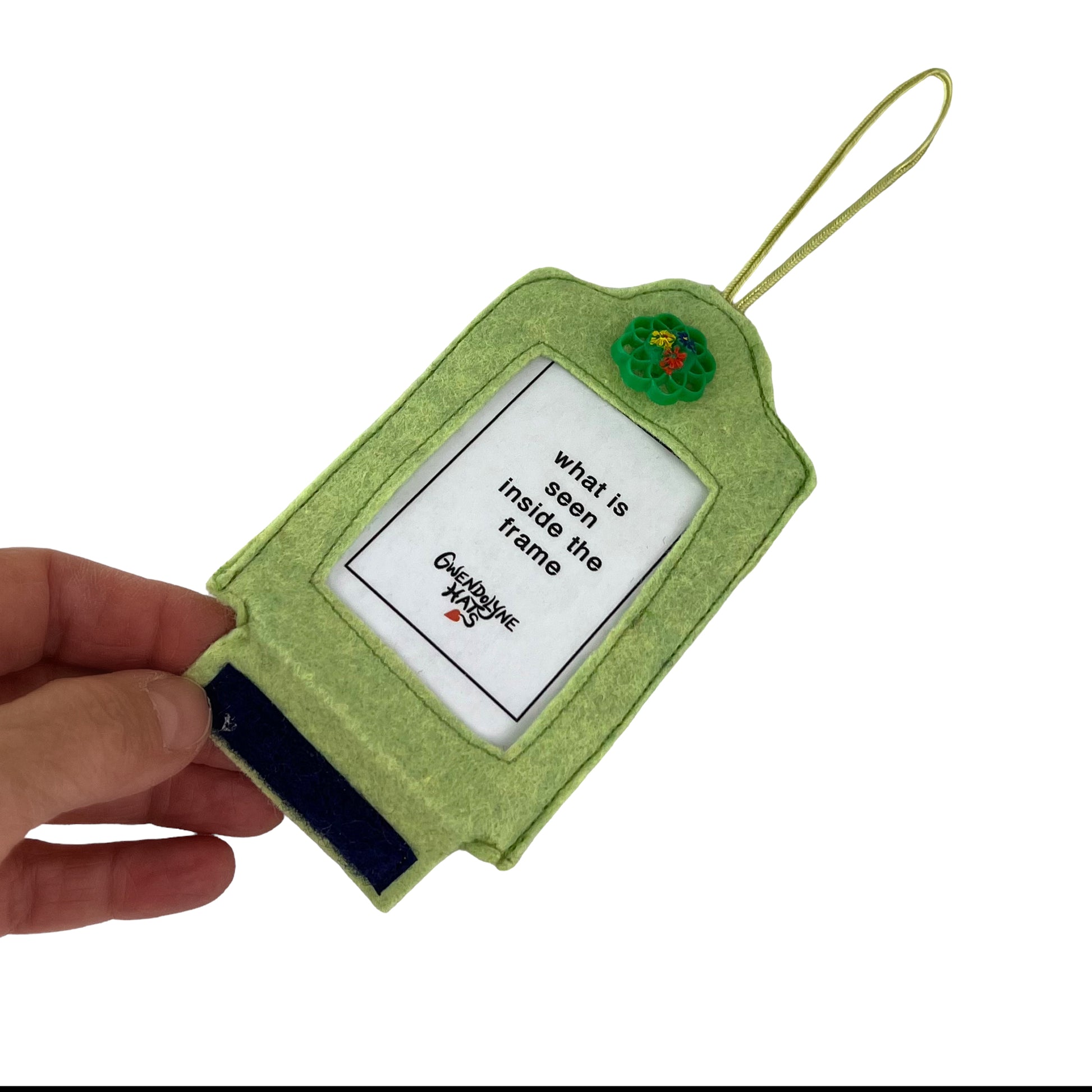 This lime frame is made from a sturdy 100% wool felt that is sewn and decorated with a vintage green flower painted button from the 1950s. The laminated card of the antique button is the template (2  7/16" wide by 3  10/16") for you to use for trimming the photo is so wish to insert inside. The bottom openings have a Velcro closure to open and close.