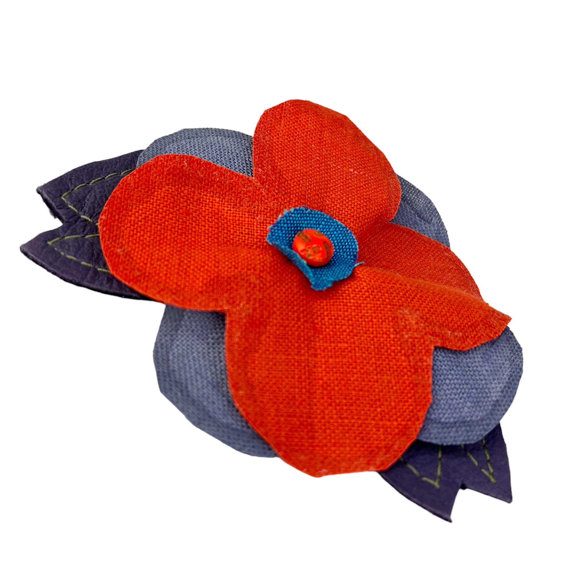 I sewed this one of a kind flower pin by both hand and machine using linen, cowhide and a antique small glass button circa 1890s.