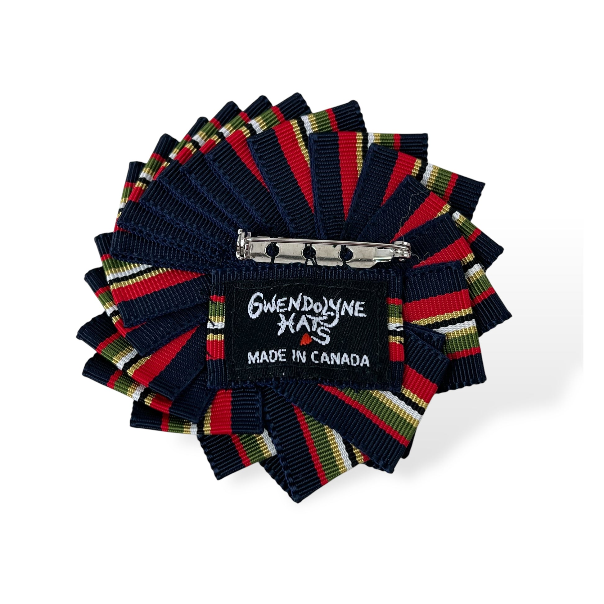 I personally love the pinwheel effect with a ribbon cockade brooch. This multicoloured 3" wide brooch is totally hand sewn and embellished with an antique 1900 metal button. The metal lock pin back is 1 1/4” wide.