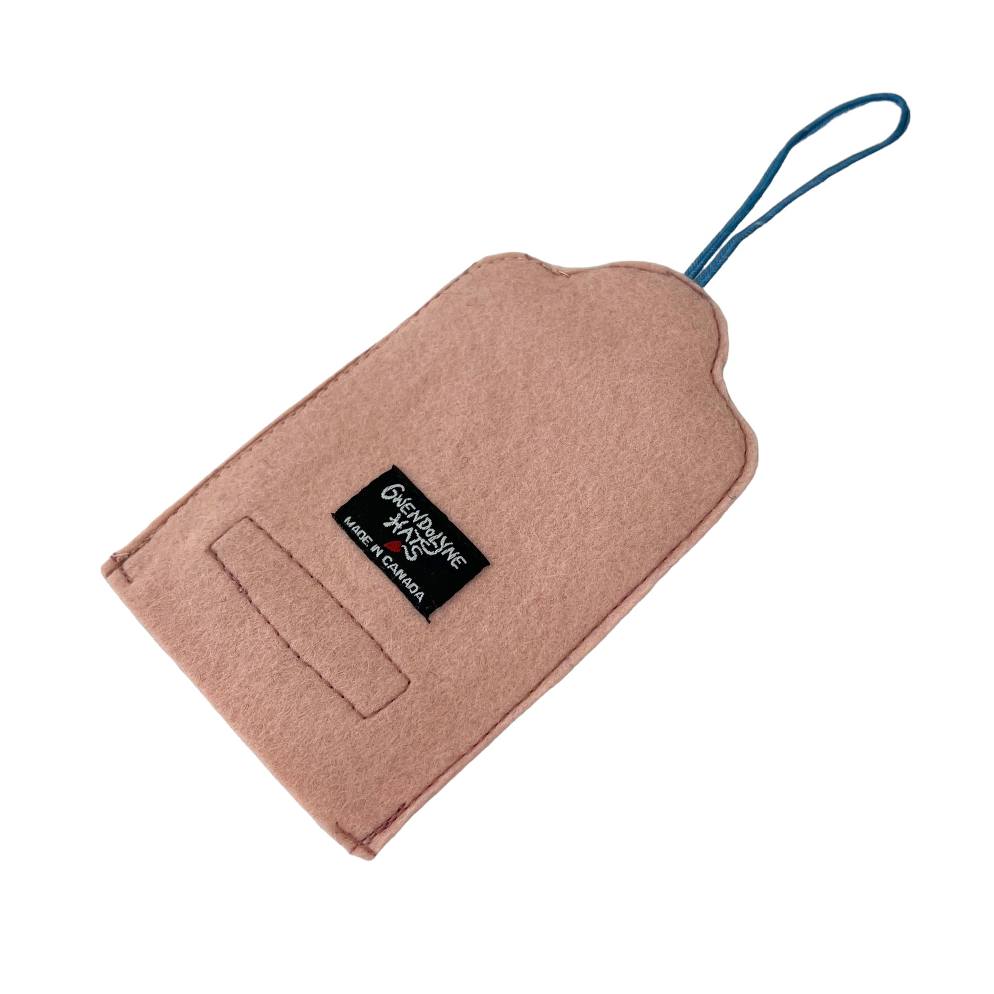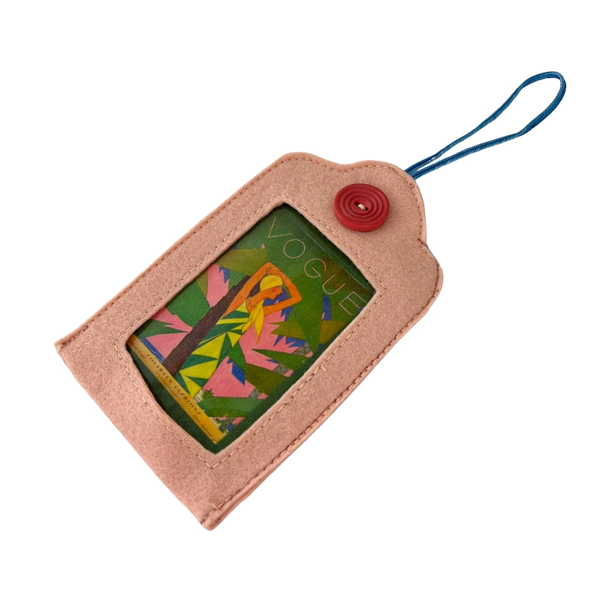 This peach frame is made from a sturdy 100% wool felt that is sewn and decorated with a vintage pink button from the 1950s. The laminated card  is the template (2  7/16" wide by 3  10/16") for you to use for trimming the photo is so wish to insert inside. The bottom openings have a Velcro closure to open and close.