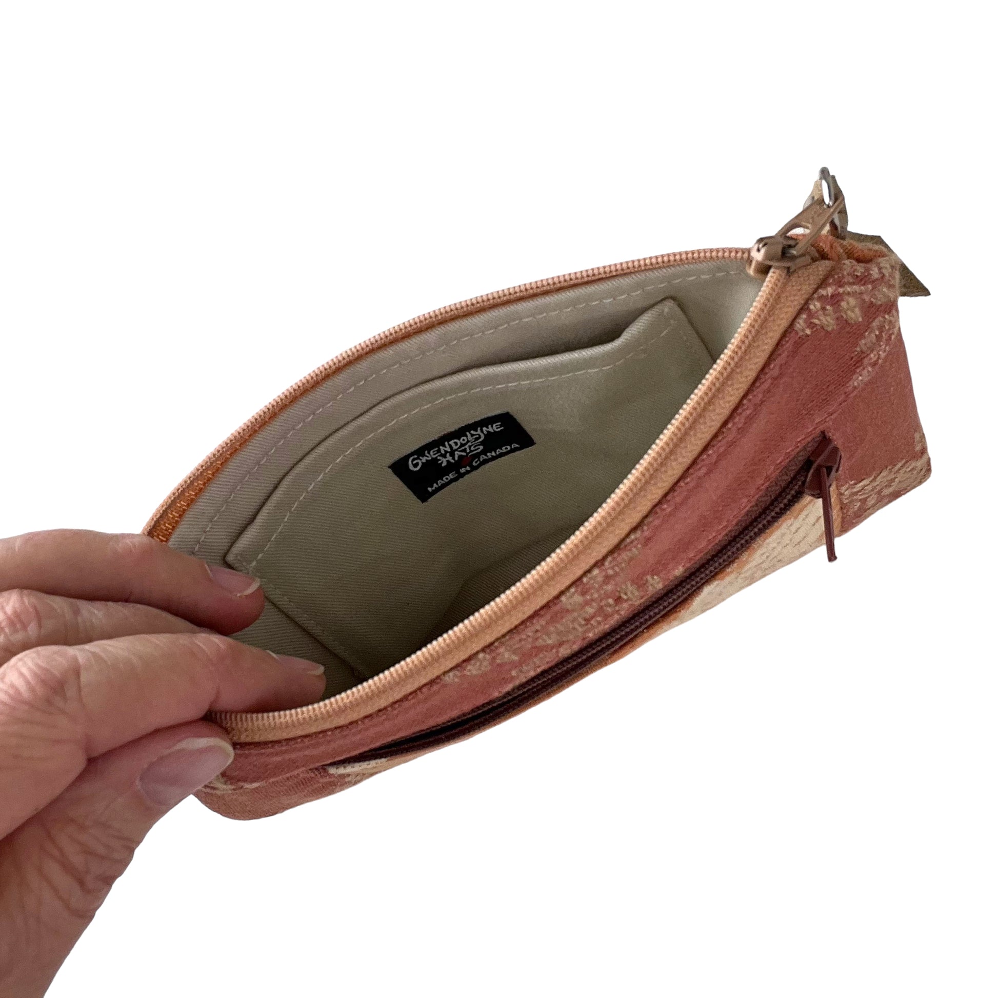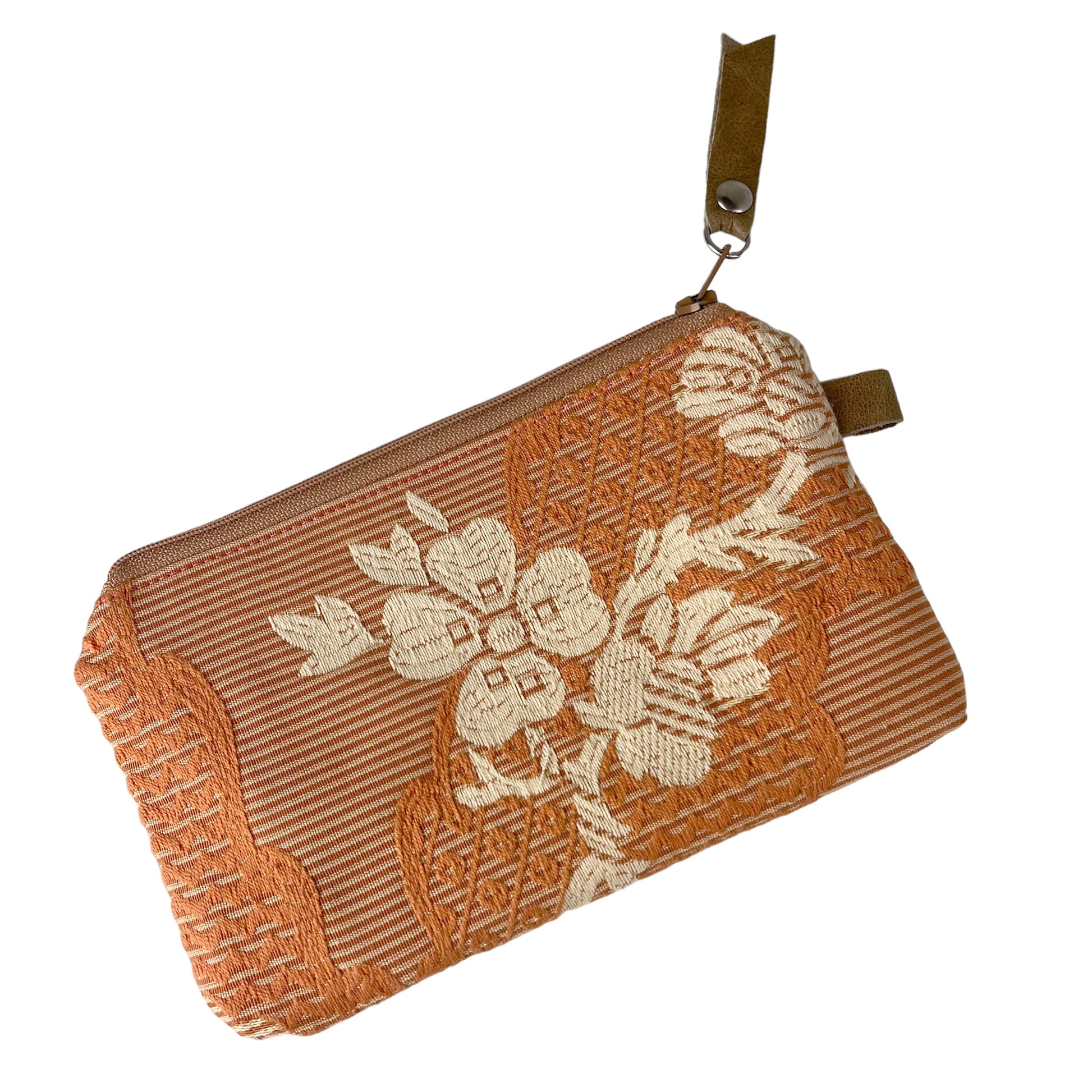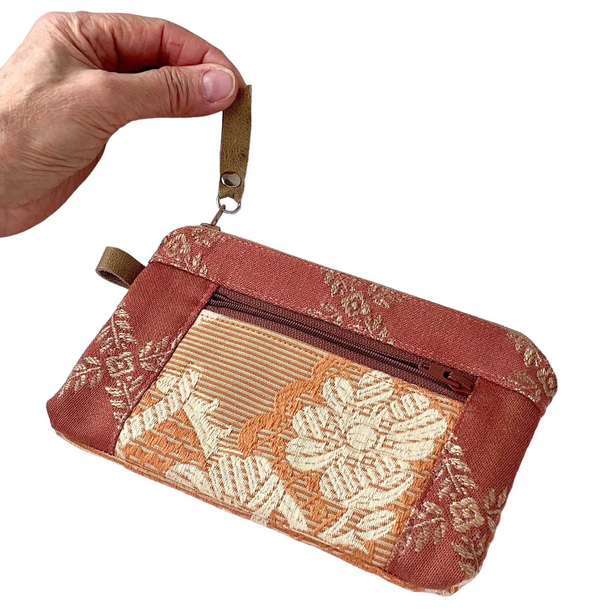 This one of a kind small peach zipper wallet purse has been cut from a selection of exquisite tapestries creating its one of a kind patchwork wallet purse.