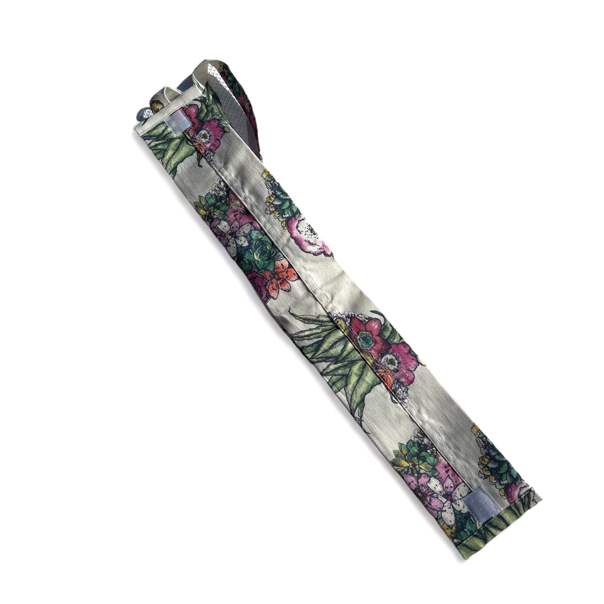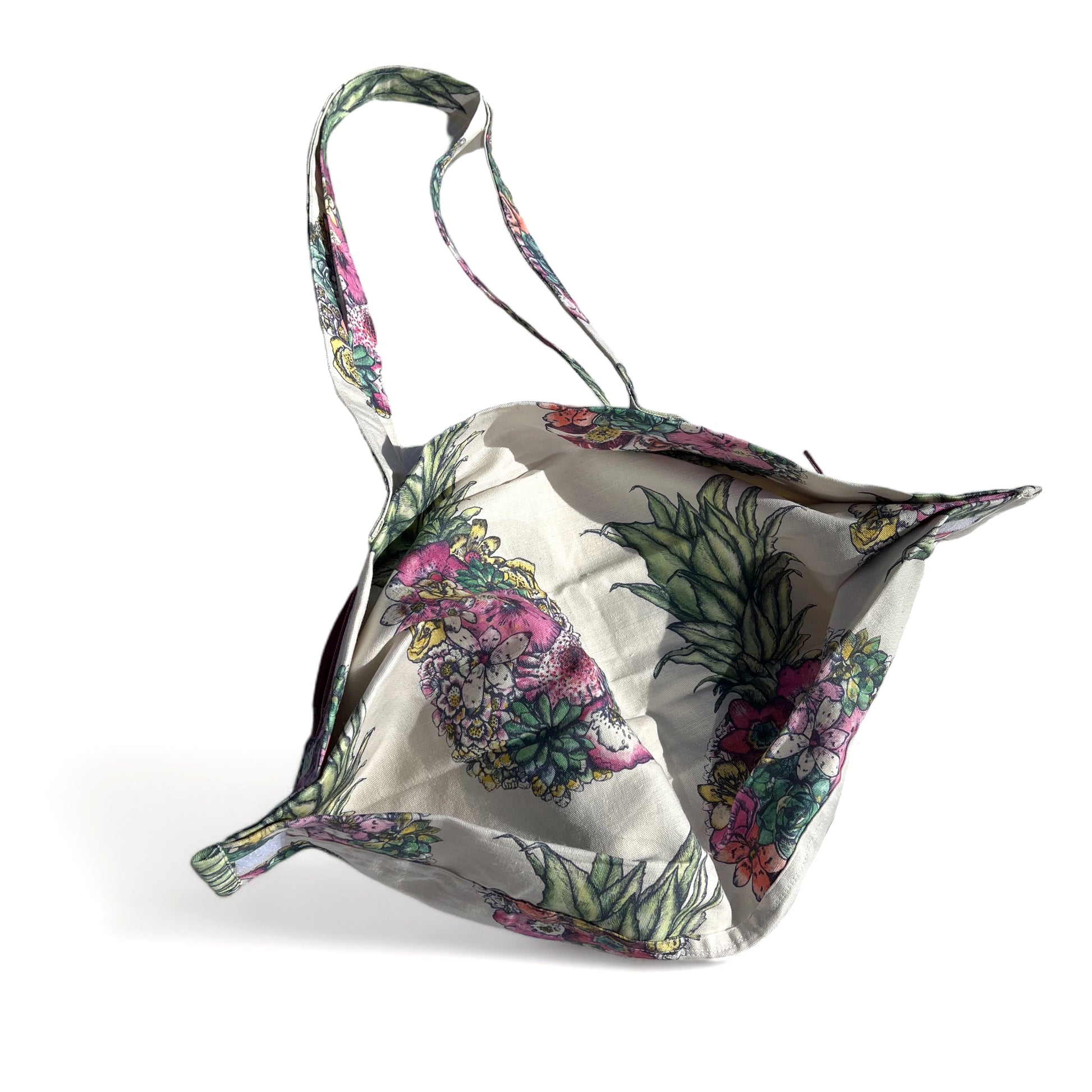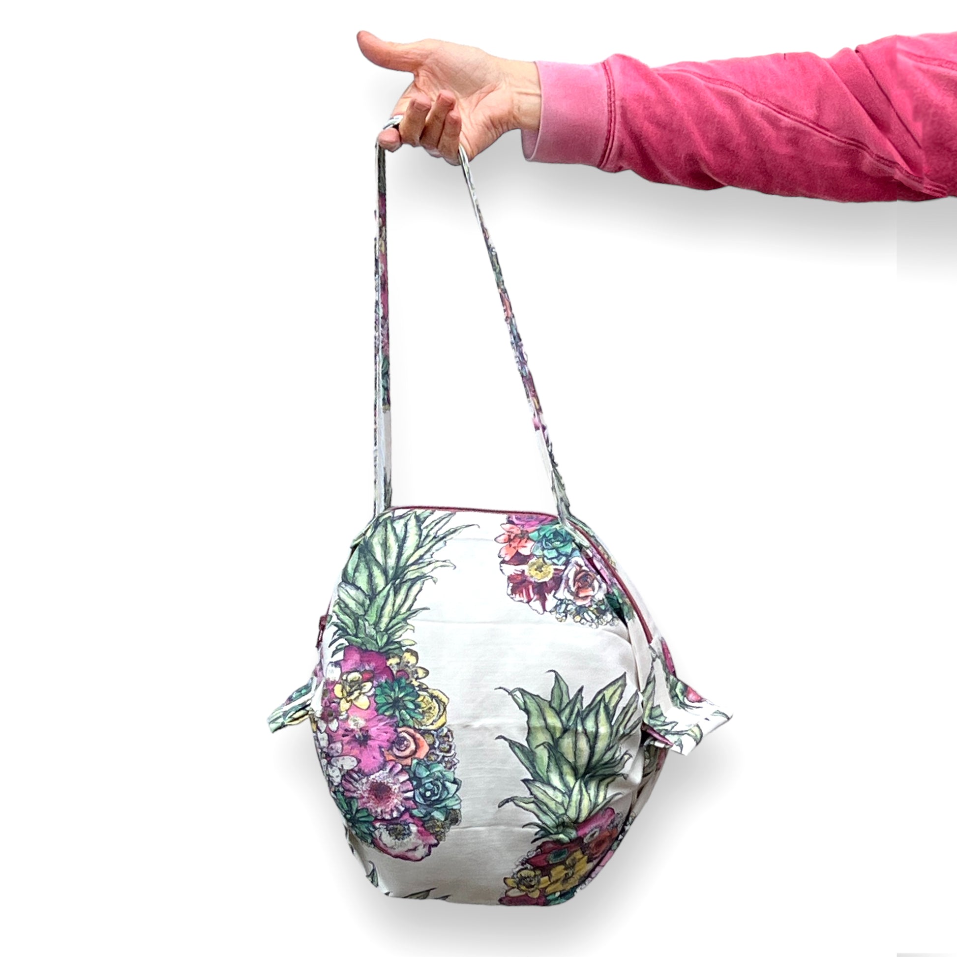 This 26" double strap shoulder foldable tote bag has a 12" long sleeve with a snap closure for easy storage when not being used. The bag is hand cut from a high quality Pineapple print linen design. It flattens easily, then folds in half secured with a velcro tab to keep it in place. It has a durable large 16" dusty pink coloured zipper sewn at the top. When filled, it measures approximately 14" by 14". This video of one of the bags shows how it opens up.