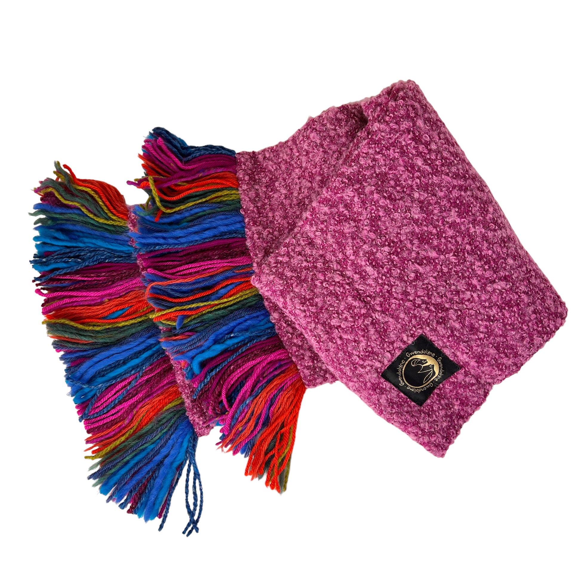This hand cut and sewn pink double layer boucle knit scarf is 9" wide and 60". It is a perfect width to wrap once around your neck and show off this fabulous unique one of a kind hand laid 3" fringe. Keeping the winter chill out and the spirit in.