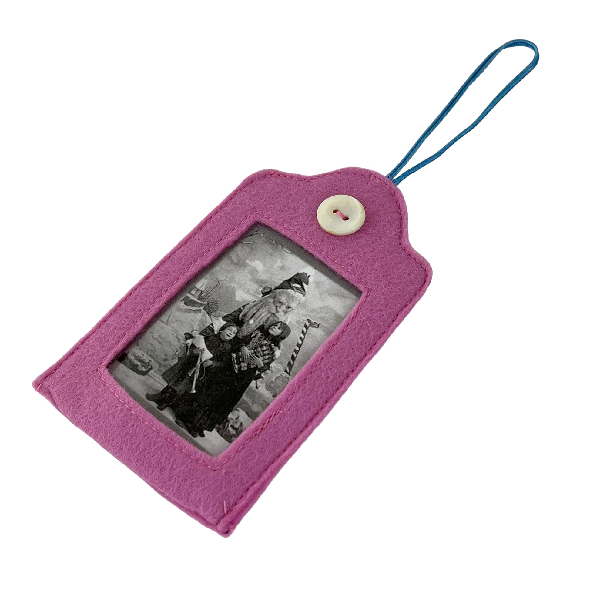 This pink coloured frame is made from a sturdy 100% wool felt that is sewn and decorated with a white mother of pearl 2 hole button from the early 1900s. The laminated card is the template (2  7/16" wide by 3  10/16") for you to use for trimming the photo is so wish to insert inside. The bottom openings have a Velcro closure to open and close.