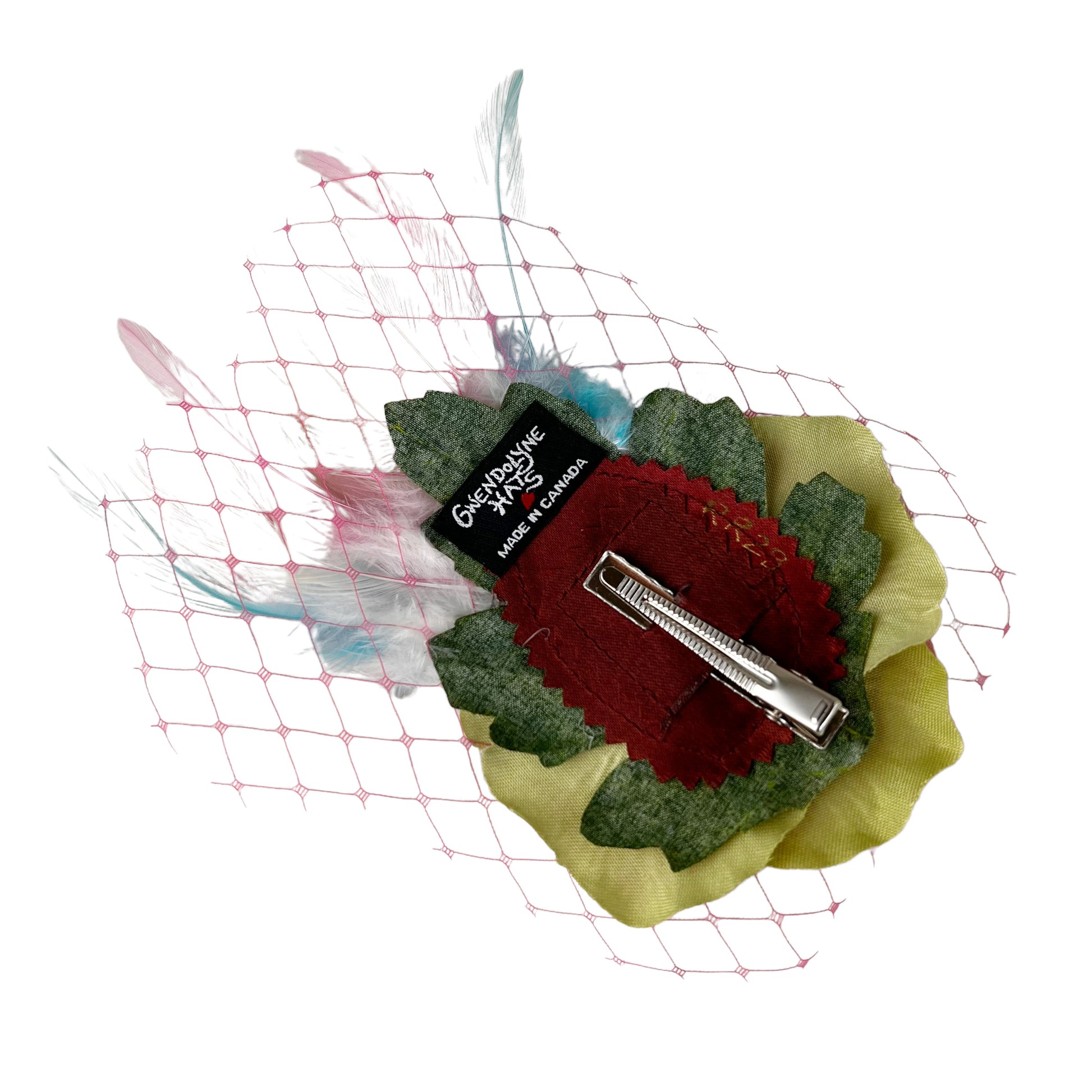 All of my one of a kind flower fascinators are hand made. To create my rose blossom, I sew rose petals around a antique picture button from the late 1890s. This flower is framed with feathers which are laid on top of birds cage tulle. The tulle supports the feathers from bending. The sturdy alligator clip makes it easy to wear in your hair or on something you are wearing. The slot for the clip is also perfect to slide a 18 mm thick hair band (not included in this listing).