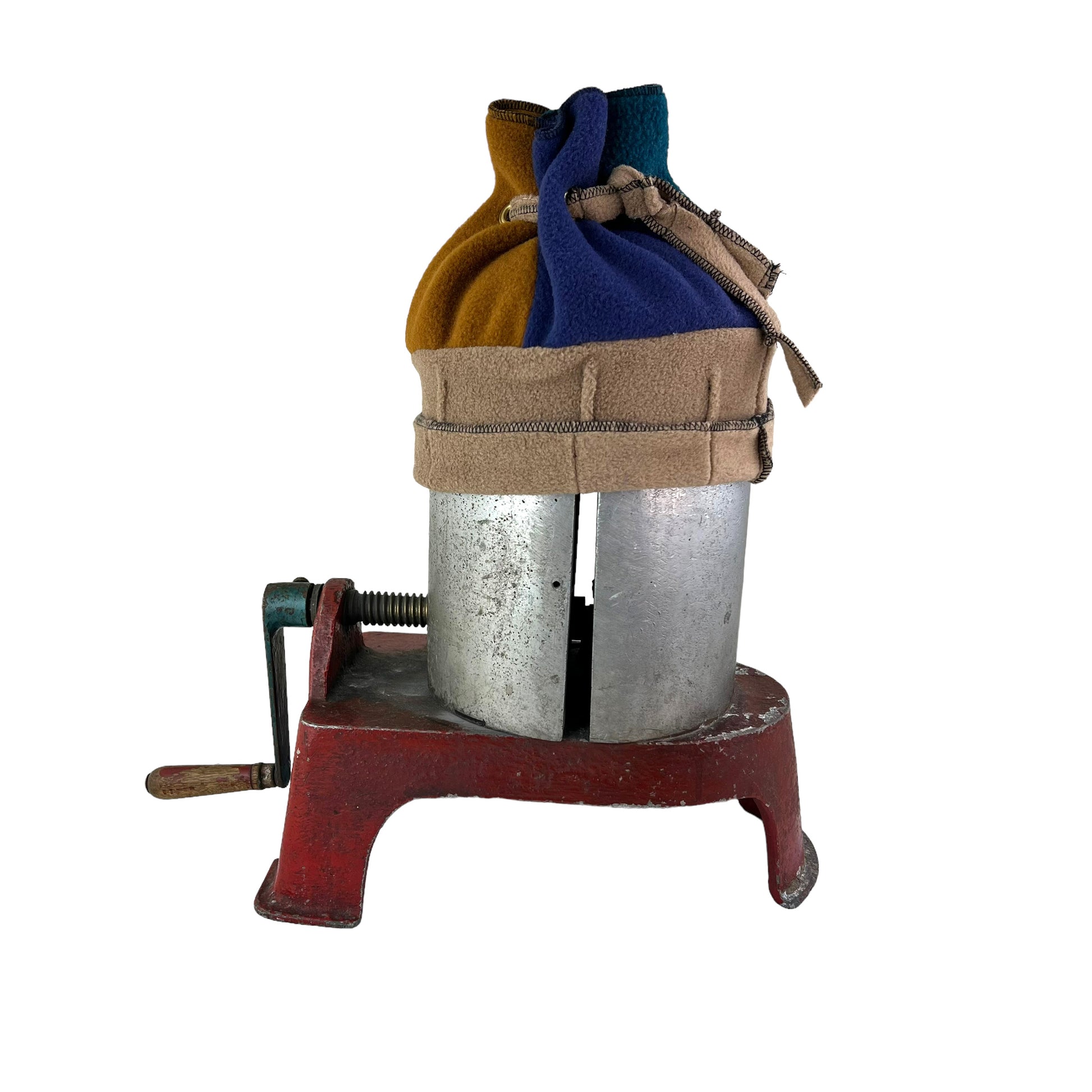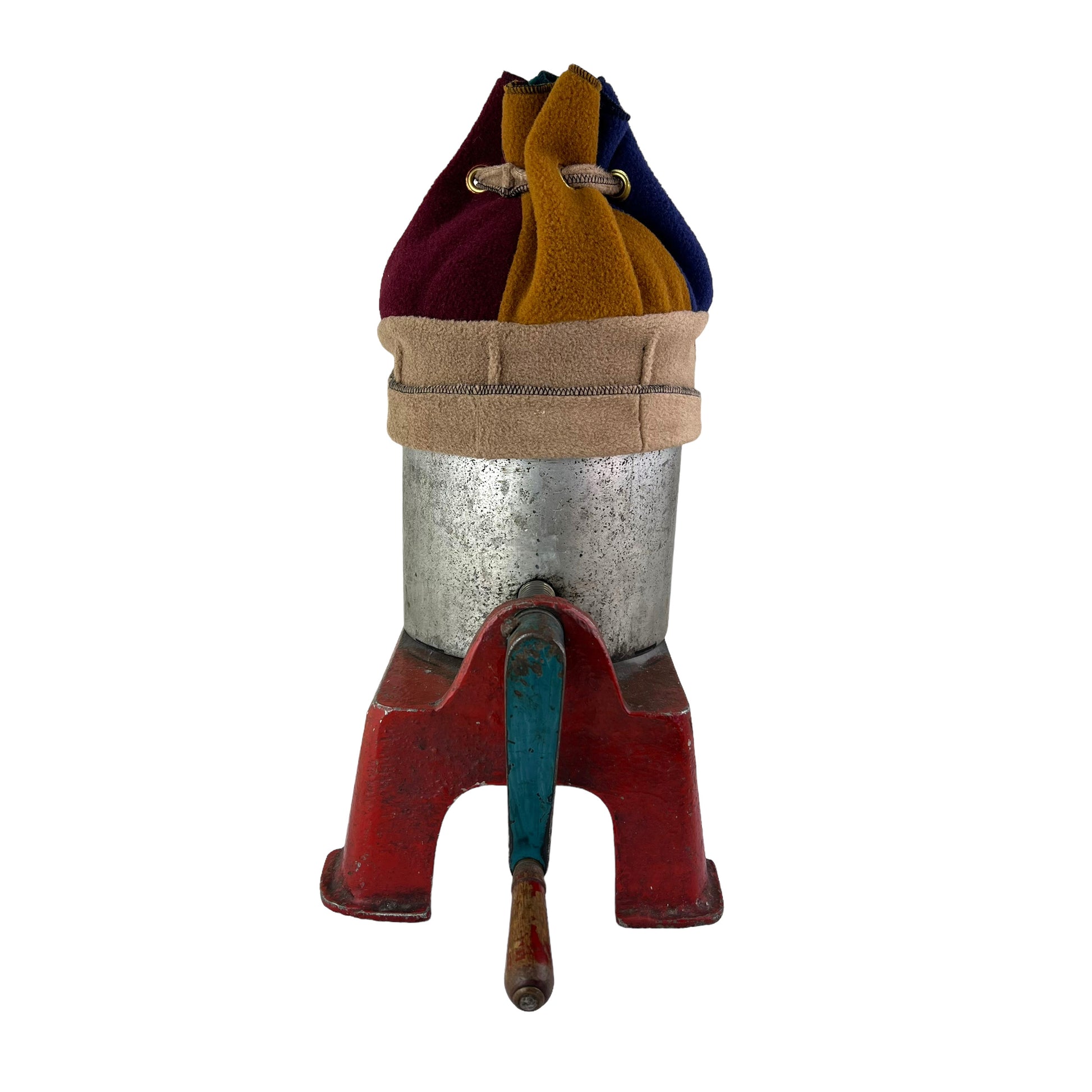 This small size, one of a kind, beige coloured band is cut and sewn from 5 colours of polar fleece. The top has grommets and a polar fleece strand to open and close the top of the hat.