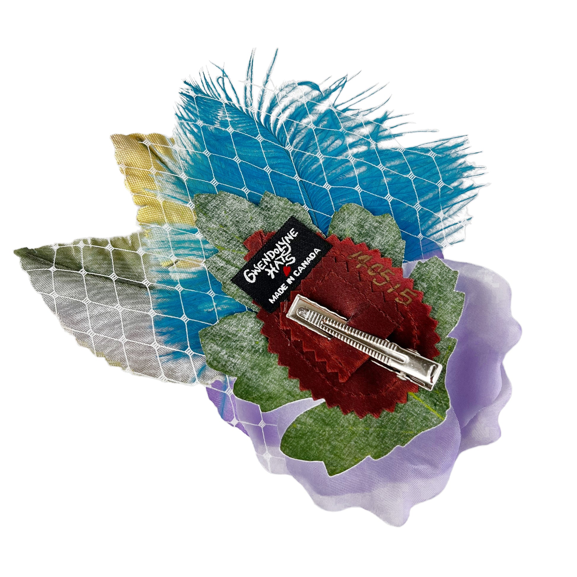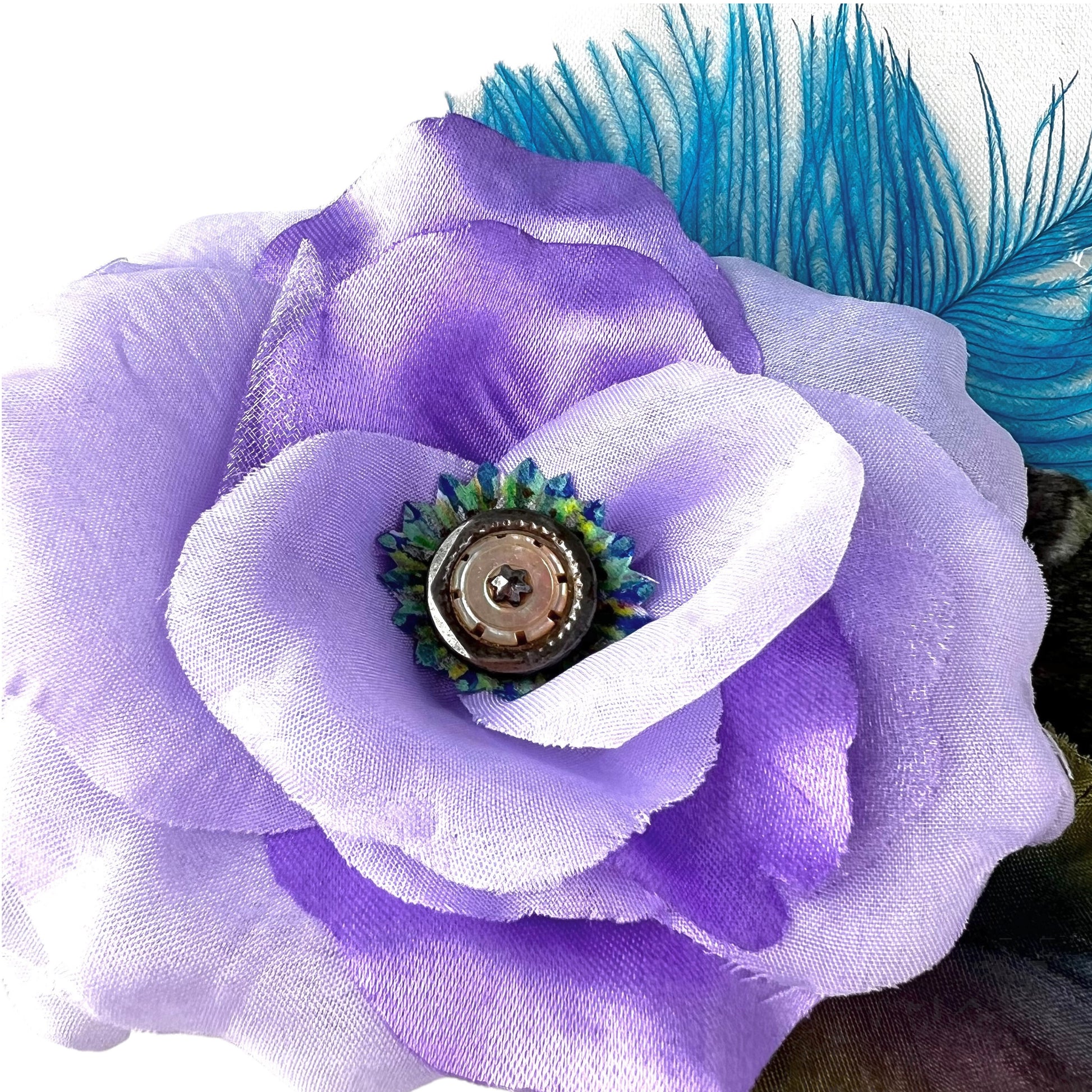 All of my one of a kind flower fascinators are hand made. To create my rose blossom, I sew rose petals around an antique button from the late 1800s. This flower is framed with feathers which are laid on top of birds cage tulle. The tulle supports the feathers from bending. The sturdy alligator clip makes it easy to wear in your hair or on something you are wearing. The slot for the clip is also perfect to slide a 18 mm thick hair band (not included in this listing).