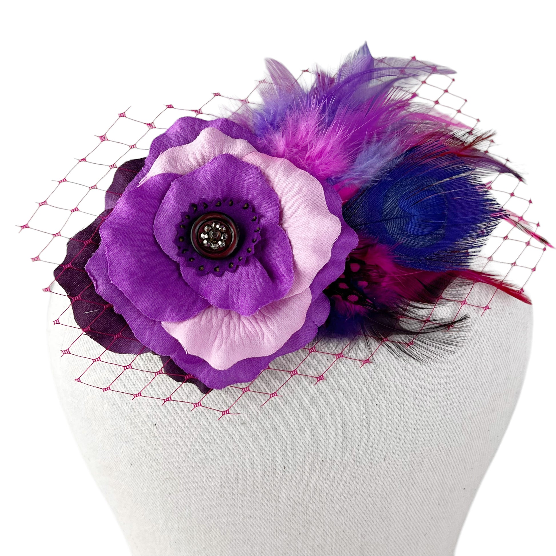 All of my one of a kind flower fascinators are hand made. To create my rose blossom, I sew rose petals around an antique button from the late 1800s. This flower is framed with feathers which are laid on top of birds cage tulle. The tulle supports the feathers from bending. The sturdy alligator clip makes it easy to wear in your hair or on something you are wearing. The slot for the clip is also perfect to slide a 18 mm thick hair band (not included in this listing).