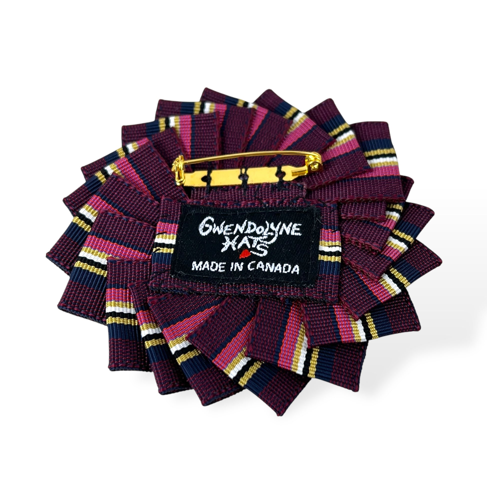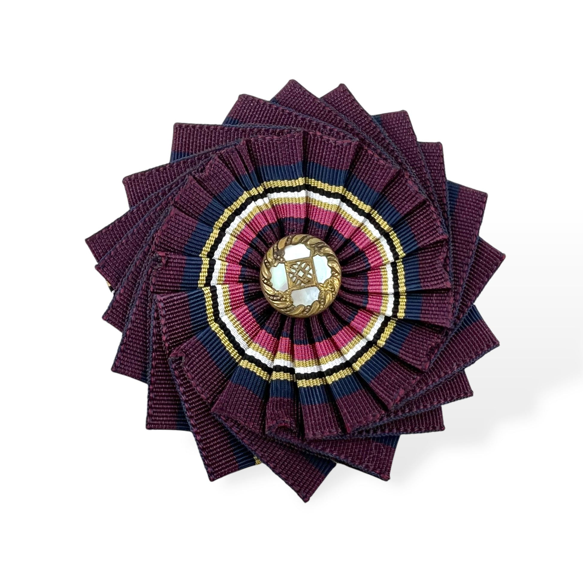 I personally love the pinwheel effect with a ribbon cockade brooch. This multicoloured 3" wide brooch is totally hand sewn and embellished with a beautiful ornate antique metal shell button from the early 1900s. The metal lock pin back is 1 1/4” wide.