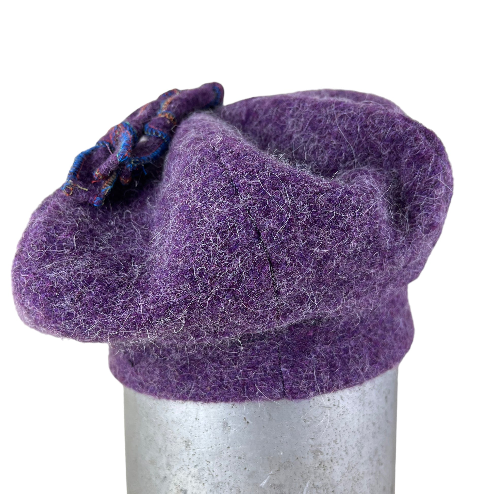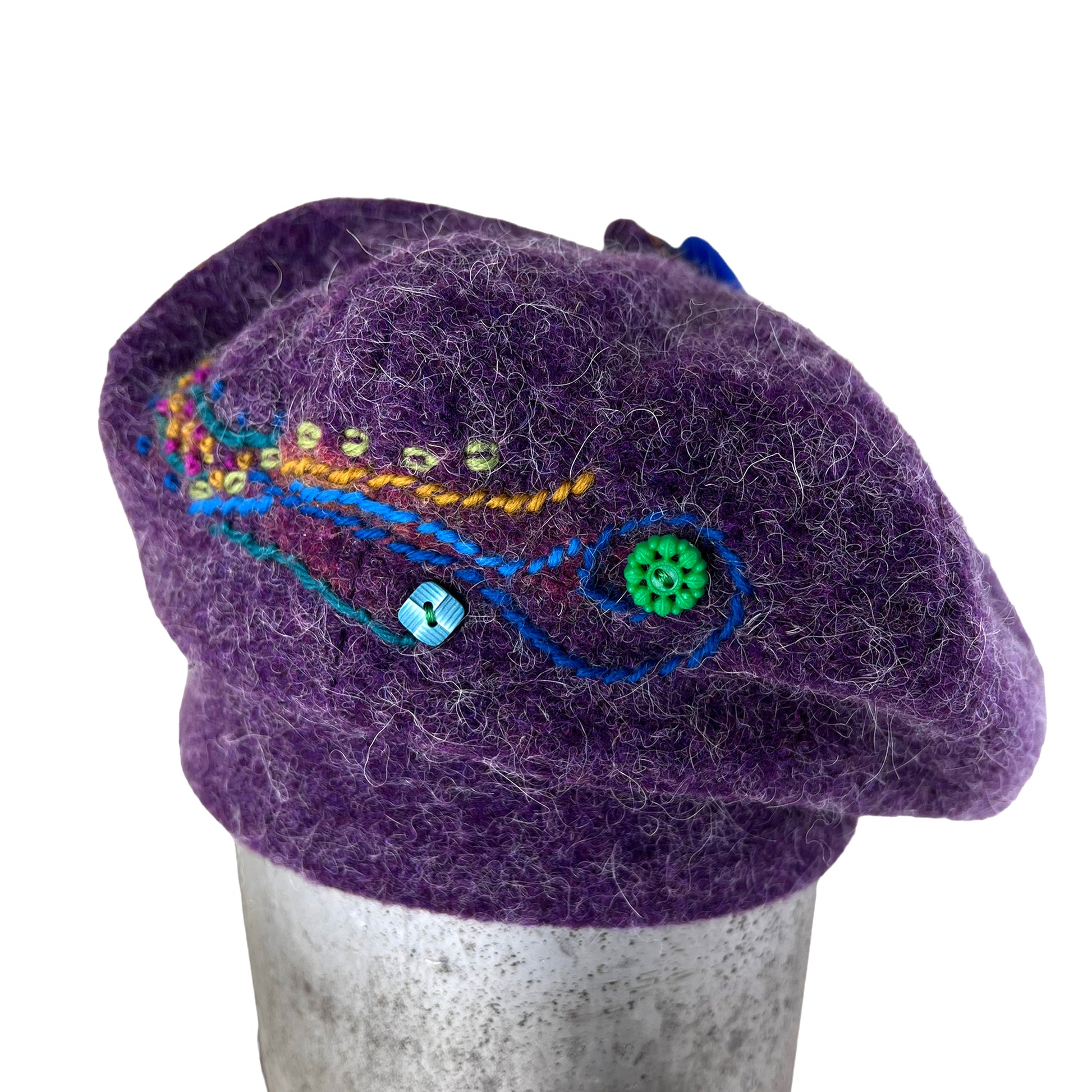 The Purple Pumpkin is a full body wool knit sewn beret tam. It is both cozy and comfy for the cold winter months. This tam has been embellished with some wool hand embroidery and several vintage buttons for some extra fun.