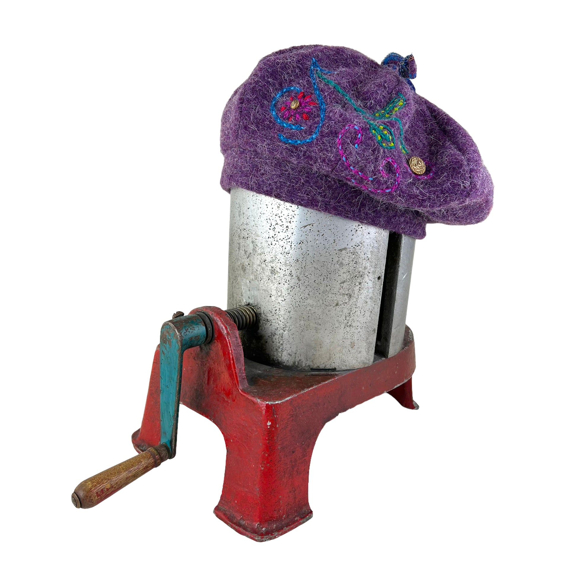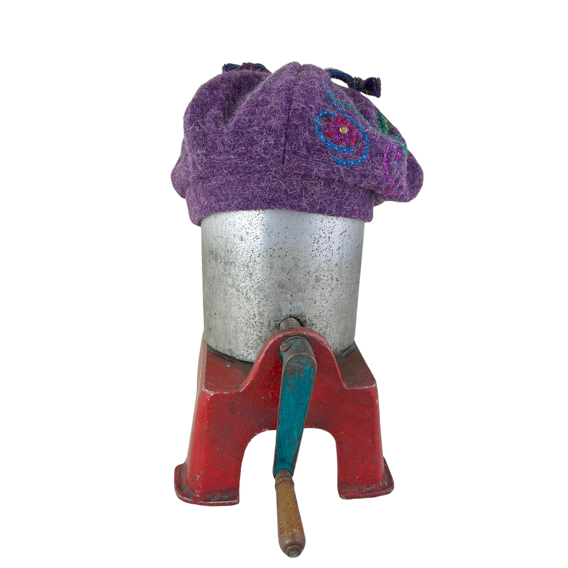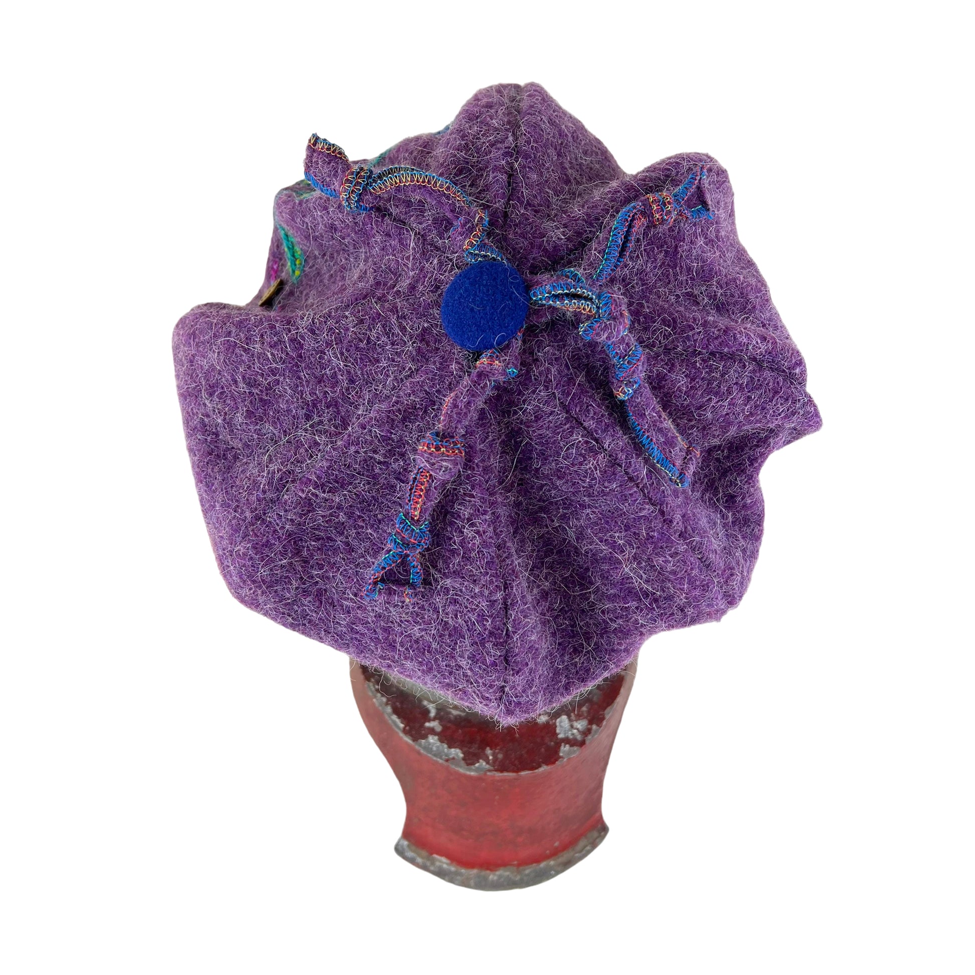 The Purple Pumpkin is a full body wool knit sewn beret tam. It is both cozy and comfy for the cold winter months. This tam has been embellished with some wool hand embroidery and several vintage buttons for some extra fun.