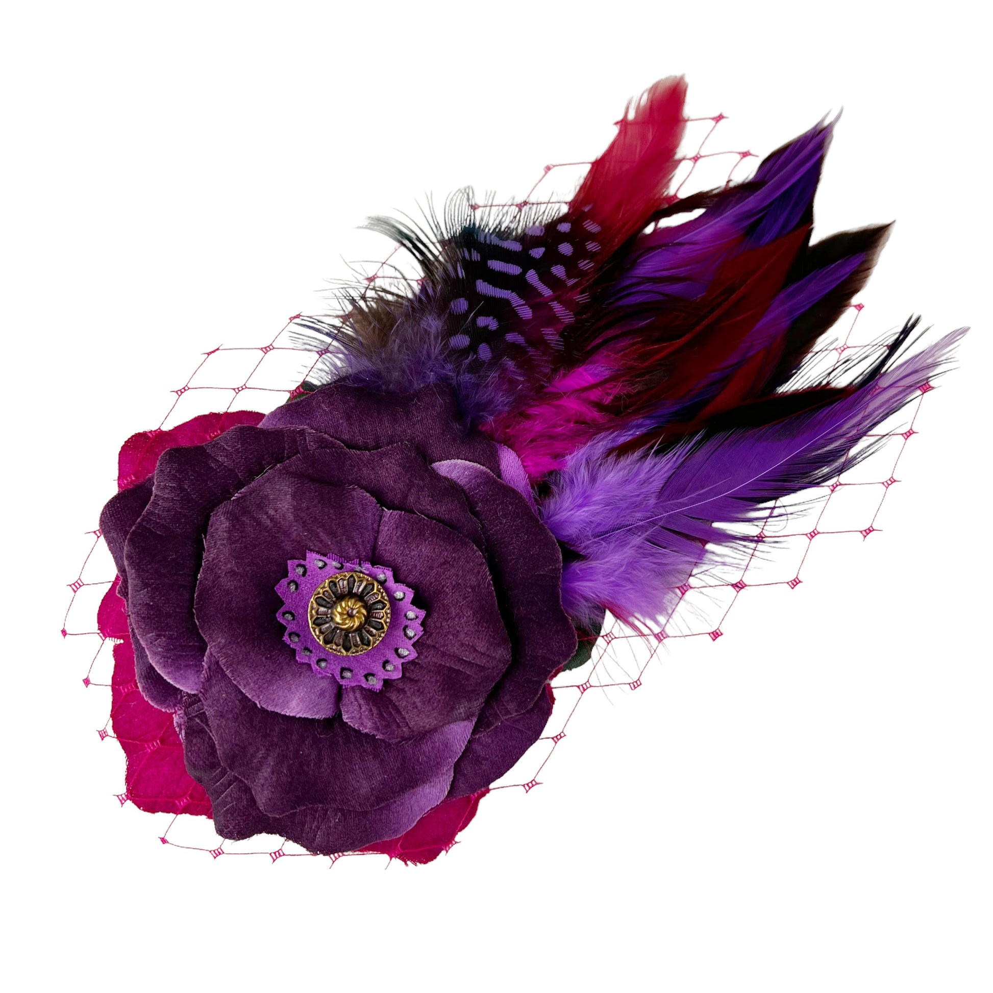 This dark purple Rose feather fascinator hair clip was made in its own unique individual colour palette designed to compliment an individual. The exquisite antique button accent comes from my own treasured button collection.