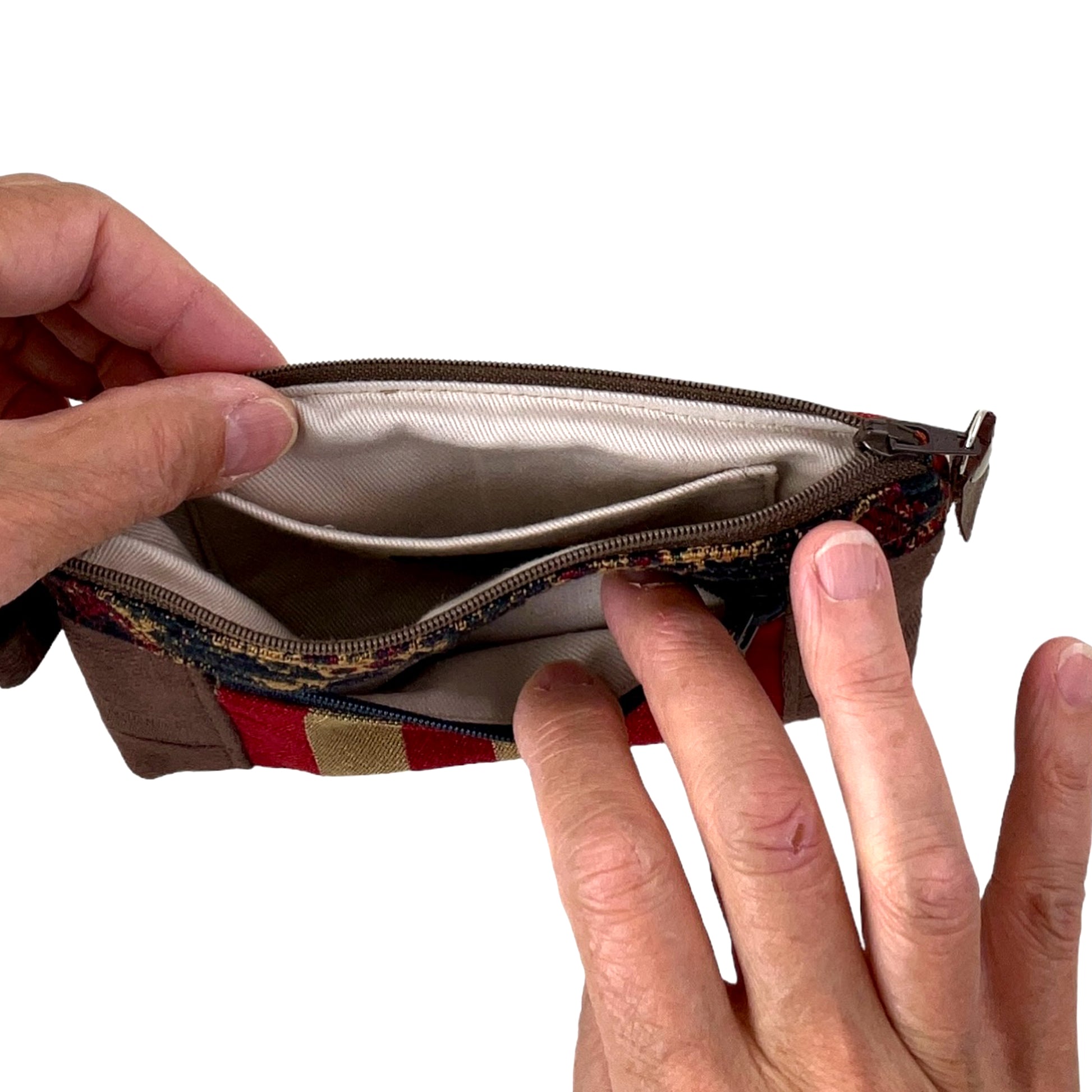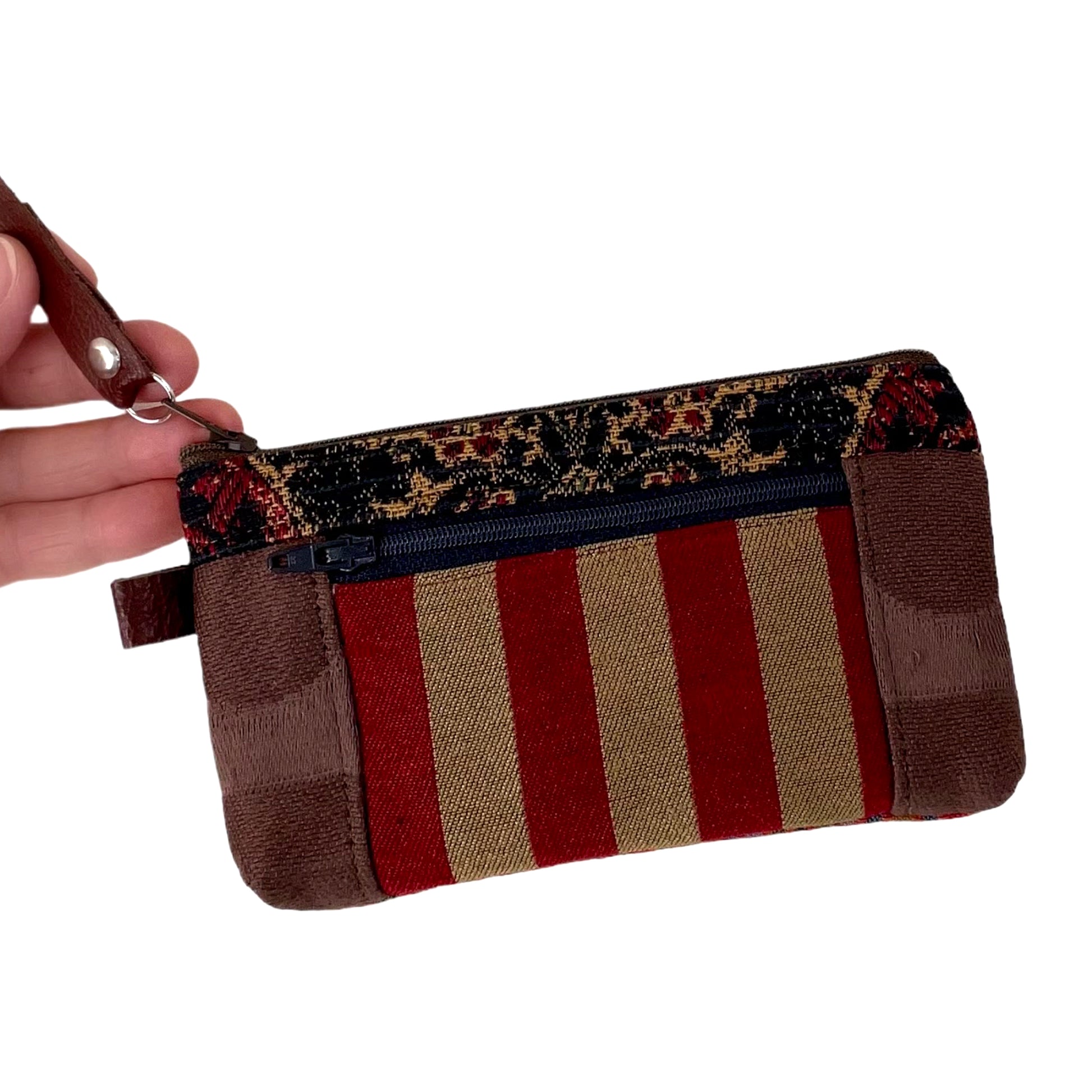 This one of a kind small black red and gold zipper wallet purse has been cut from a selection of exquisite tapestries creating its one of a kind patchwork wallet purse.