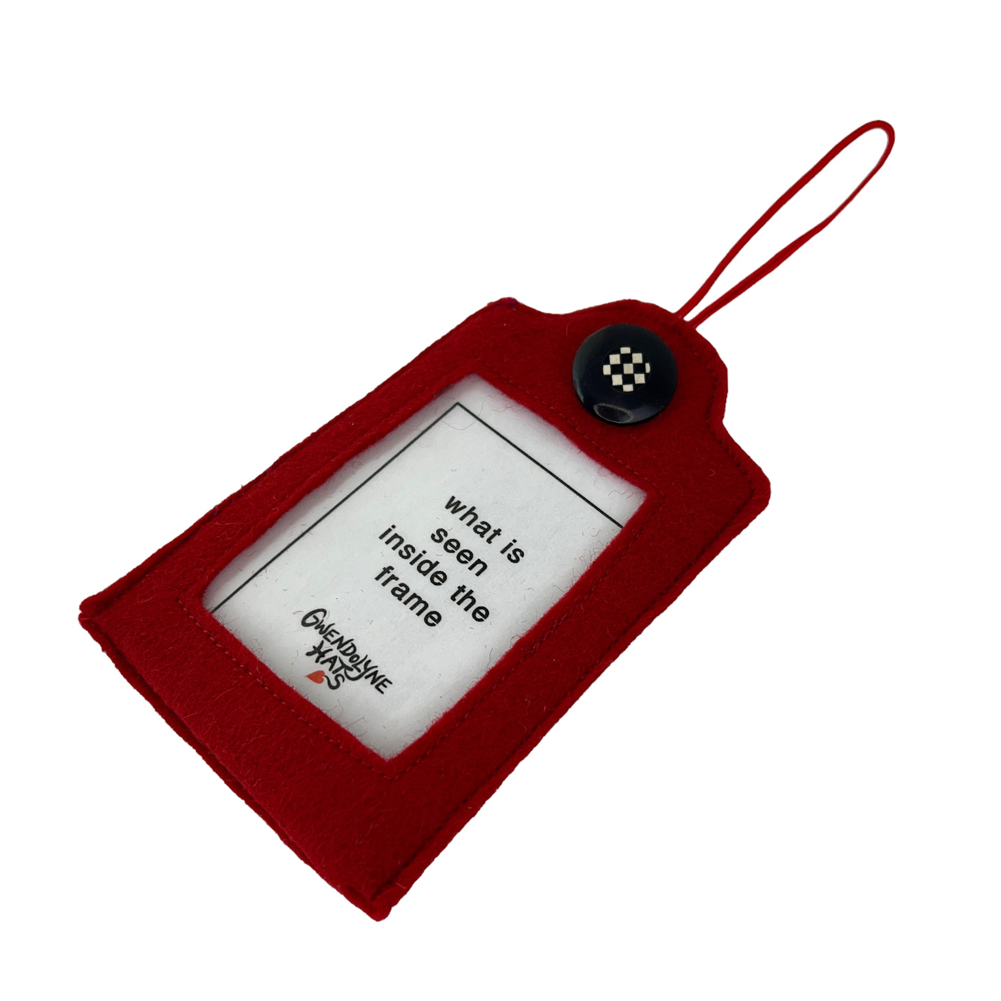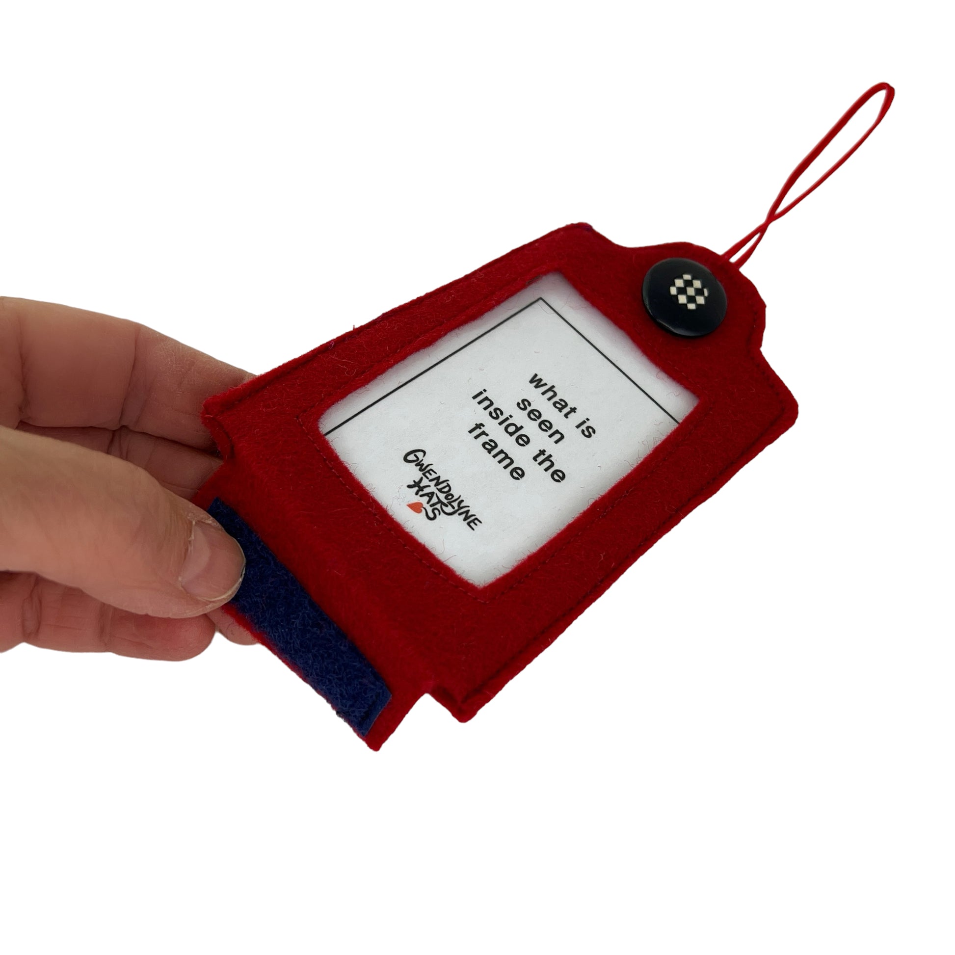 This red frame is made from a sturdy 100% wool felt that is sewn and decorated with a vintage black and white checker button from the 1950s. The laminated card  is the template (2  7/16" wide by 3  10/16") for you to use for trimming the photo is so wish to insert inside. The bottom openings have a Velcro closure to open and close.