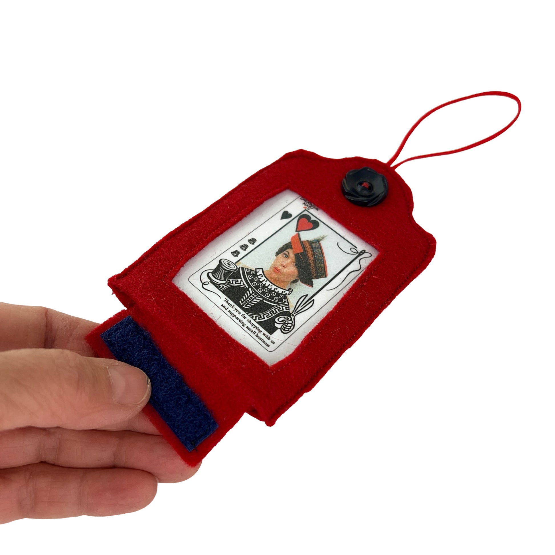 This red felt frame is made from a sturdy 100% wool felt that is sewn and decorated with a vintage black plastic button from the 1950s. The laminated card of the antique button is the template (2  7/16" wide by 3  10/16") for you to use for trimming the photo is so wish to insert inside. The bottom openings have a Velcro closure to open and close.