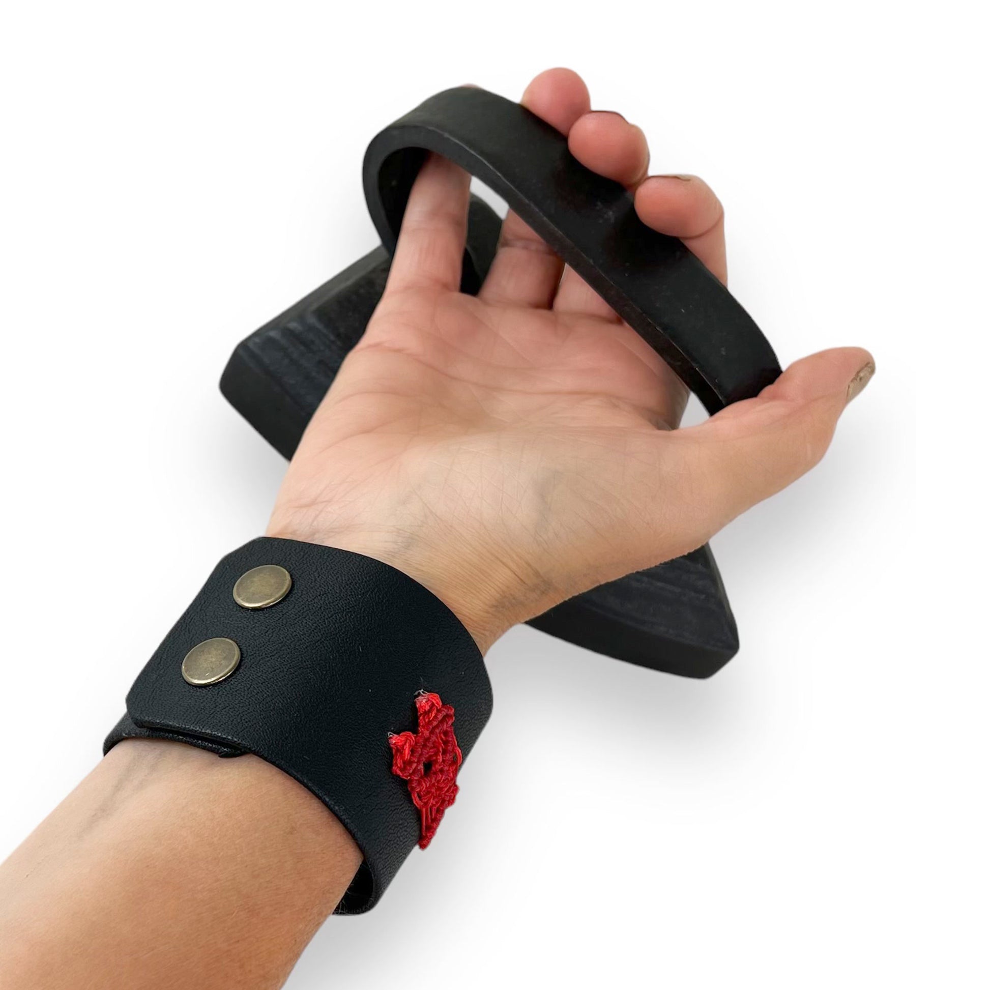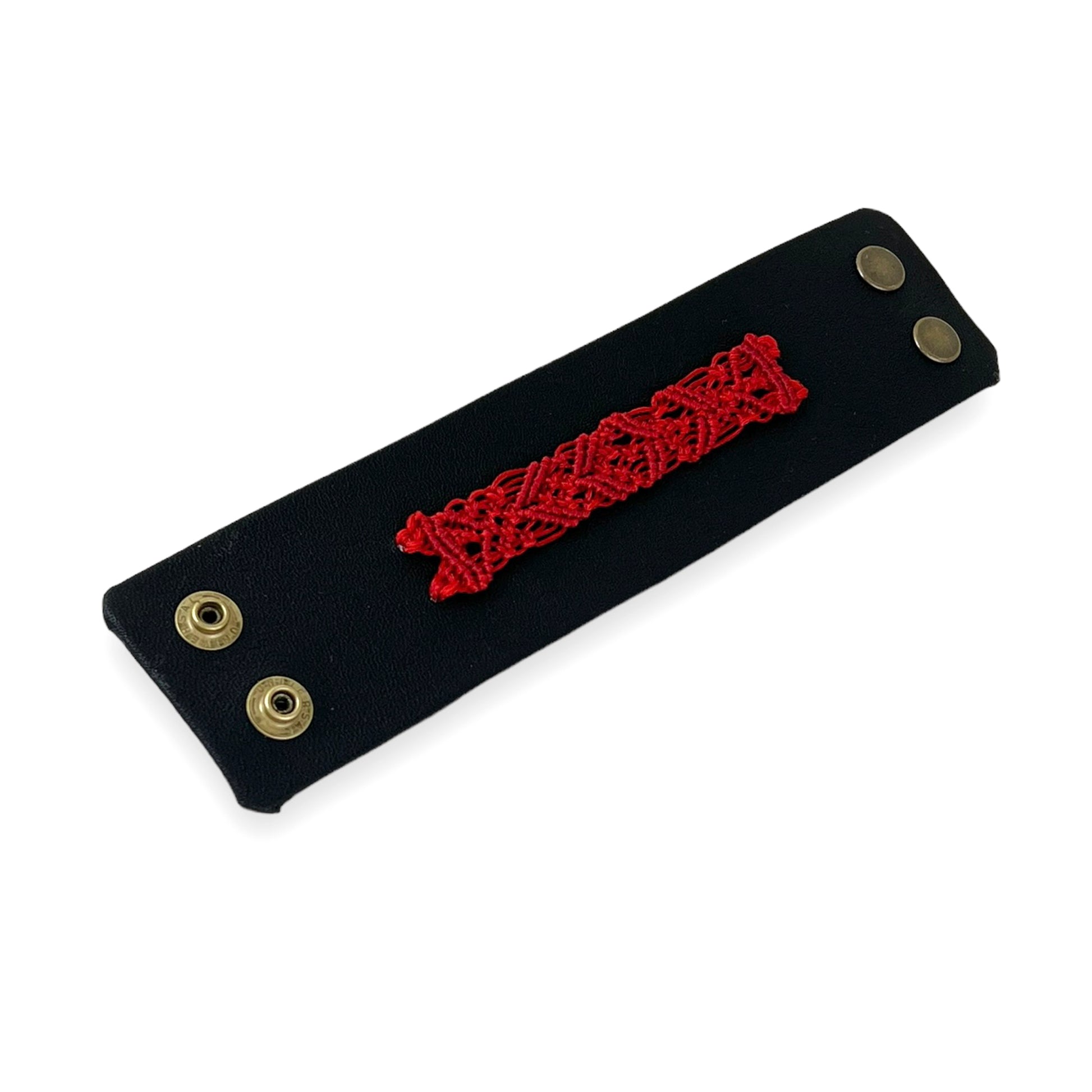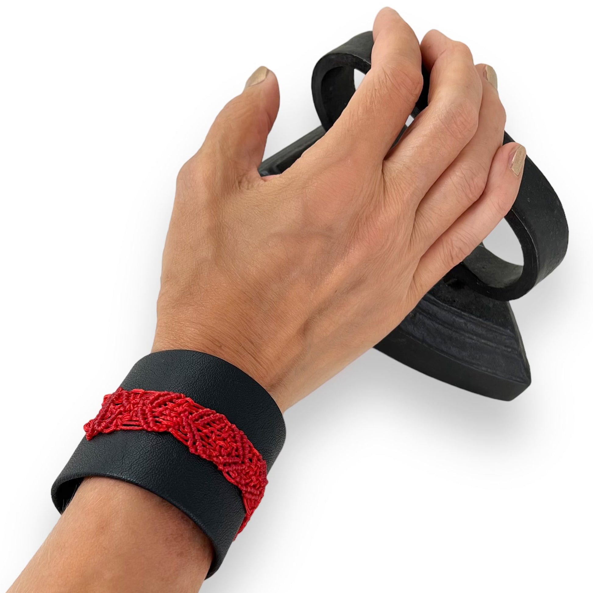 Red Macrame Black Leather Wrist Cuff Bracelet Size 3
