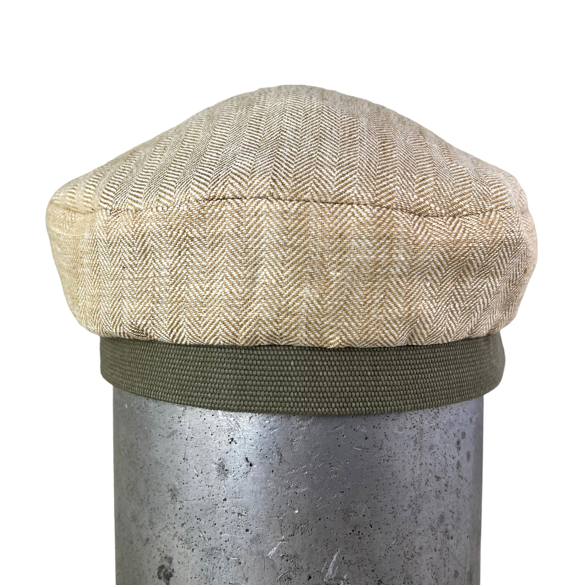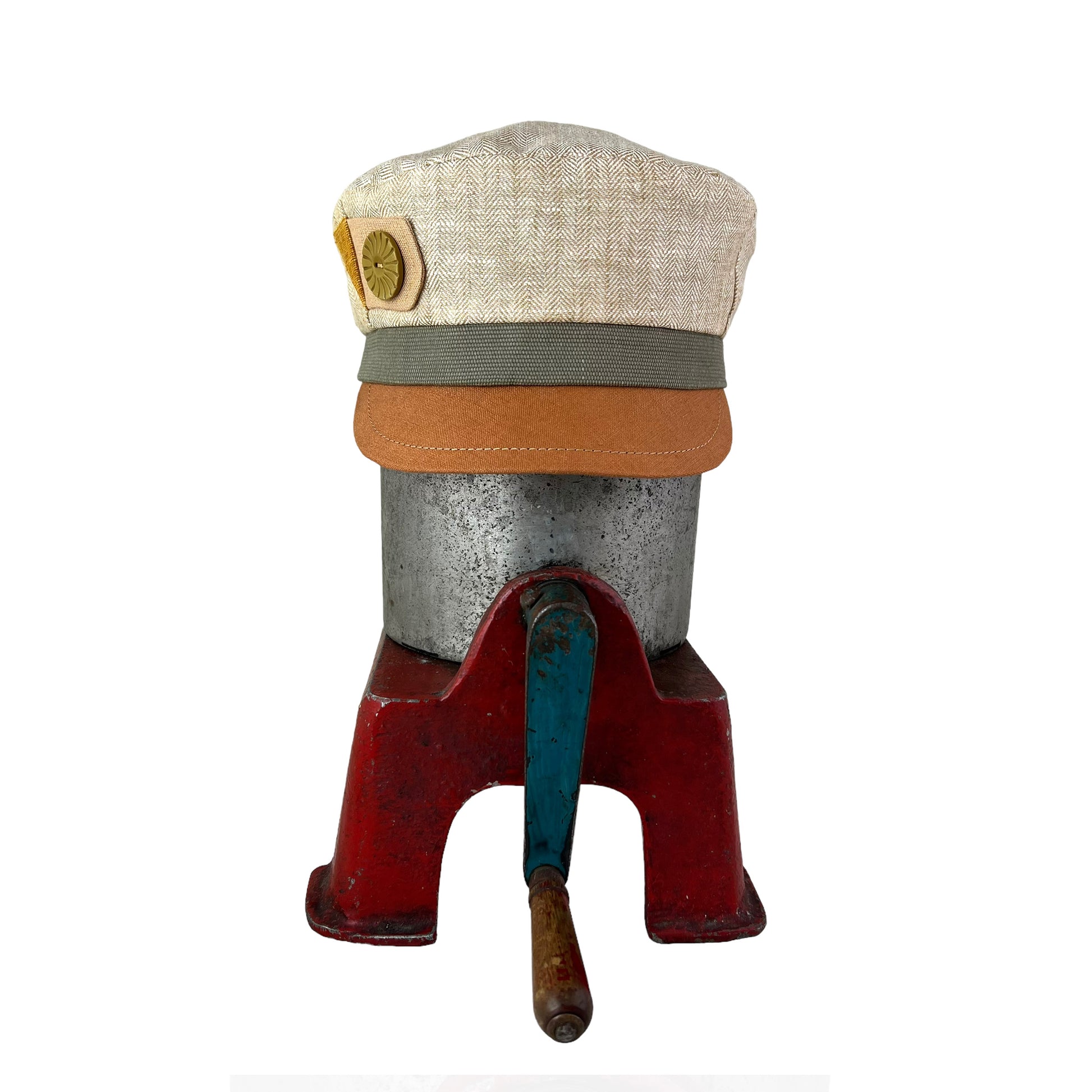 The outside of this large cap has been hand cut from a wheat herringbone linen weave. The olive green band is made from a strong basket weave cotton. The pumpkin linen peak is made from a sturdy flexible leather board which I top stitch on my leather machine. The cap is embellished with a 1920s cream pressed button strap detail.