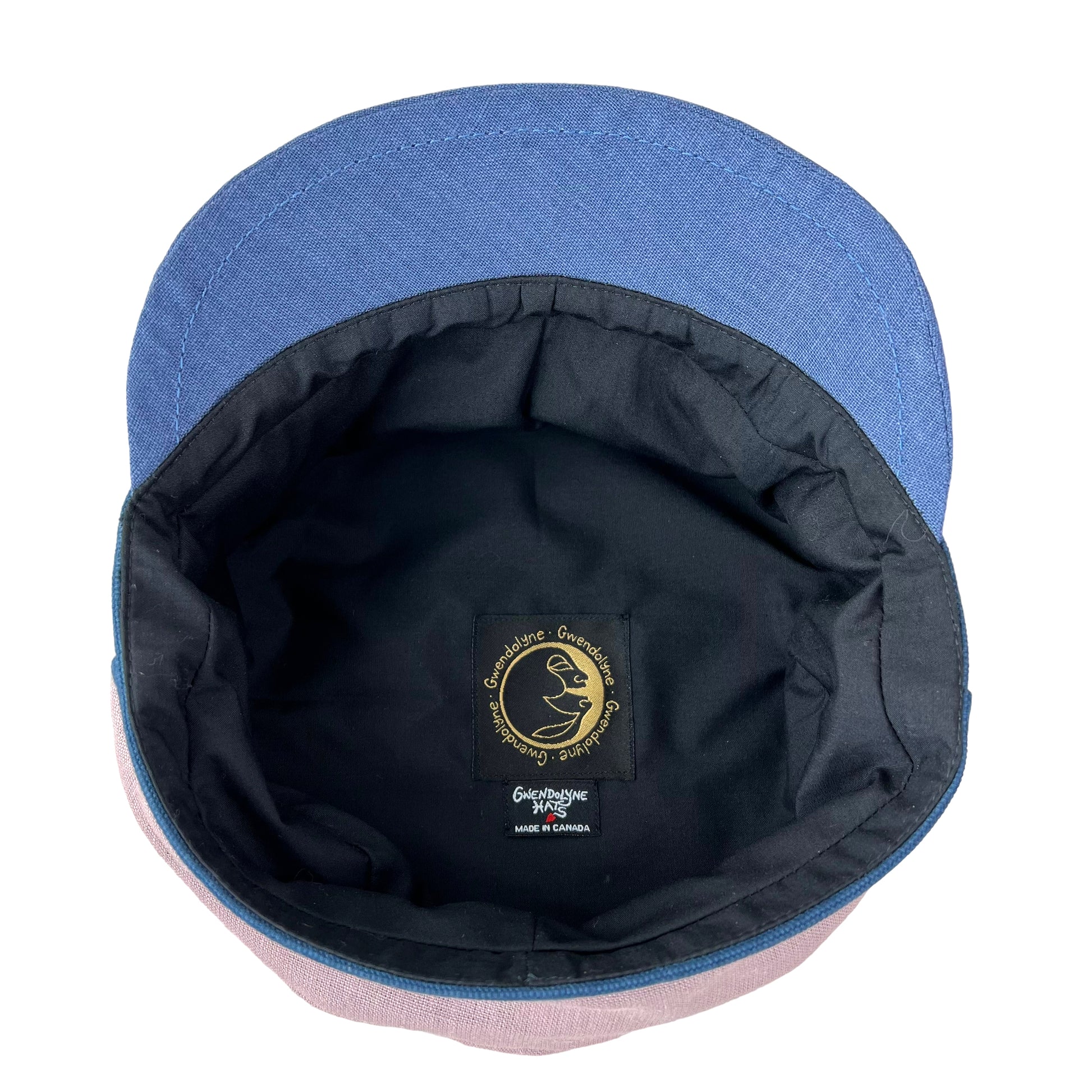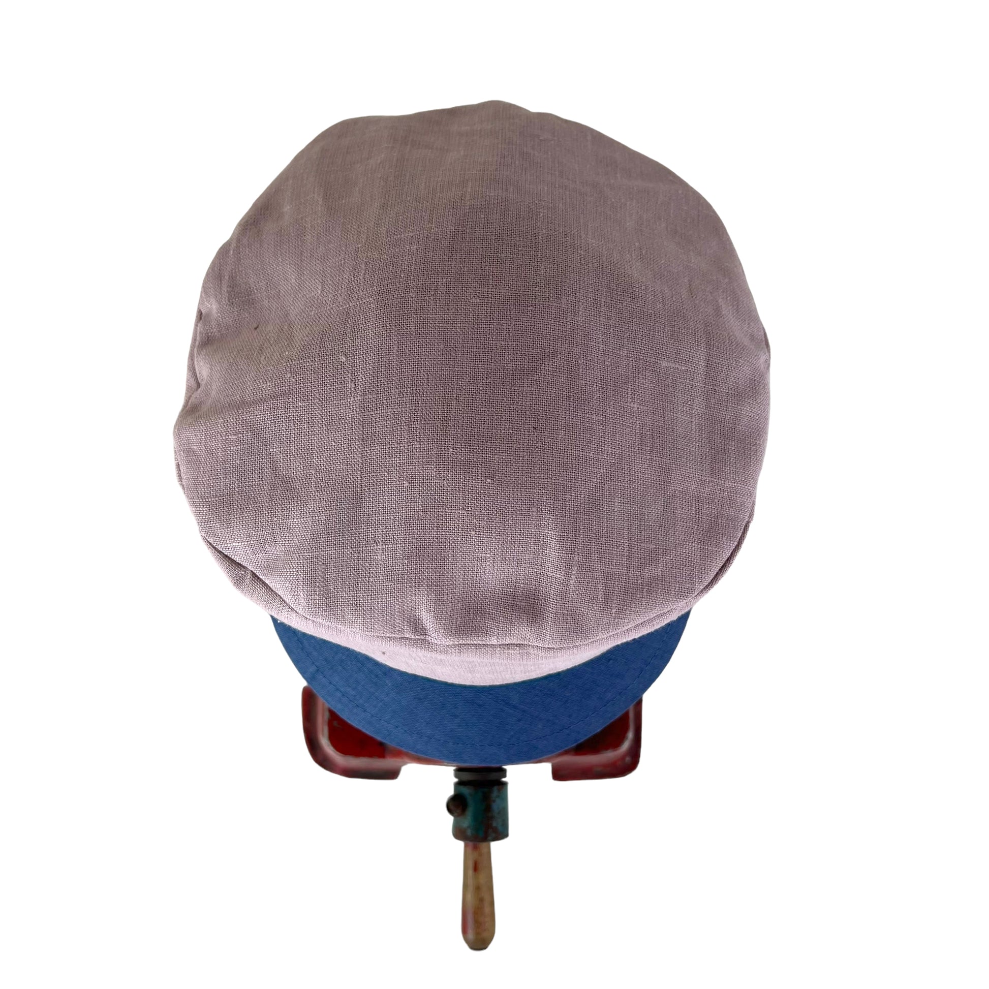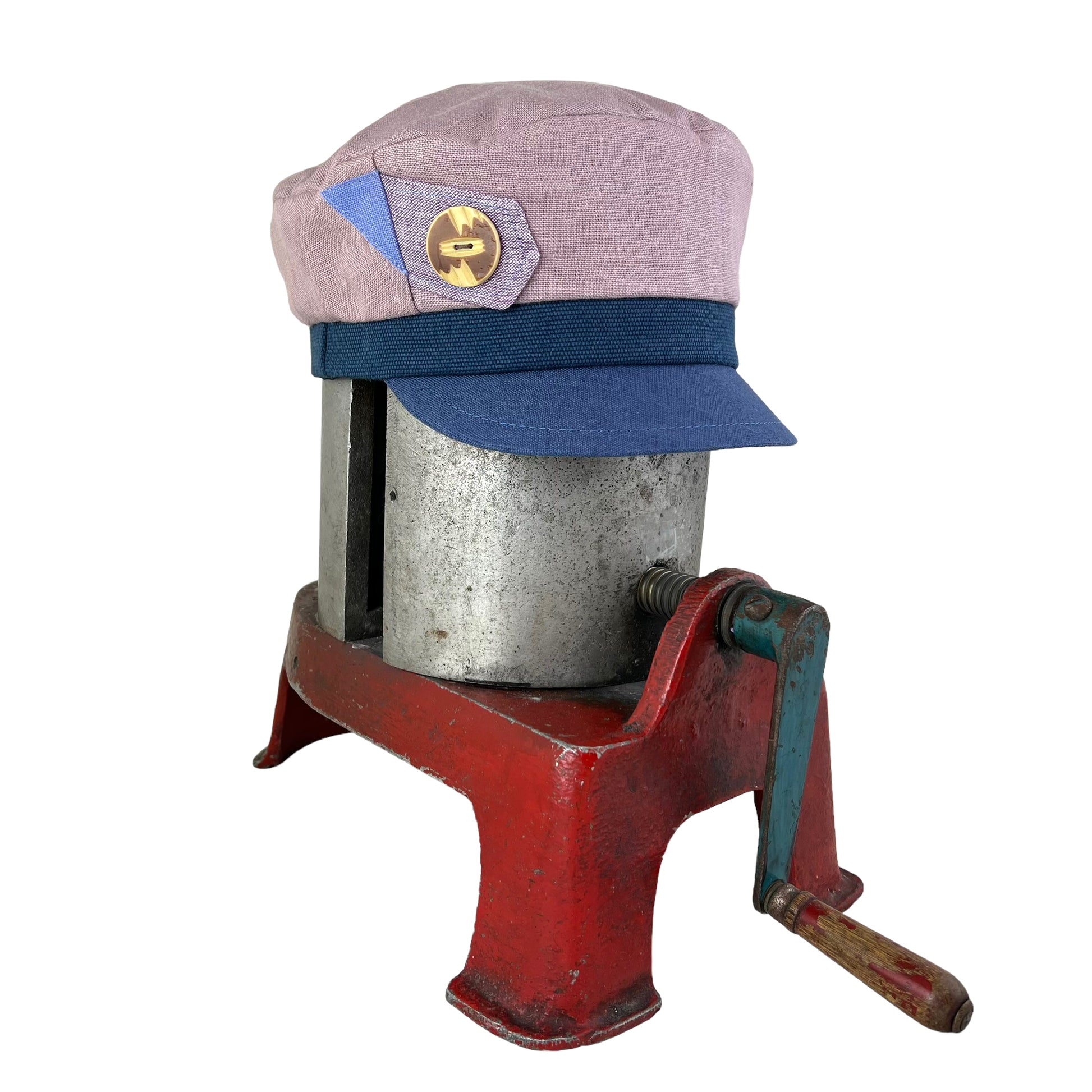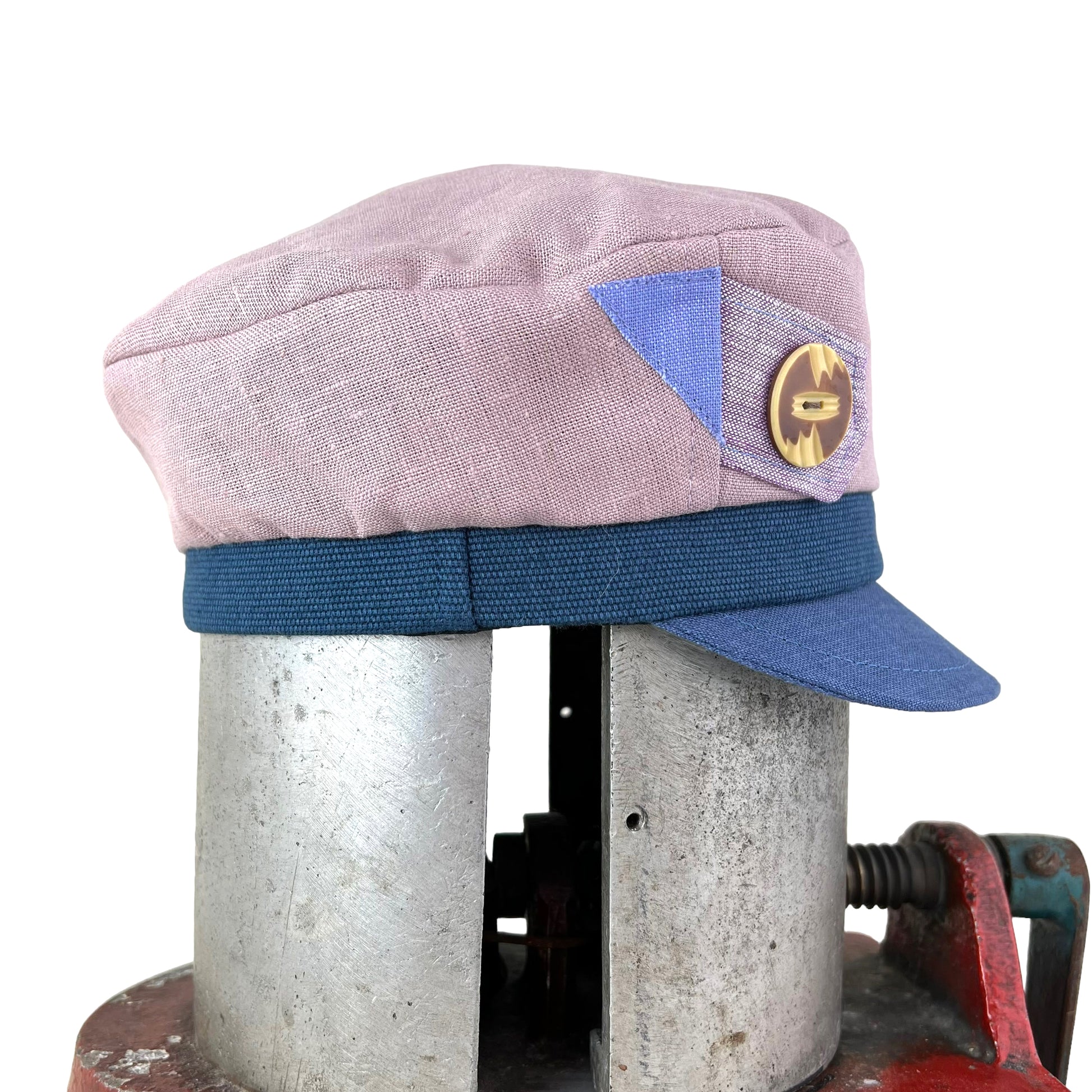 The outside of this medium size cap has been hand cut from a dusty pink linen weave. The navy blue band is made from a strong basket weave cotton. The denim linen peak is made from a sturdy flexible leather board which I top stitch on my leather machine. The cap is embellished with a 1920s clay brown ivory carved button strap detail.