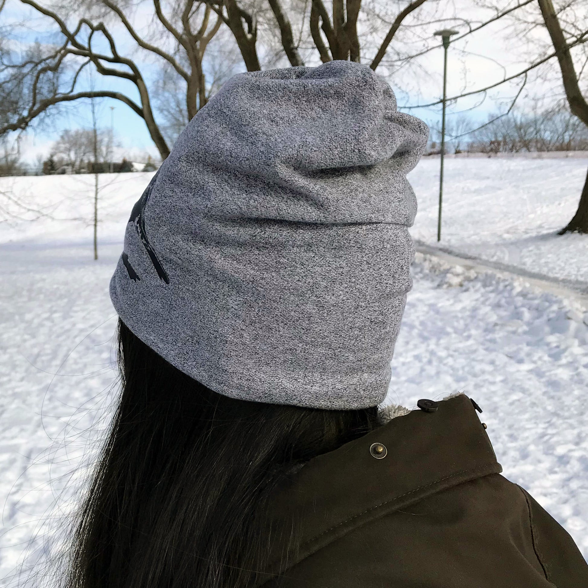 This double layer heather grey slouchy toque is made from a 100% cotton brushed fleece fabric. I dye the fabric in small batches of three hats. The Robin on a branch was created by me and transferred onto the right side of hat.