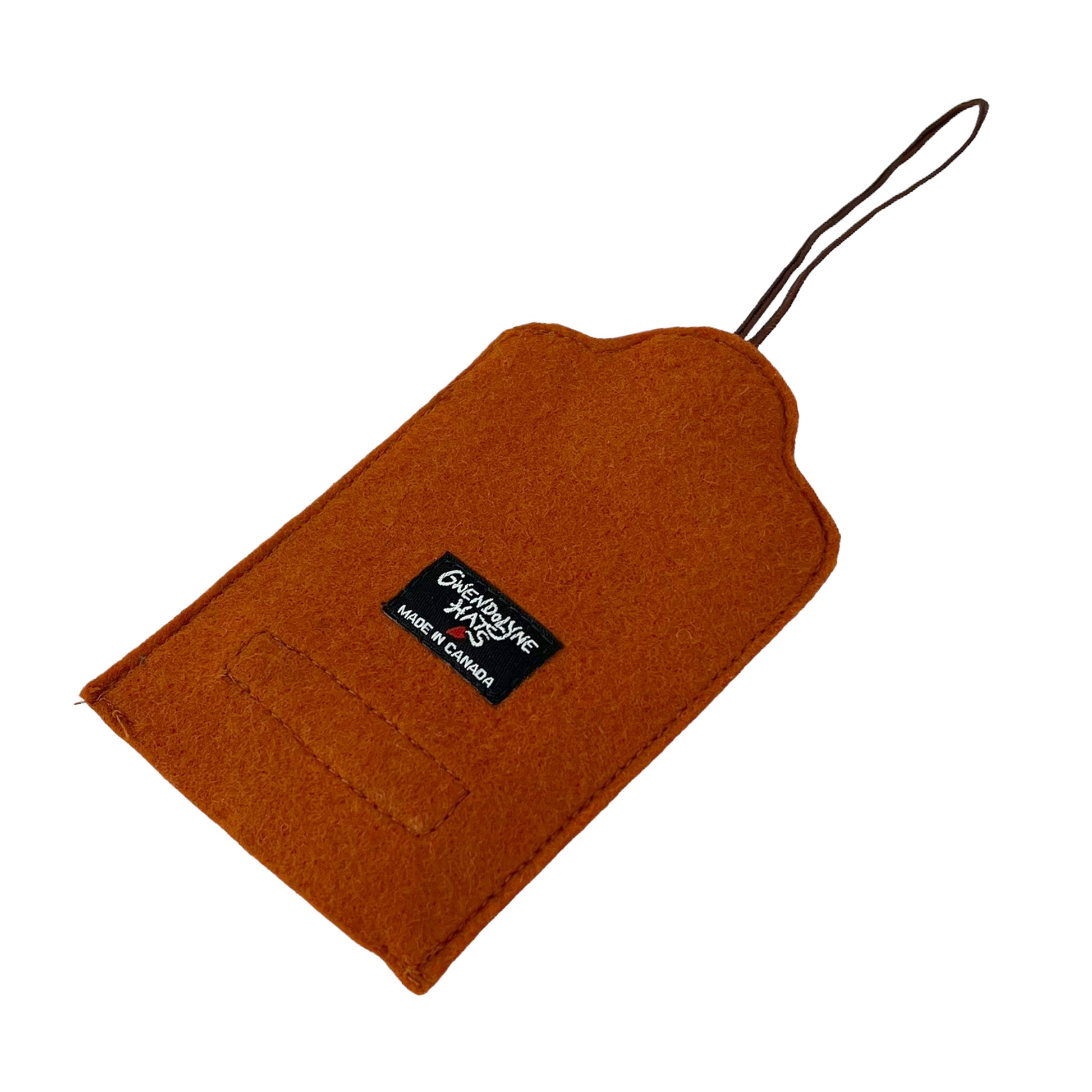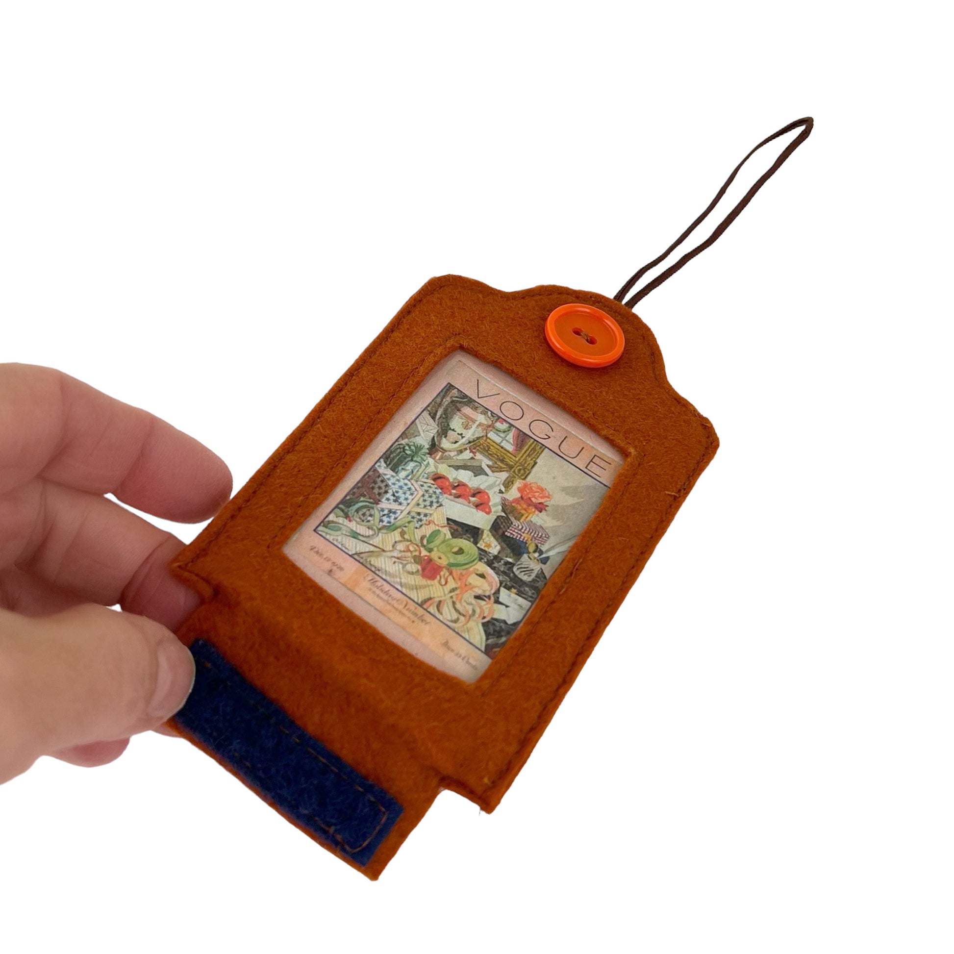 This rust frame is made from a sturdy 100% wool felt that is sewn and decorated with a vintage orange button from the 1950s. The laminated card  is the template (2  7/16" wide by 3  10/16") for you to use for trimming the photo is so wish to insert inside. The bottom openings have a Velcro closure to open and close.
