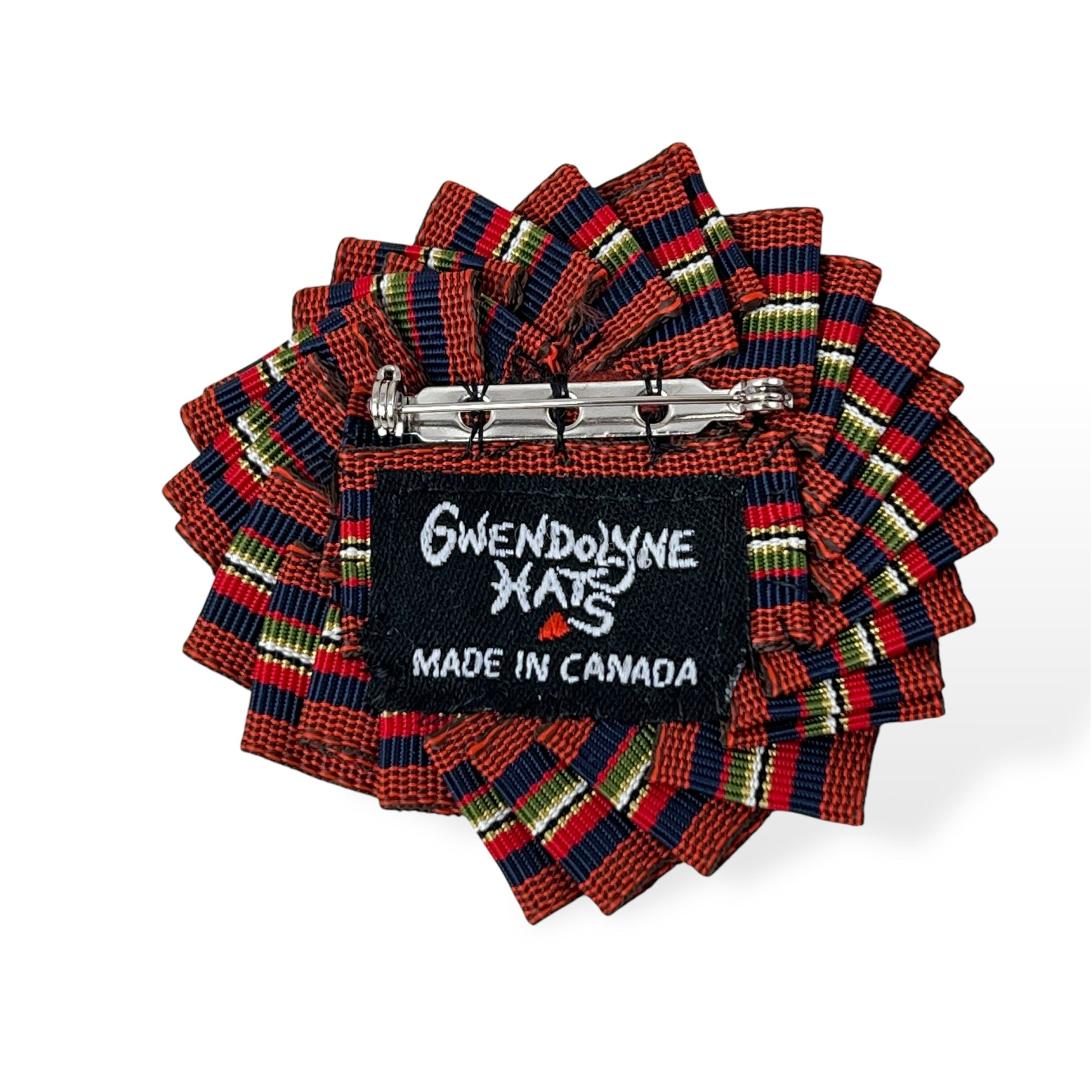 I personally love the pinwheel effect with a ribbon cockade brooch. This multicoloured 2 1/4" wide brooch is totally hand sewn and embellished with an antique metal button from the 1930s. The metal lock pin back is 1 1/4” wide.