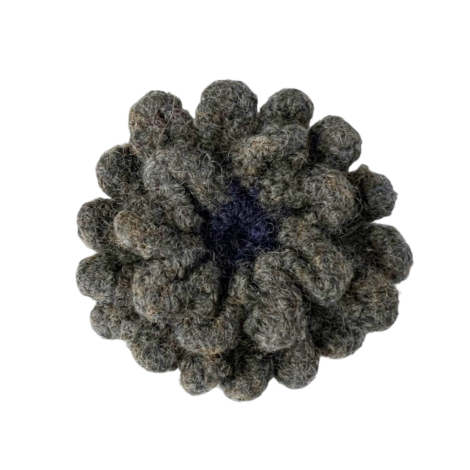 This felted crocheted wool flower brooch was made for a cozy looking winter detail to ones hats or coat. Hand crocheted with pure wool and then felted it measures just under 3". Hand sewn brass 1" wide pin on the back with lock closure.