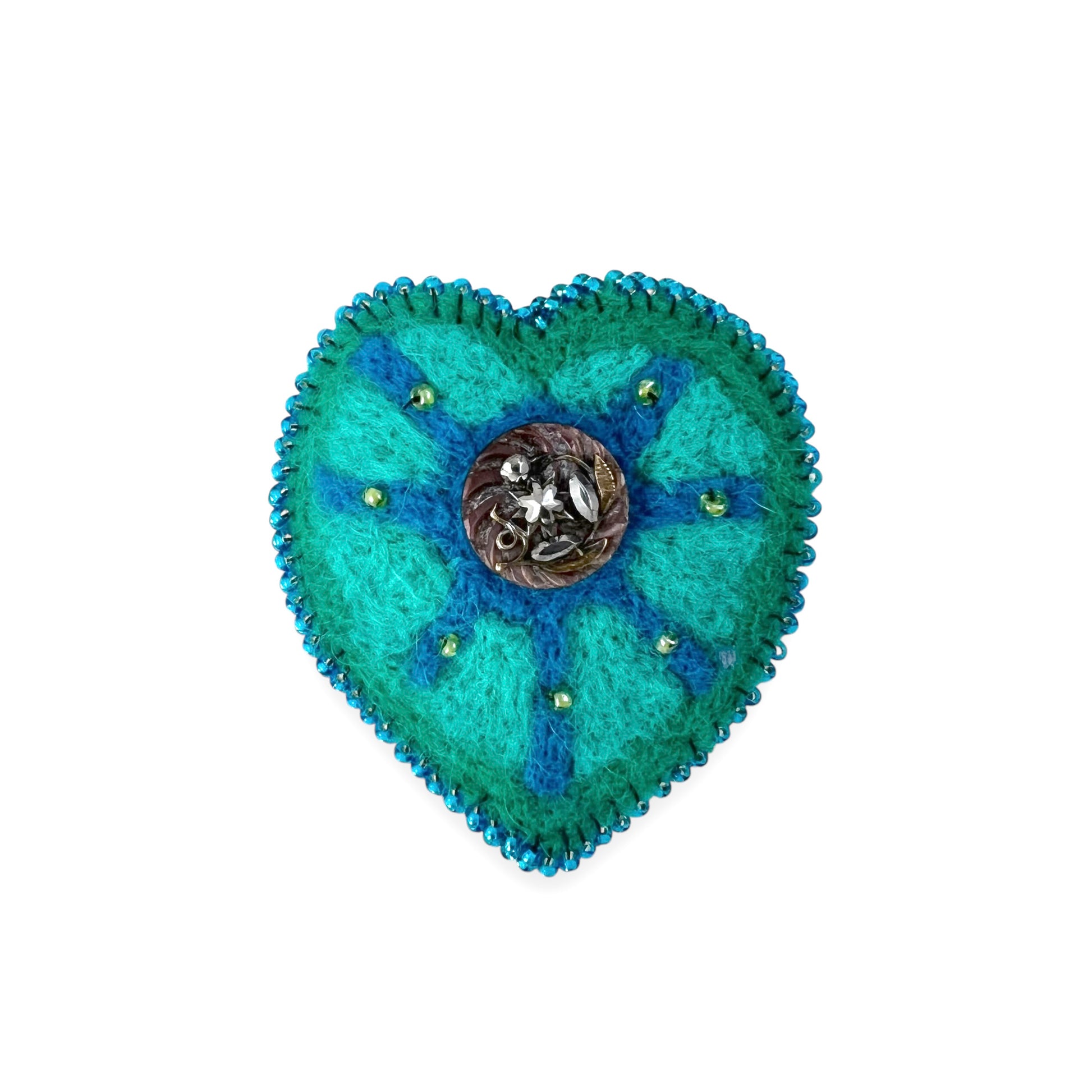 This sea foam green and blue heart felted pin is the tenth brooch I created, edition #10.