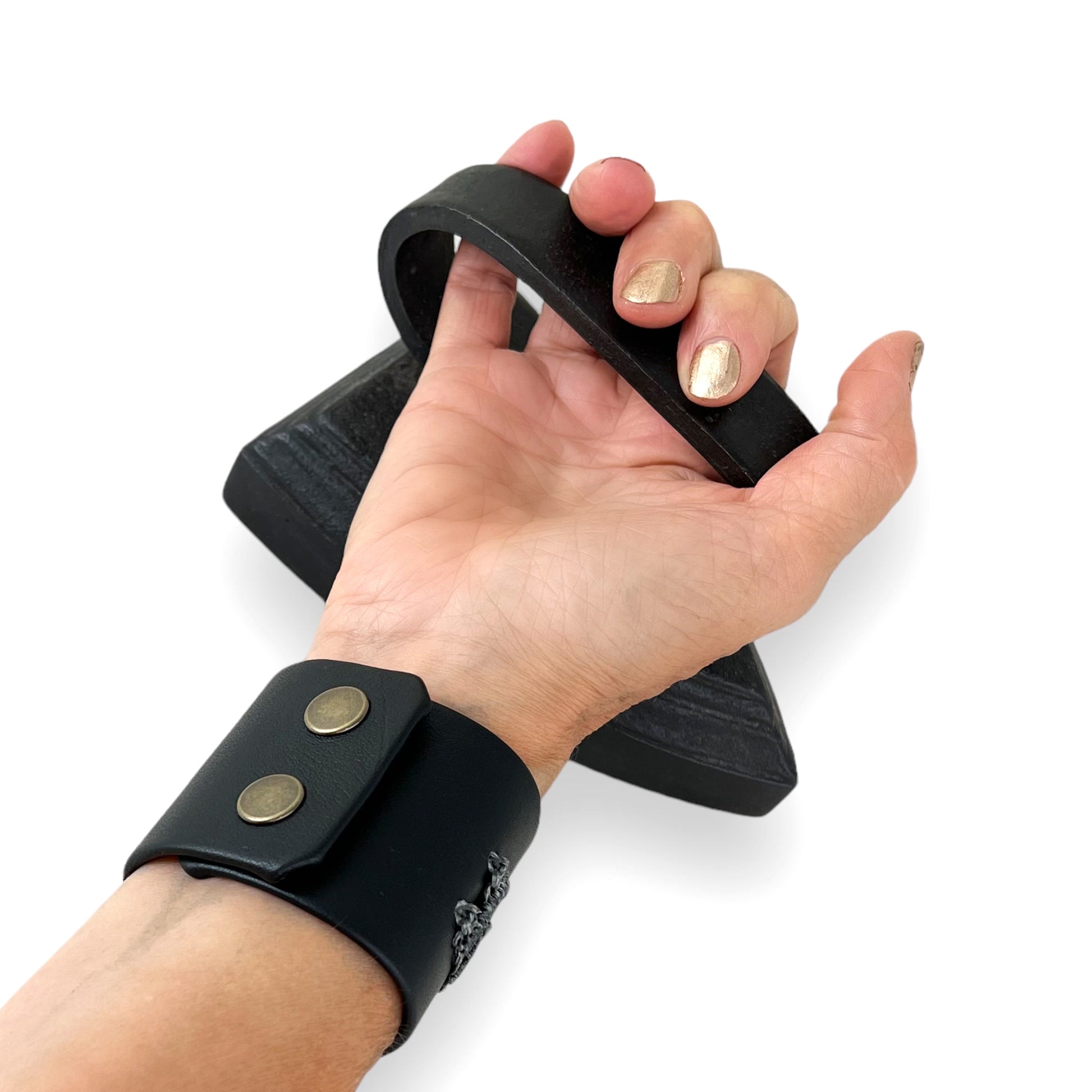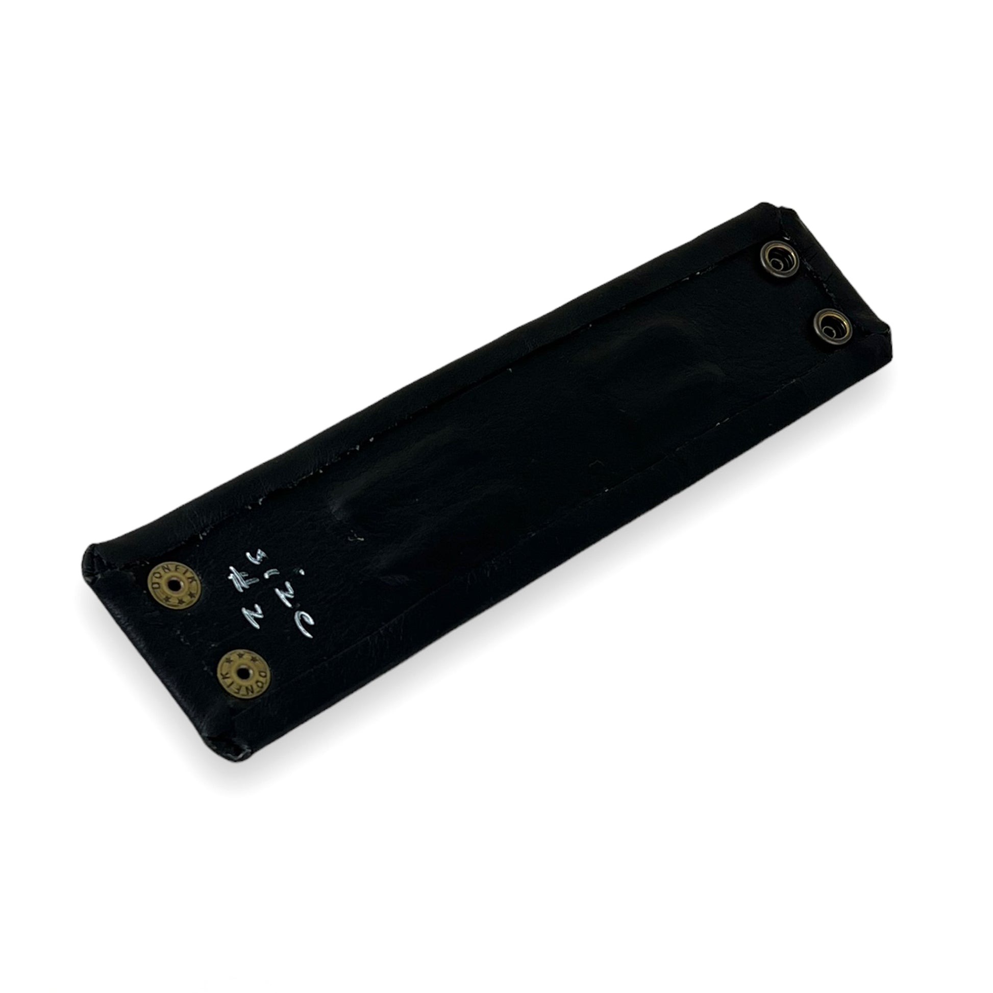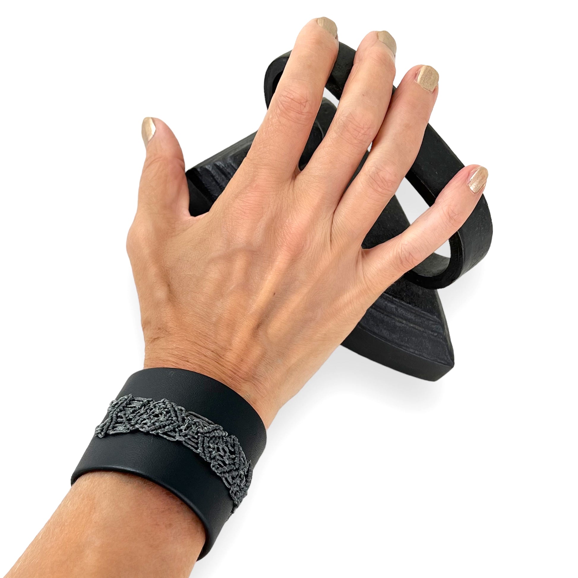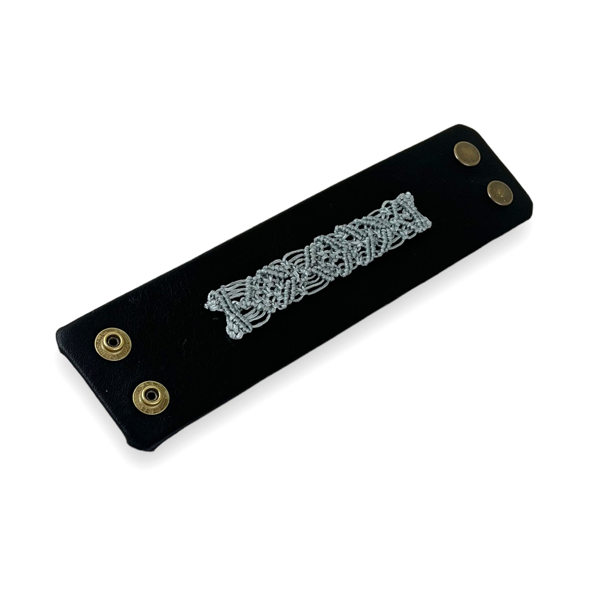 My process begins with creating a unique hand macrame work from waxed linen. Once completed I mount this work on a durable infrastructure that is covered on the top and bottom with cowhide leather. The cuff is 2 inches wide.