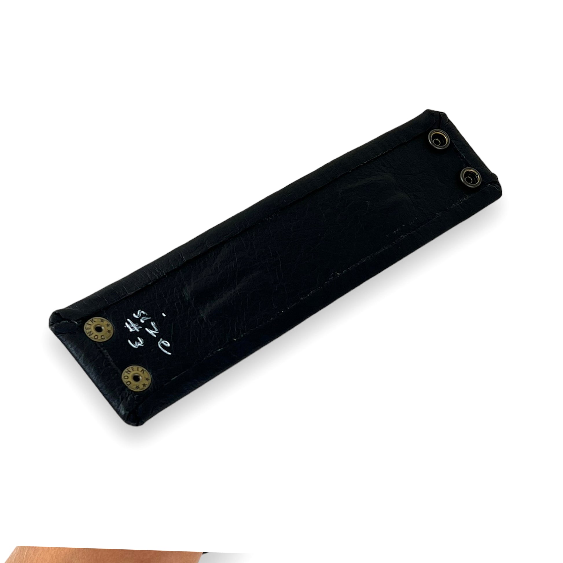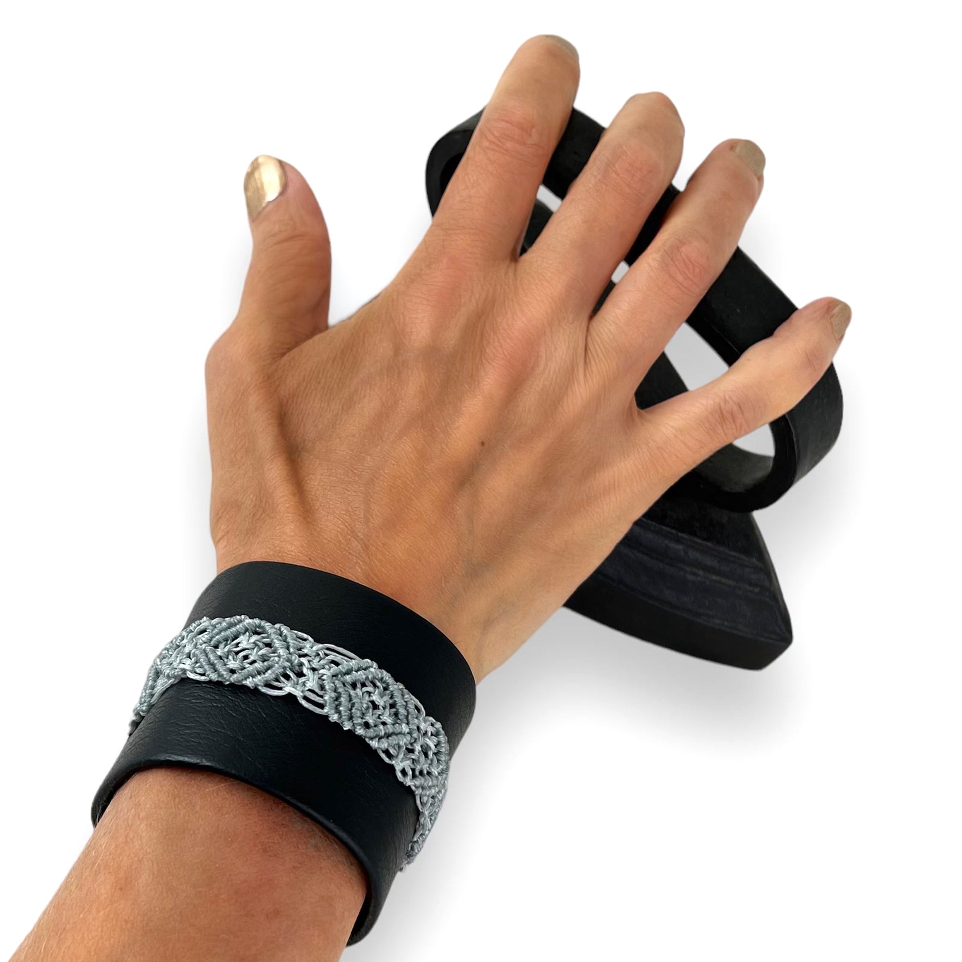 Silver Macrame Black Leather Wrist Cuff Bracelet Size 3