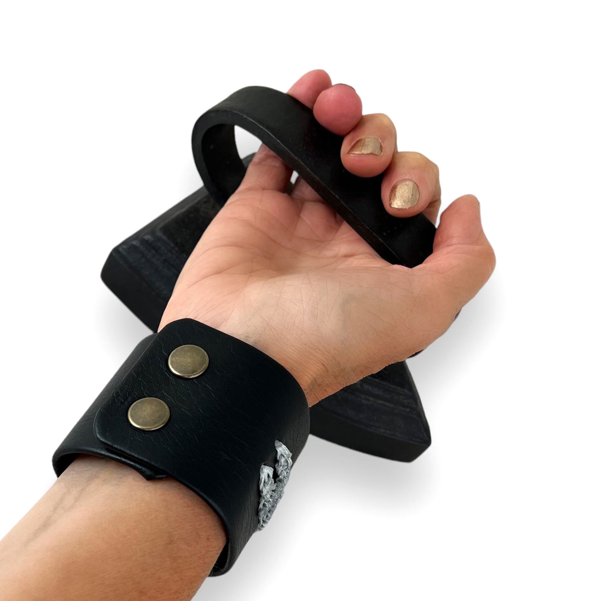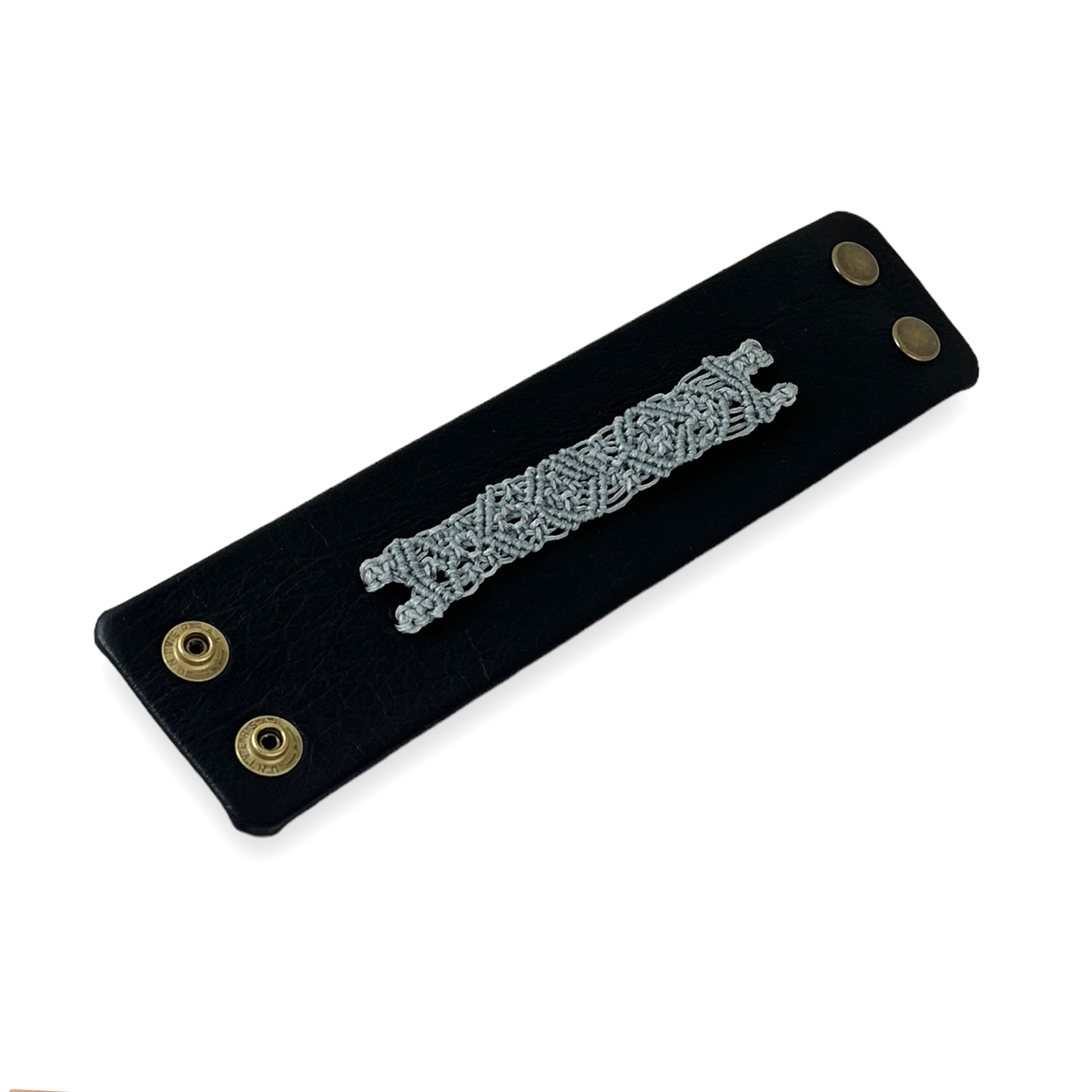 My process begins with creating a unique hand macrame work from waxed linen. Once completed I mount this work on a durable infrastructure that is covered on the top and bottom with cowhide leather. The cuff is 2 inches wide.